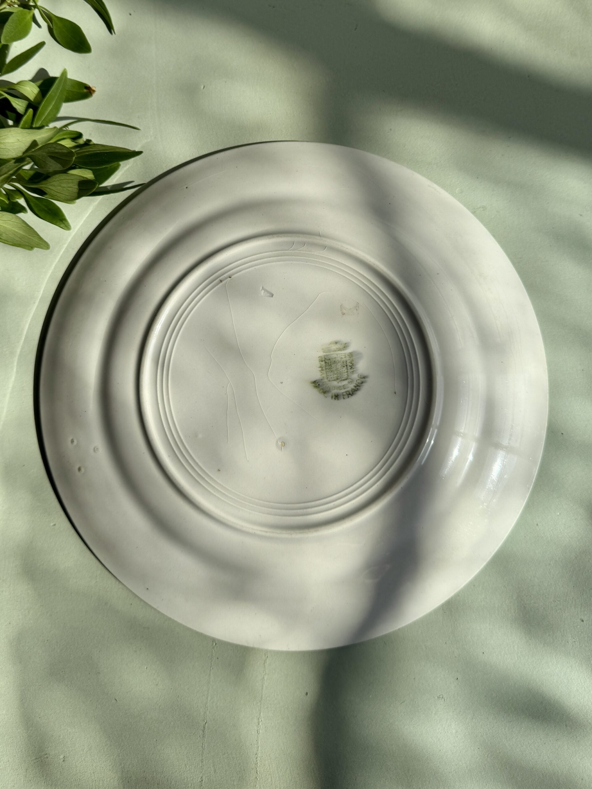 Cette assiette de seconde main présente quelques traces du temps qui n'enlève rien à son charme et la rendent unique.