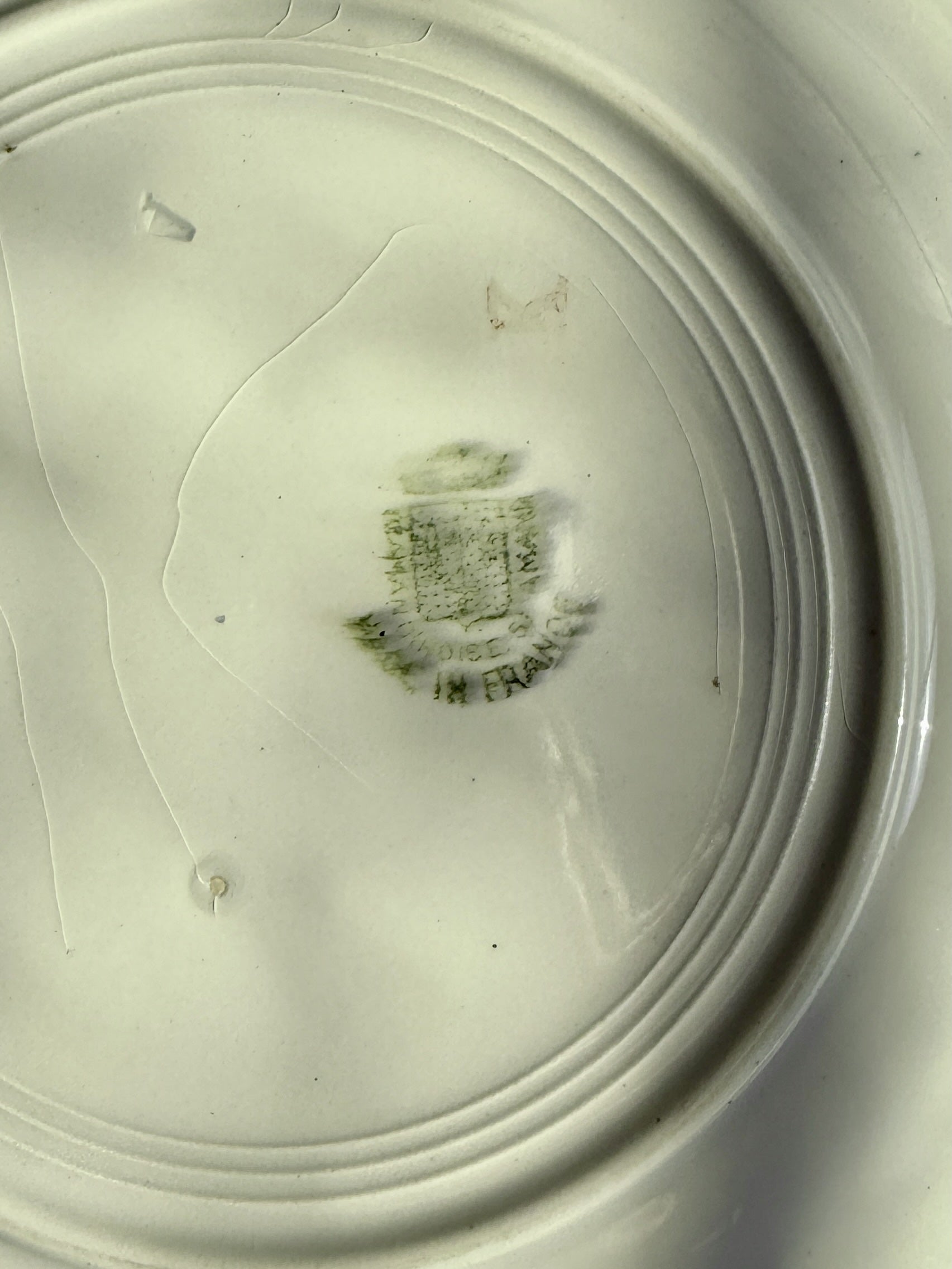 Assiette plate ancienne en faïence de la manufacture Saint-Amand. De couleur blanche, elle est composée d’une frise florale décorative sur le pourtour.