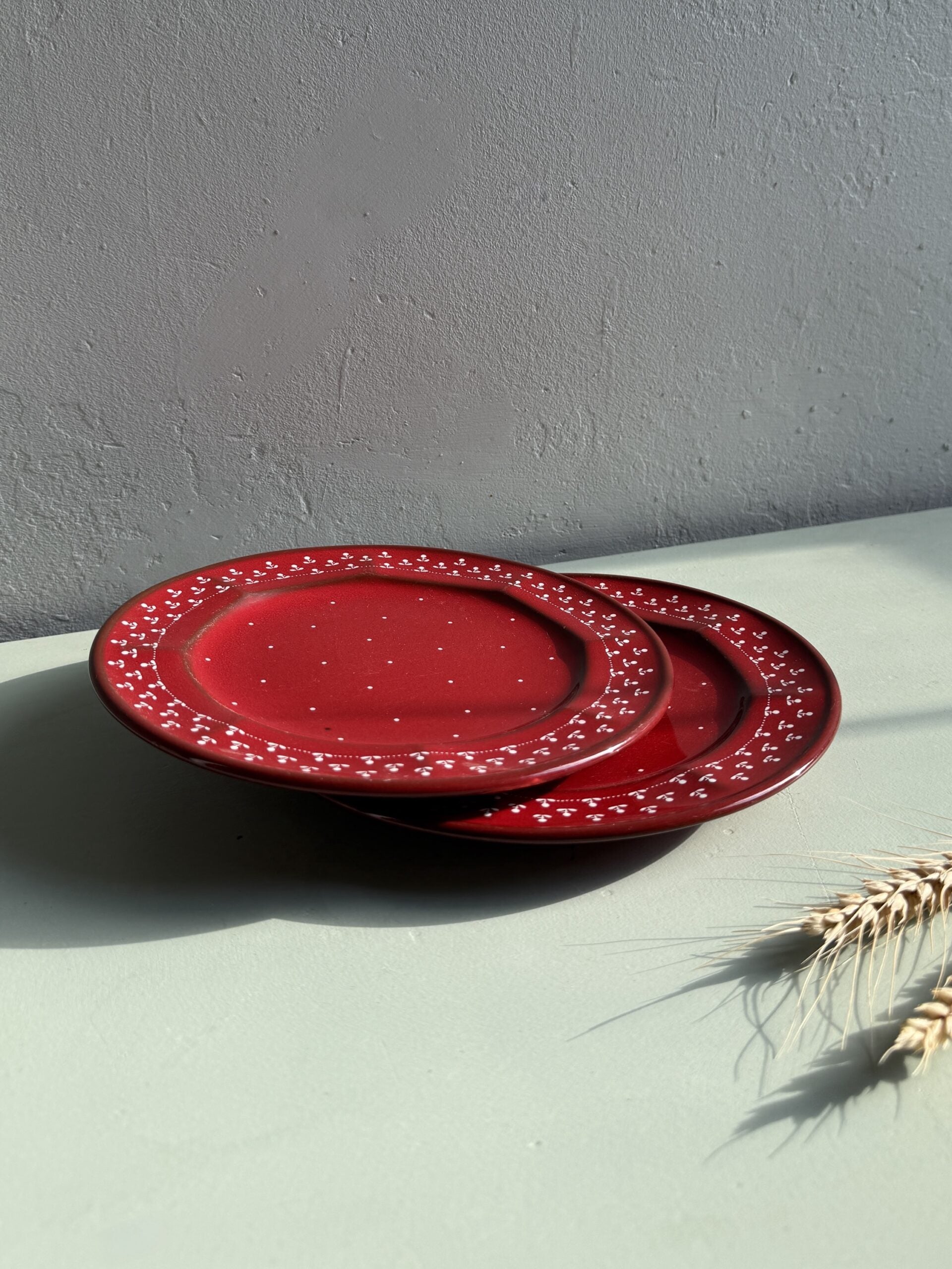 Ensemble de 2 assiettes à dessert en céramique émaillée, de couleur rouge avec motif à pois blancs.