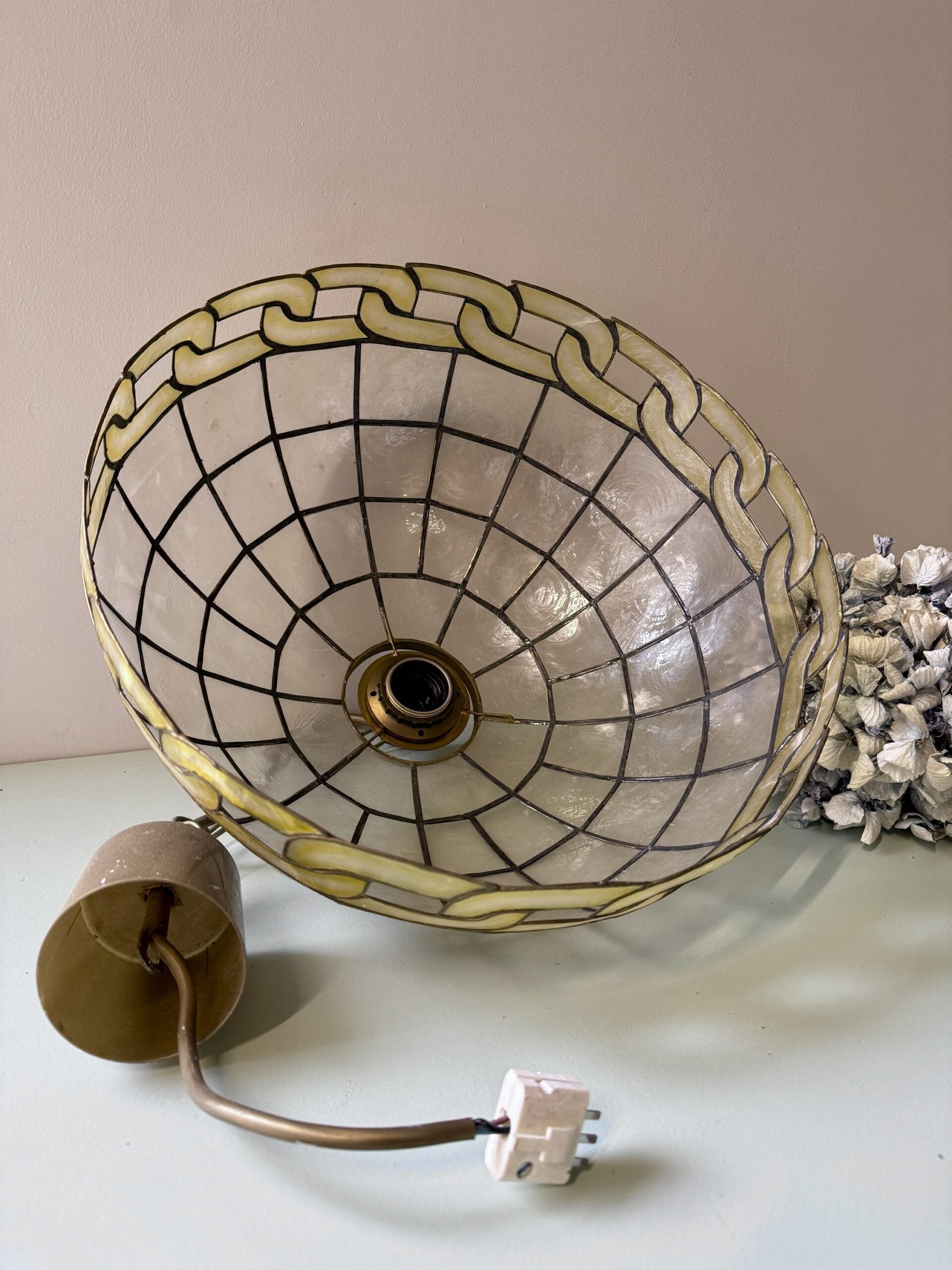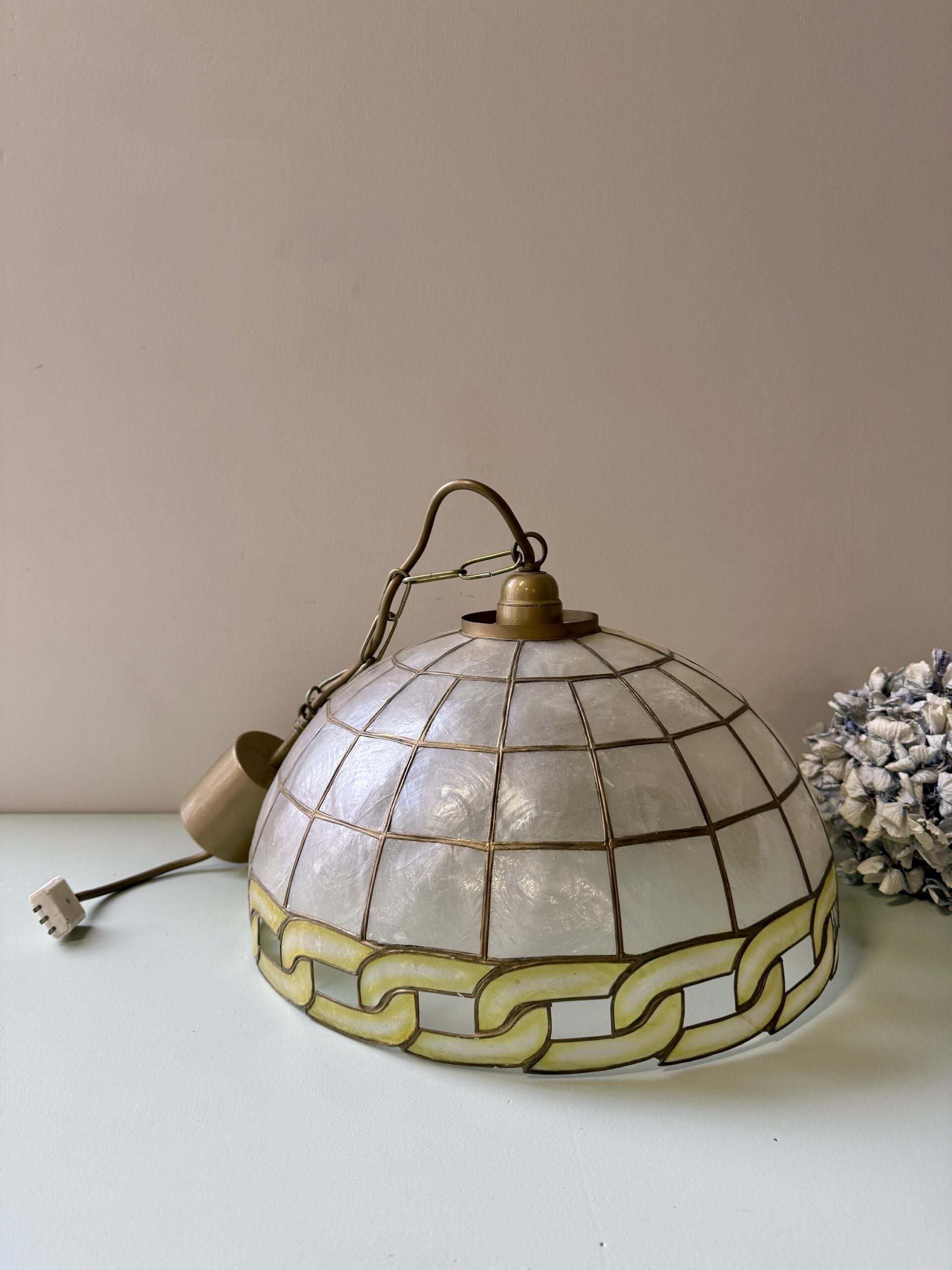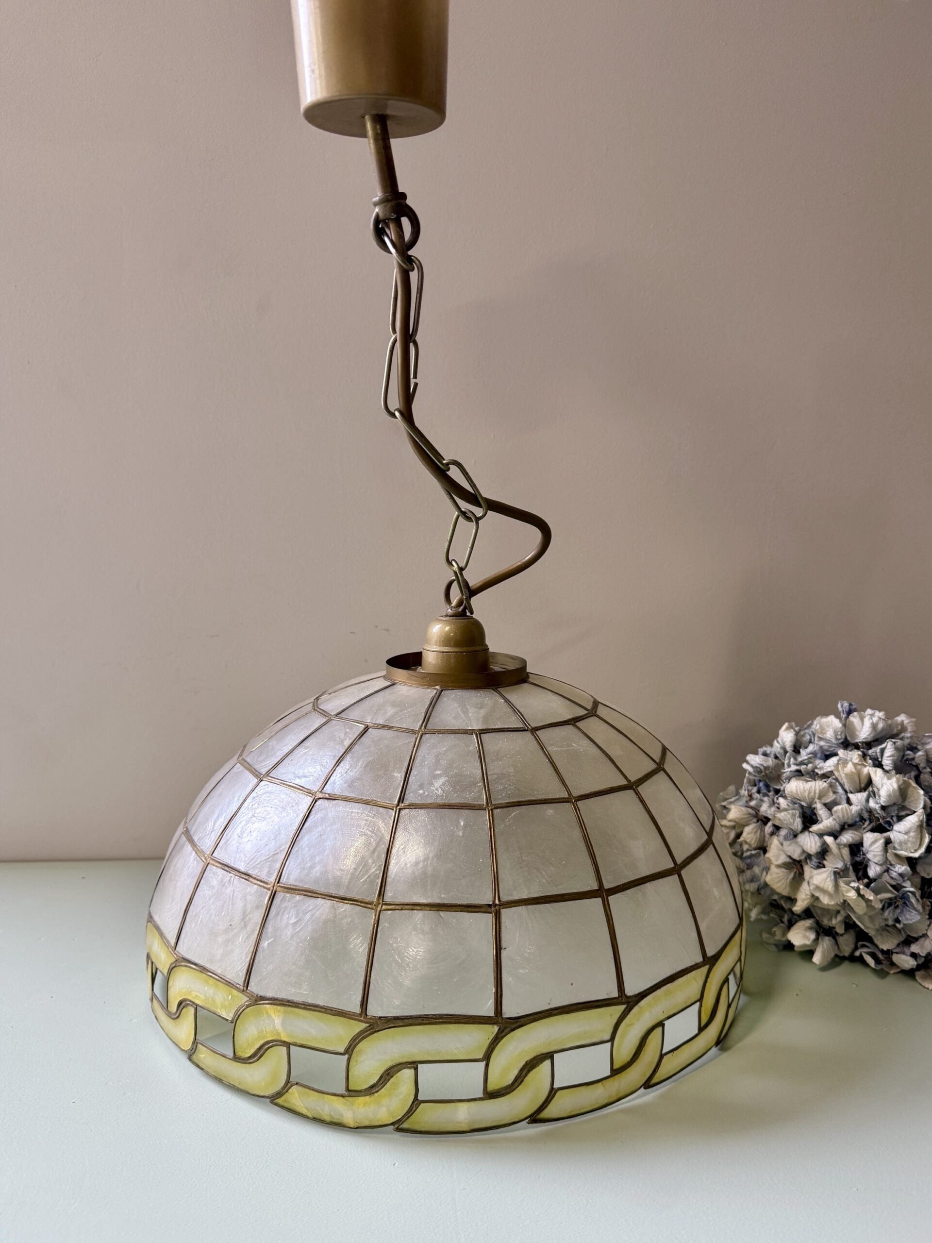 Suspension ancienne en nacre, composée de plaques assemblées dans une structure en métal. La nacre laisse passer une lumière douce, avec de jolis reflets irisés une fois allumée. Le décor géométrique est souligné par une frise jaune sur le pourtour. Un luminaire ancien au rendu chaleureux, idéal au-dessus d’une table, dans une entrée ou une cuisine. Objet de seconde main, avec quelques traces du temps, visibles sur les photos.