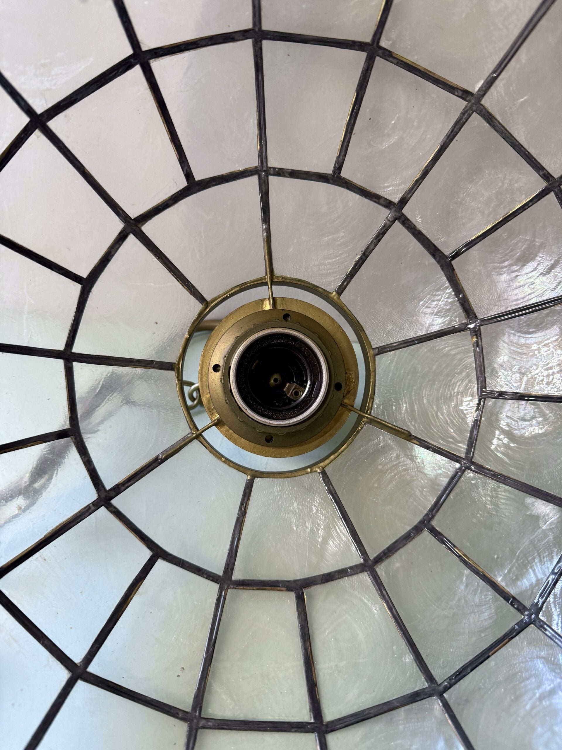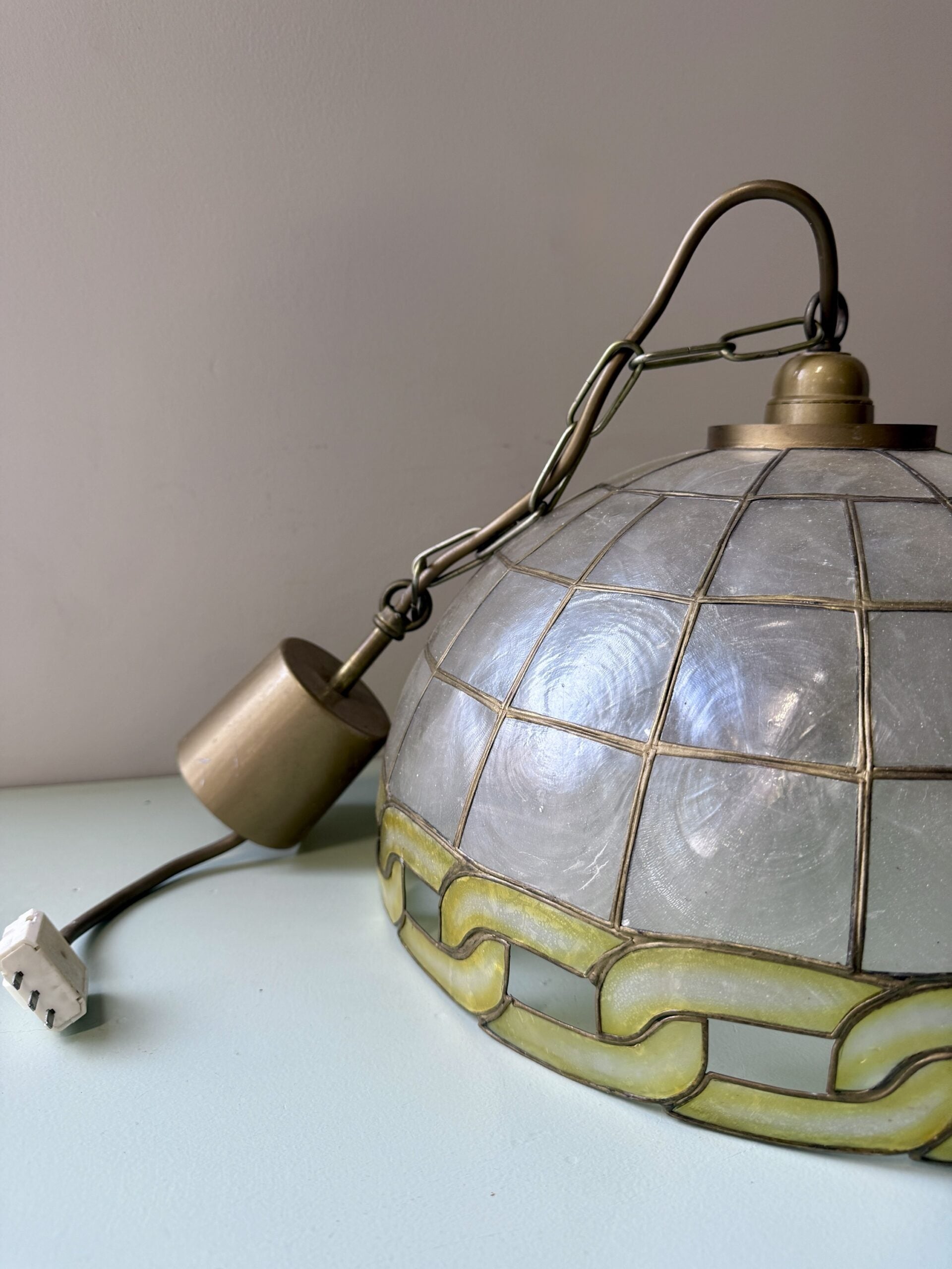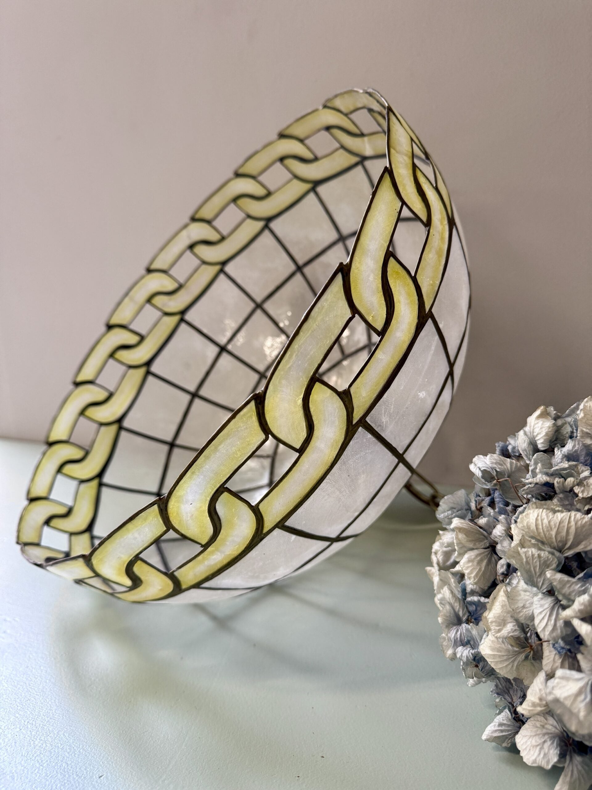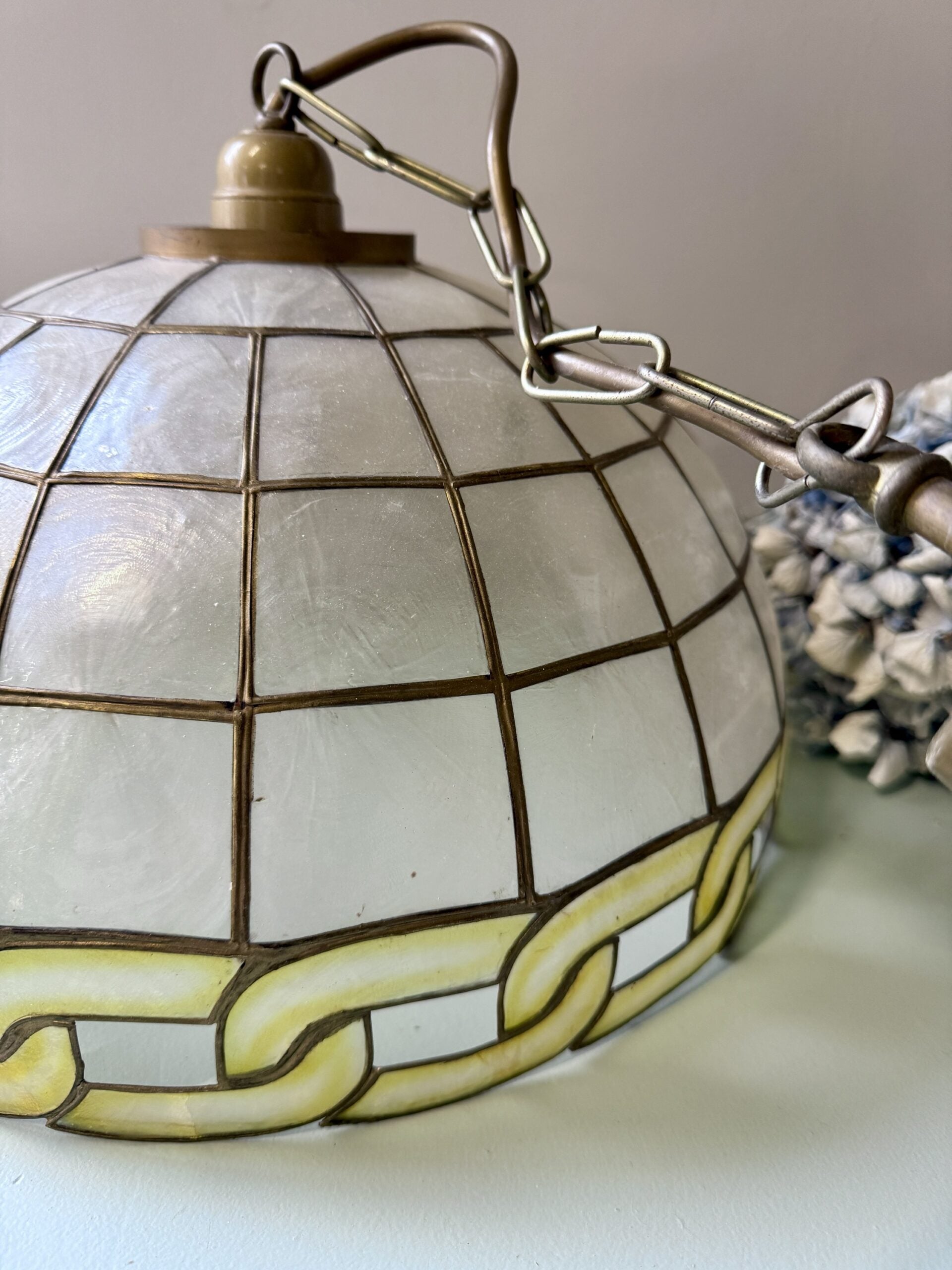 Suspension ancienne en nacre, composée de plaques assemblées dans une structure en métal. La nacre laisse passer une lumière douce, avec de jolis reflets irisés une fois allumée. Le décor géométrique est souligné par une frise jaune sur le pourtour. Un luminaire ancien au rendu chaleureux, idéal au-dessus d’une table, dans une entrée ou une cuisine. Objet de seconde main, avec quelques traces du temps, visibles sur les photos.