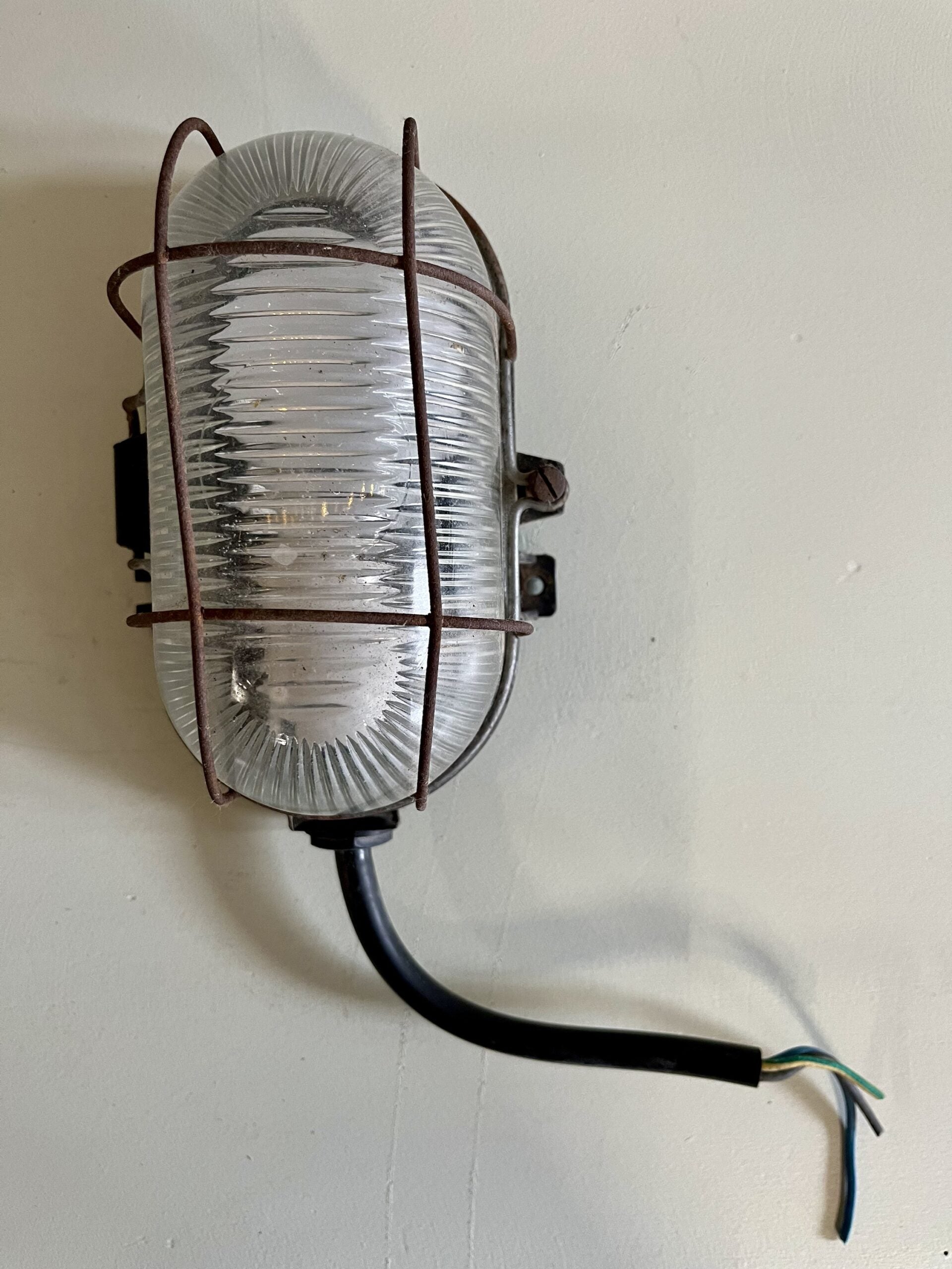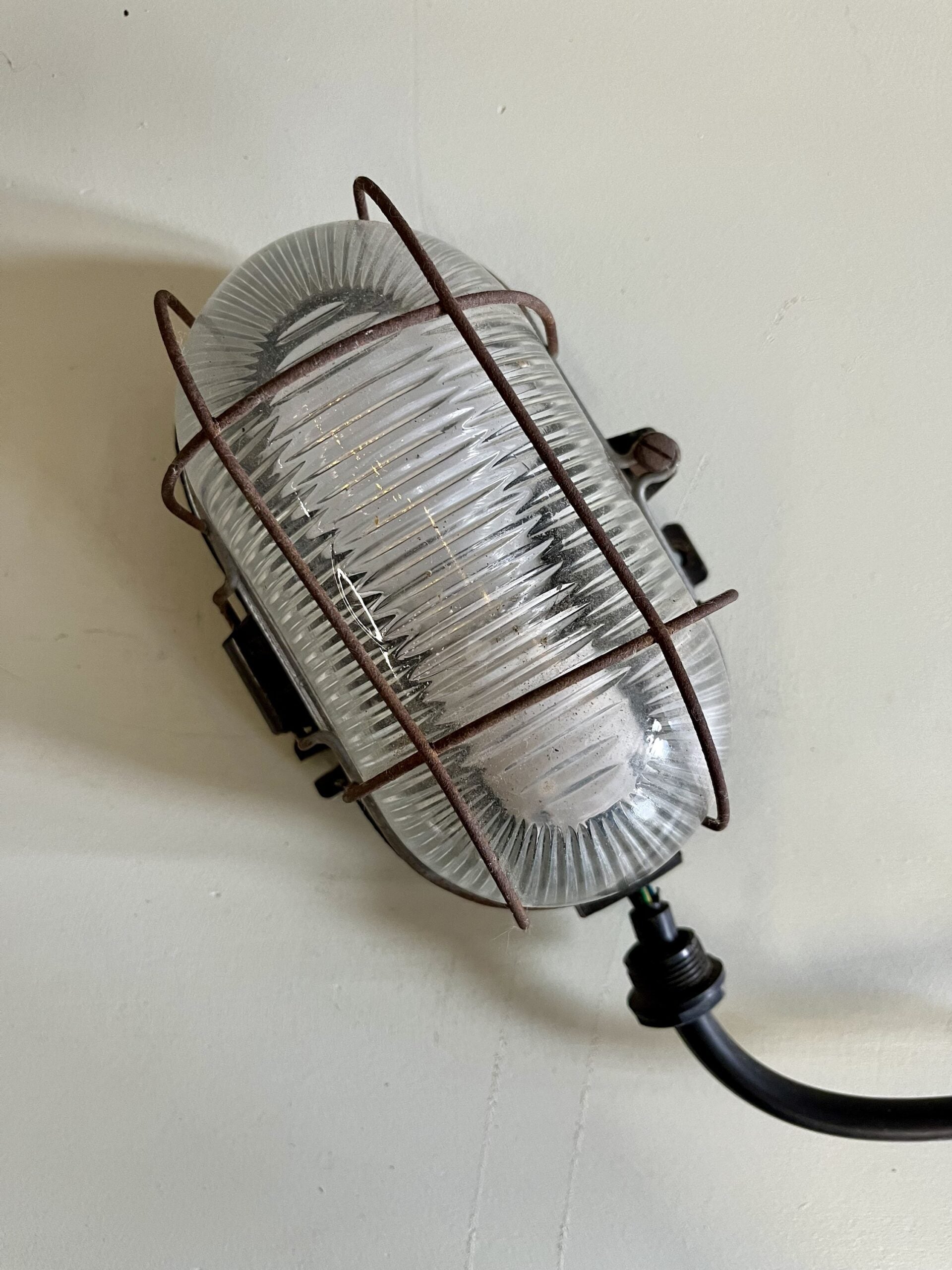 Apportez une touche d’authenticité à votre intérieur avec cette applique murale vintage en verre strié, protégée par une élégante grille métallique. Ce luminaire au charme industriel est idéal pour illuminer vos espaces avec une ambiance rétro et sophistiquée.
