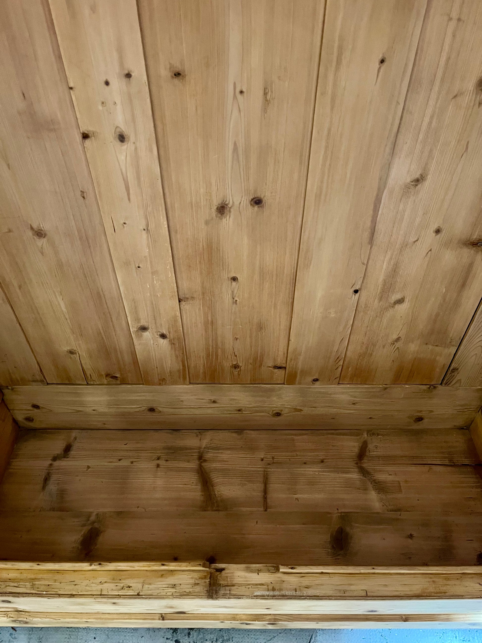 Armoire ancienne en bois massif avec sa corniche légèrement cintrée et ses lignes sobres. Le bois a été entièrement poncé pour retrouver une teinte naturelle claire, puis protégé par un vitrificateur mat incolore qui laisse l’aspect bois brut et met en valeur le veinage et les nœuds.