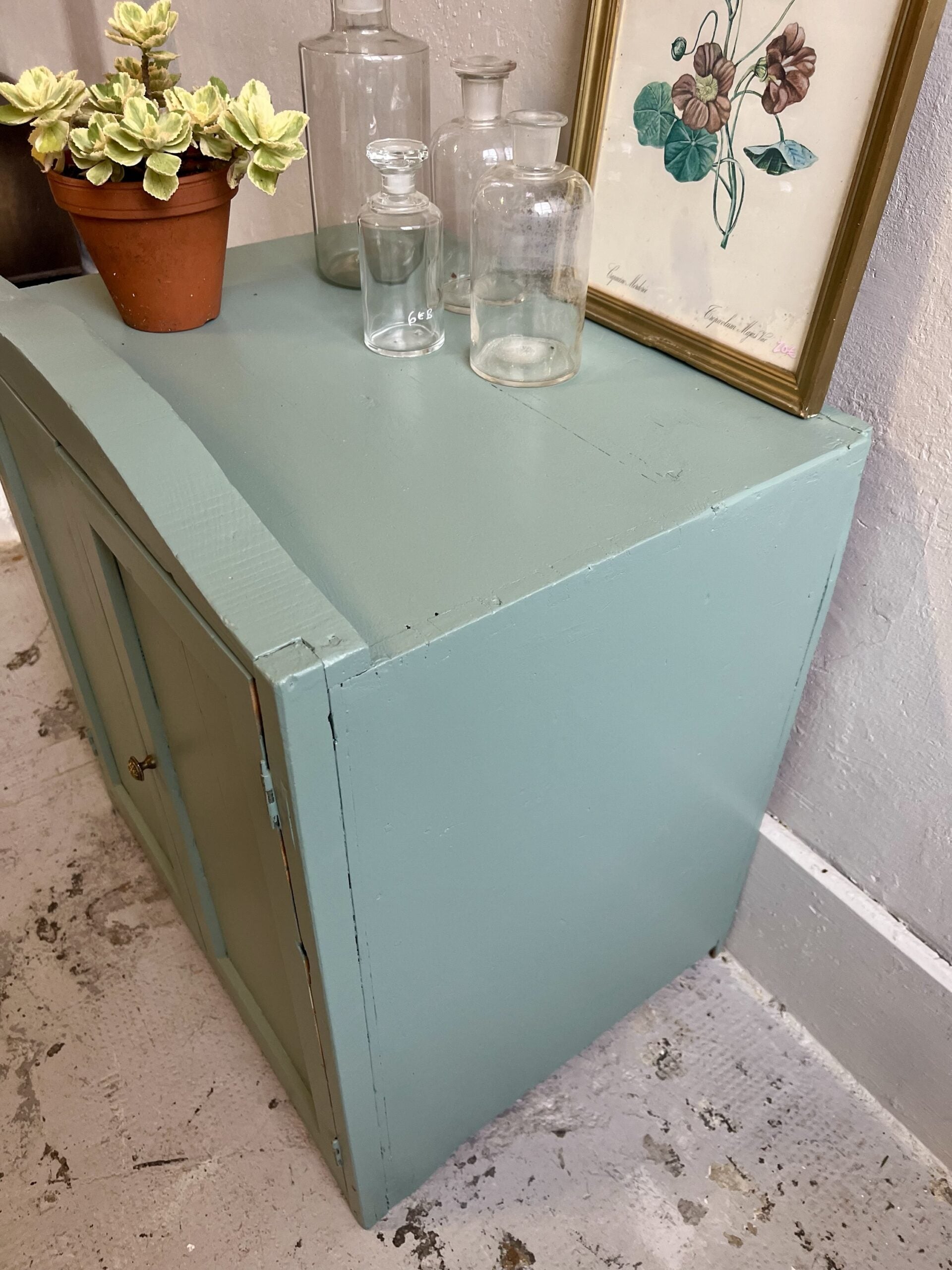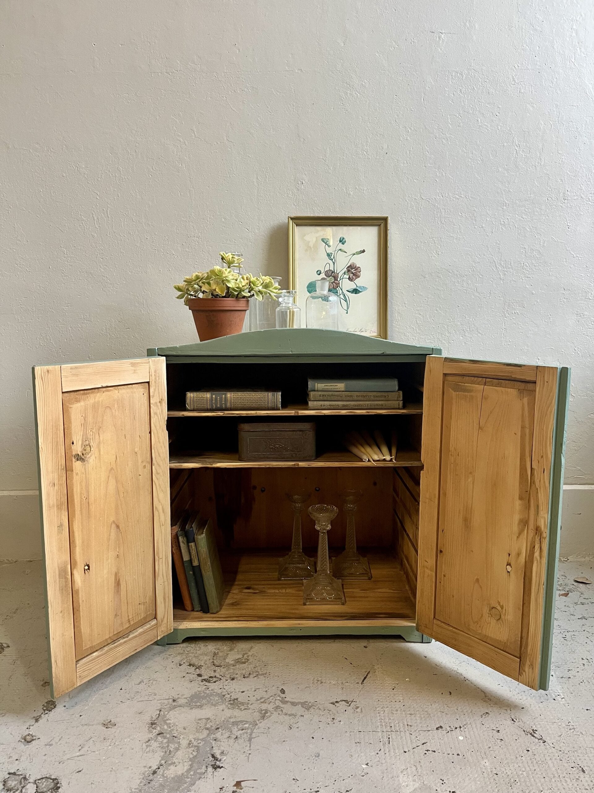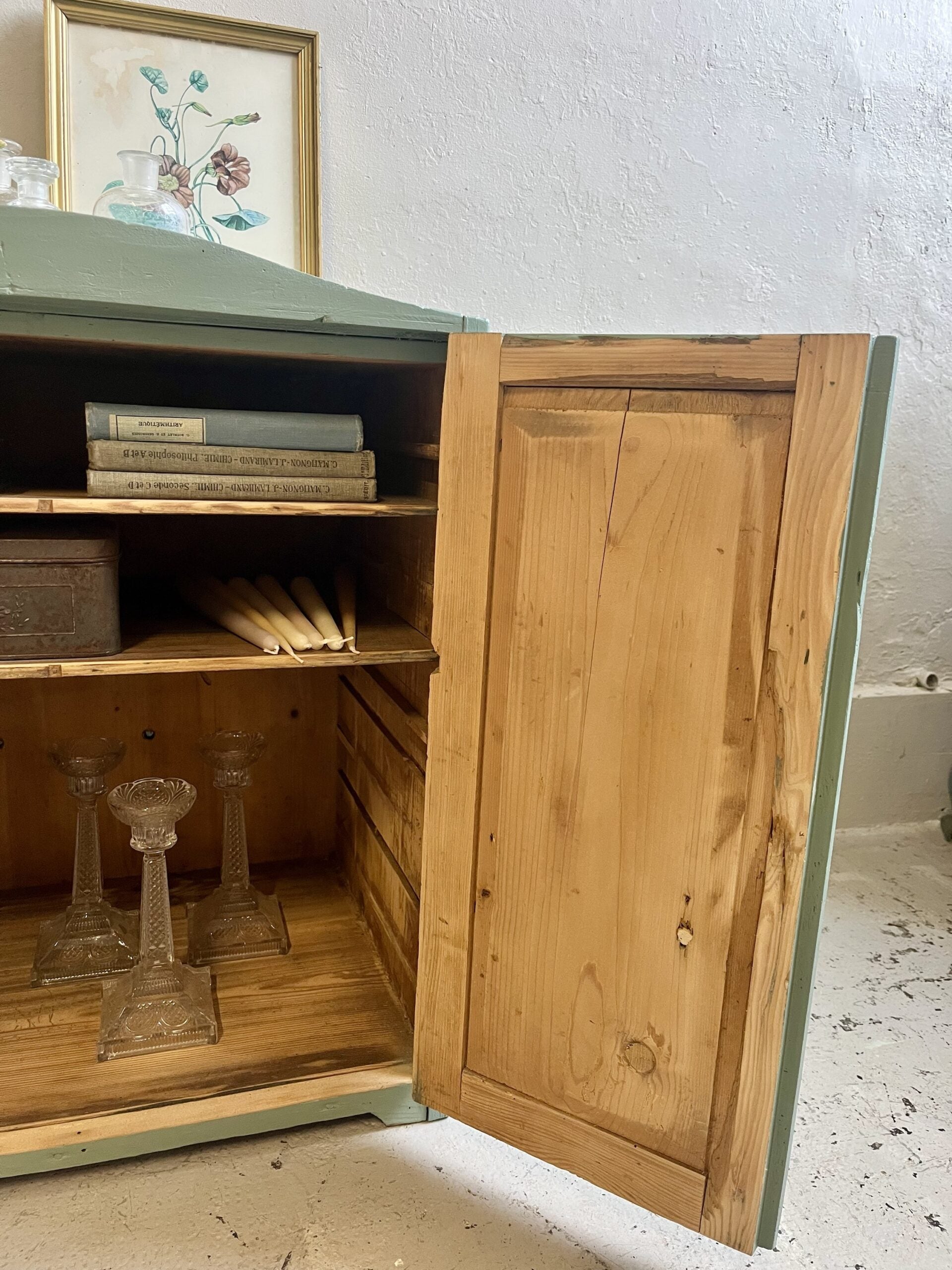 Ce petit meuble ancien en bois a été rénové dans un vert doux légèrement grisé, qui lui donne un esprit meuble à pharmacie tout en restant facile à intégrer dans différents styles d’intérieur. Sa façade à deux portes, ses lignes simples et sa corniche subtilement galbée lui apportent du caractère sans l’alourdir.