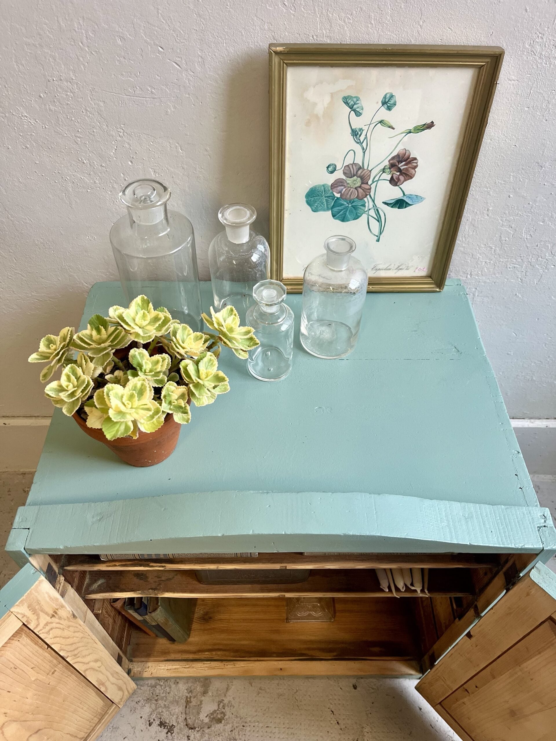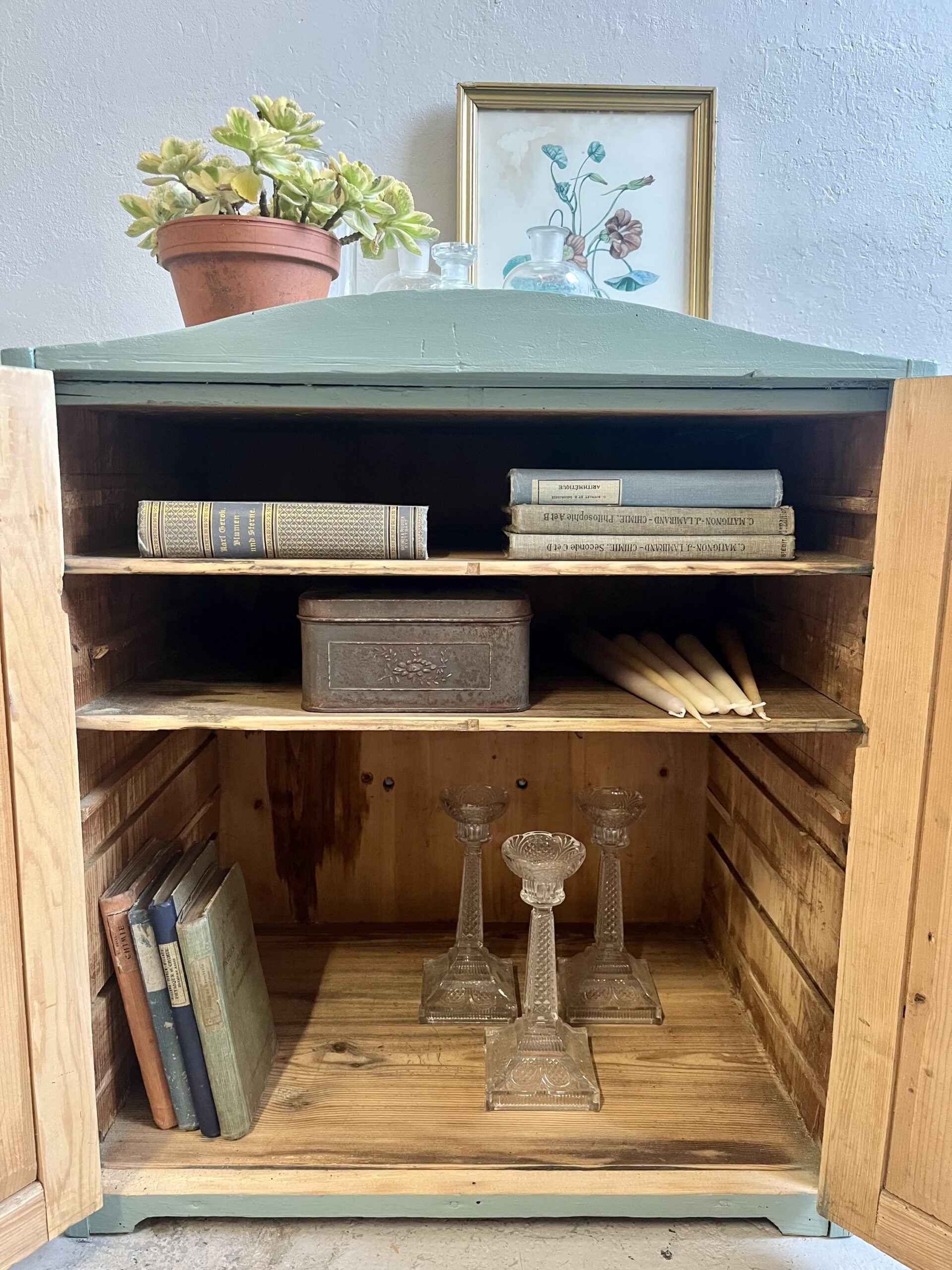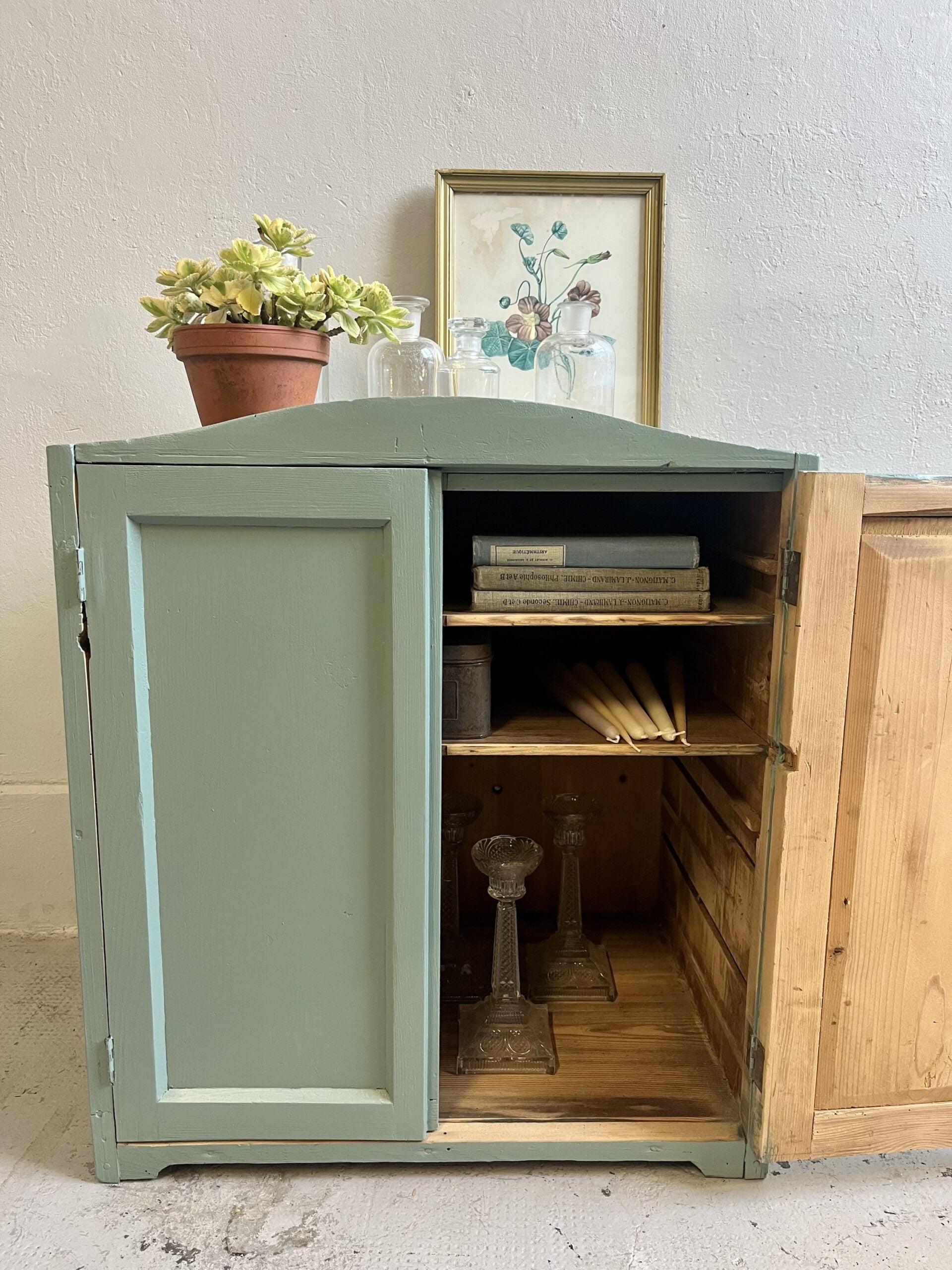 Ce petit meuble ancien en bois a été rénové dans un vert doux légèrement grisé, qui lui donne un esprit meuble à pharmacie tout en restant facile à intégrer dans différents styles d’intérieur. Sa façade à deux portes, ses lignes simples et sa corniche subtilement galbée lui apportent du caractère sans l’alourdir.