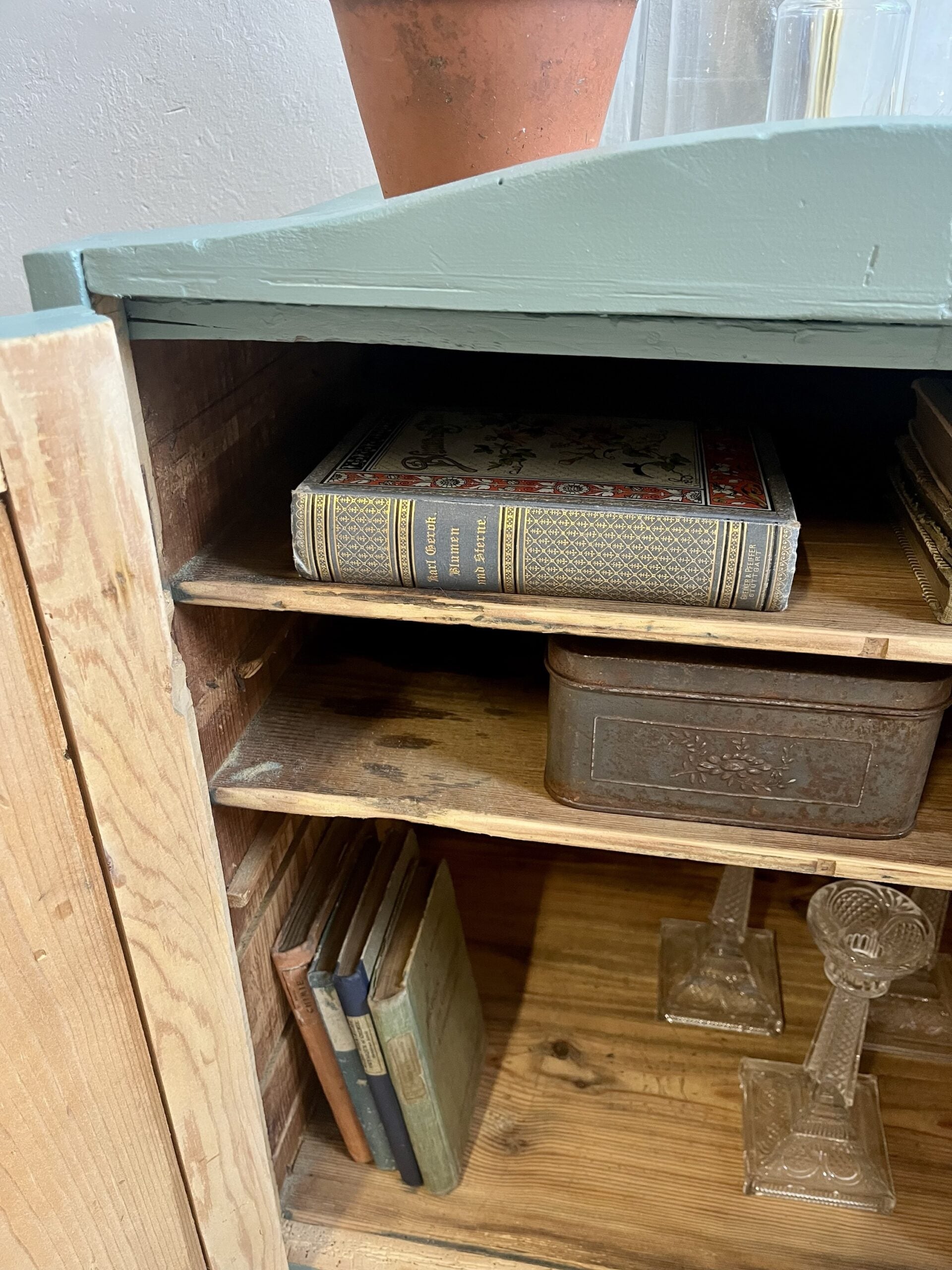 L’intérieur a été conservé en bois brut avec une étagère centrale et une patine naturelle qui contraste avec l’extérieur peint. La quincaillerie et le bouton d’origine ont été préservés dans le respect de son esprit initial.