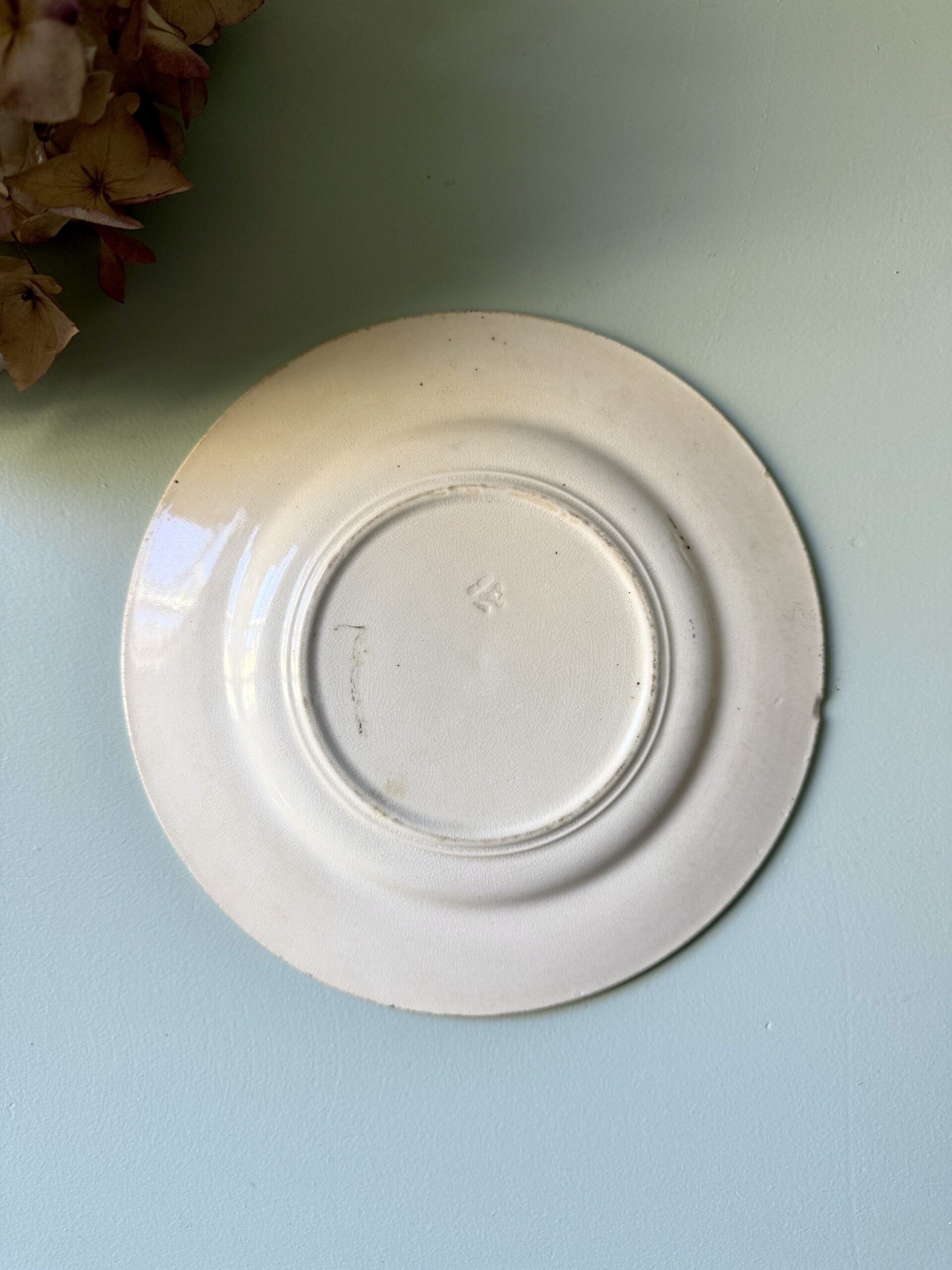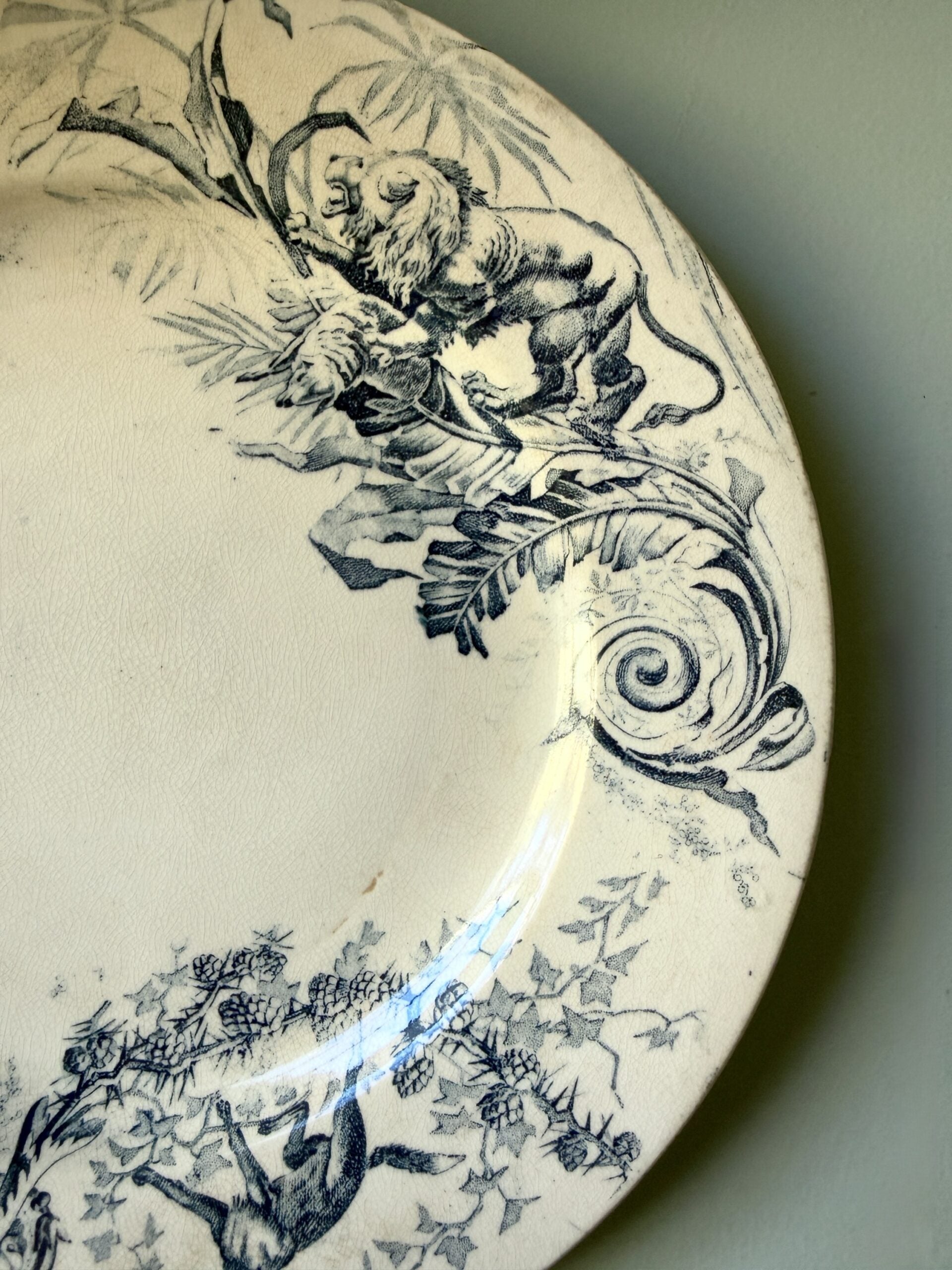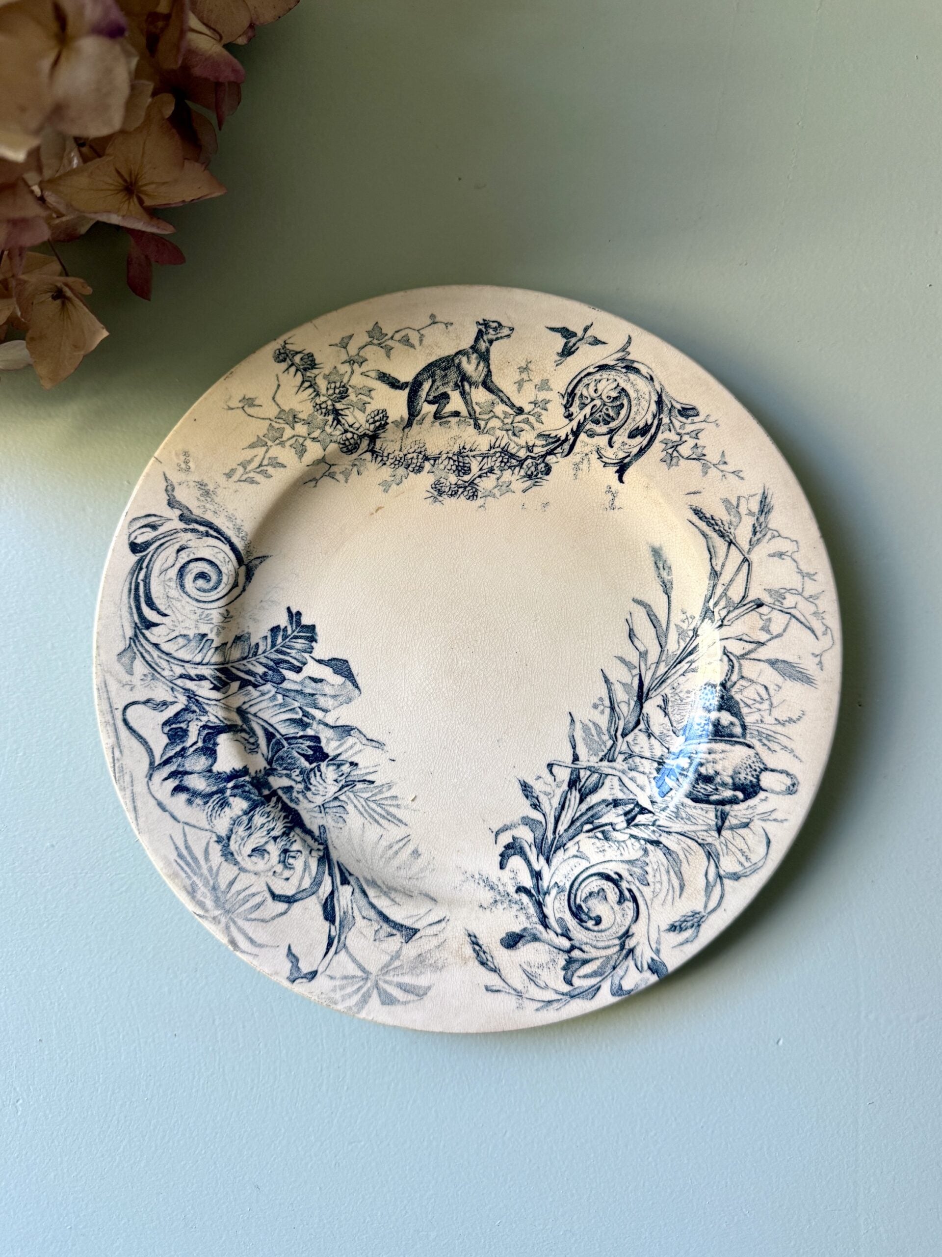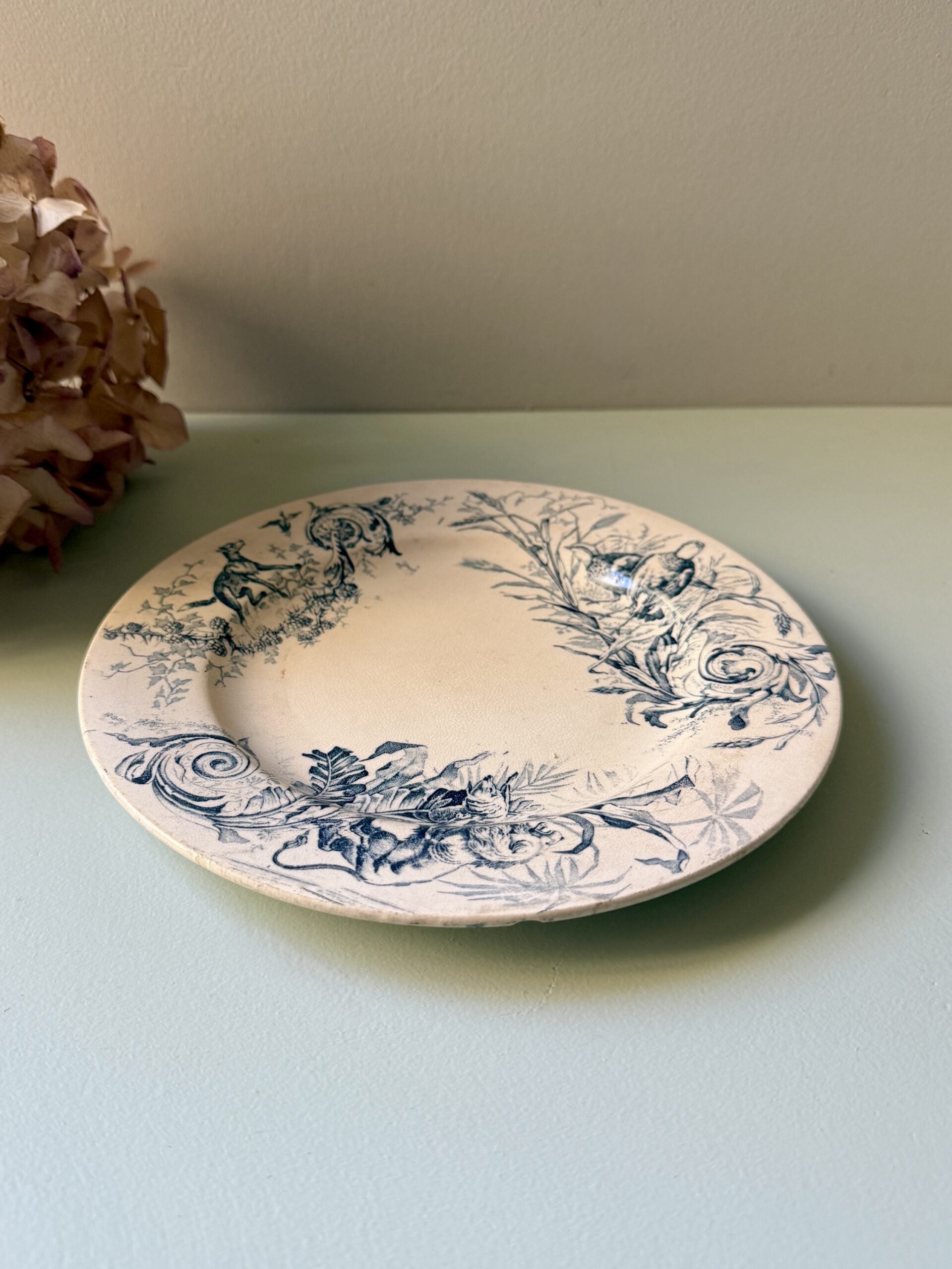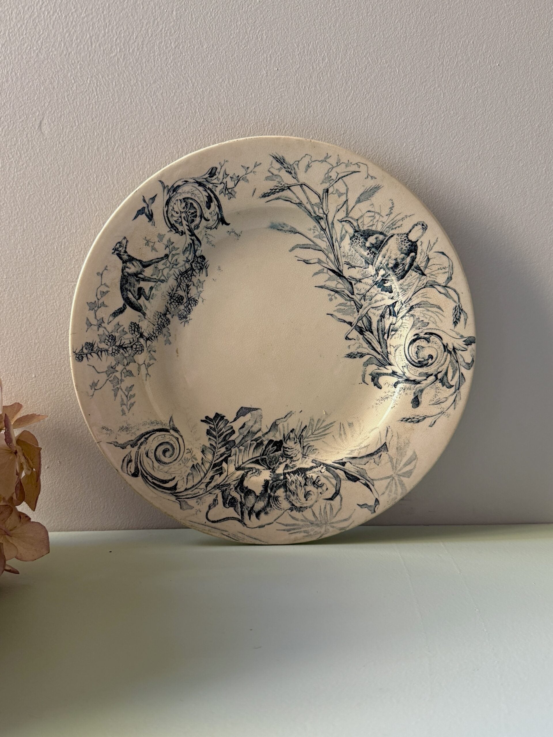 Assiette à dessert en terre de fer, décor bleu inspiration chasse, avec un renard, feuillages et volutes. Jolie pièce de vaisselle ancienne typique des productions Lunéville, même si l’arrière n’est pas signé.Elle fonctionne aussi bien en assiette de service que posée en déco dans une cuisine ou un coin déco vintage. À mixer avec d’autres pièces de vaisselle vintage.