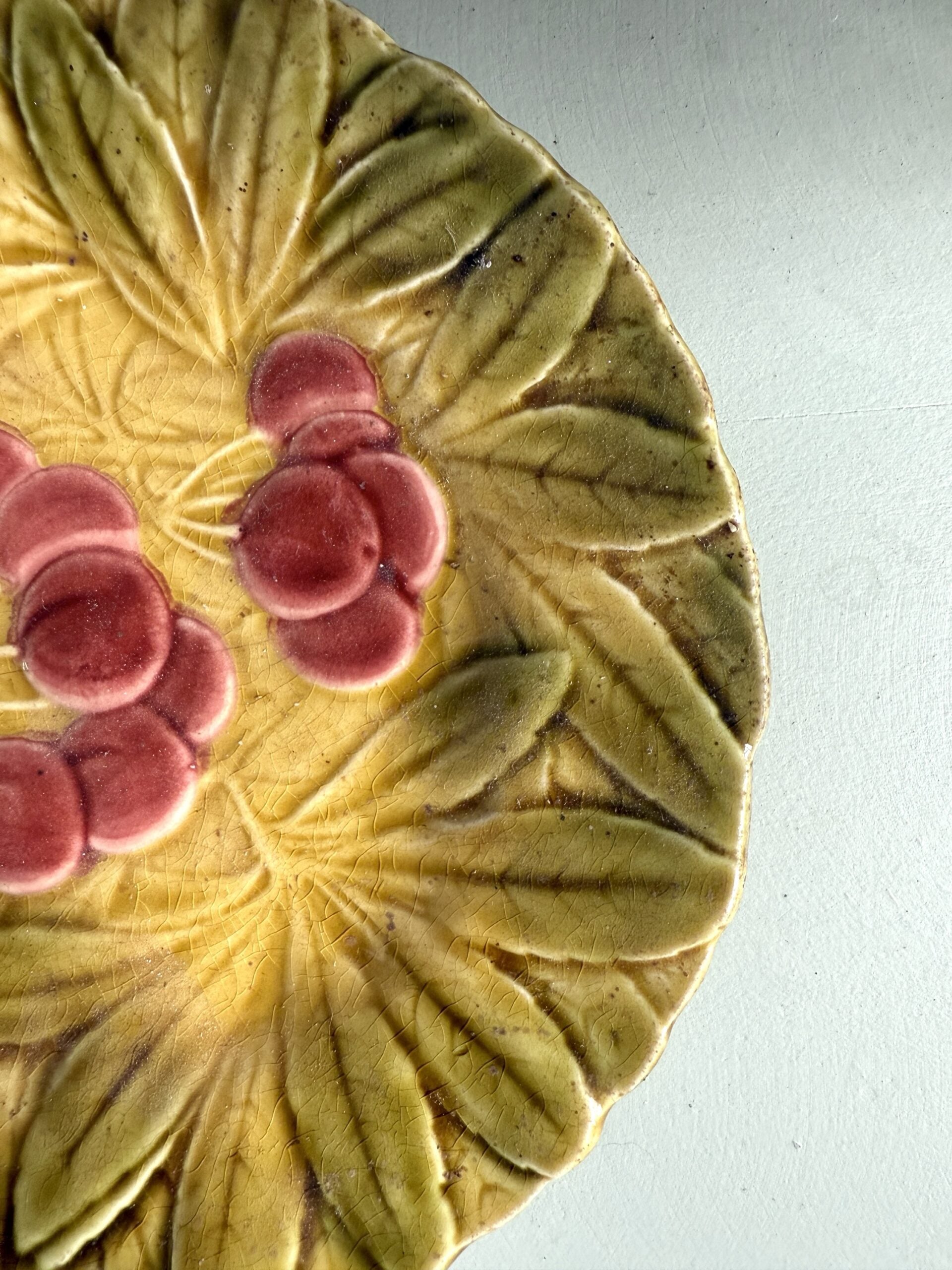 Fond nervuré façon feuillage, fruits en léger relief, émaillage caractéristique du savoir-faire Sarreguemines.