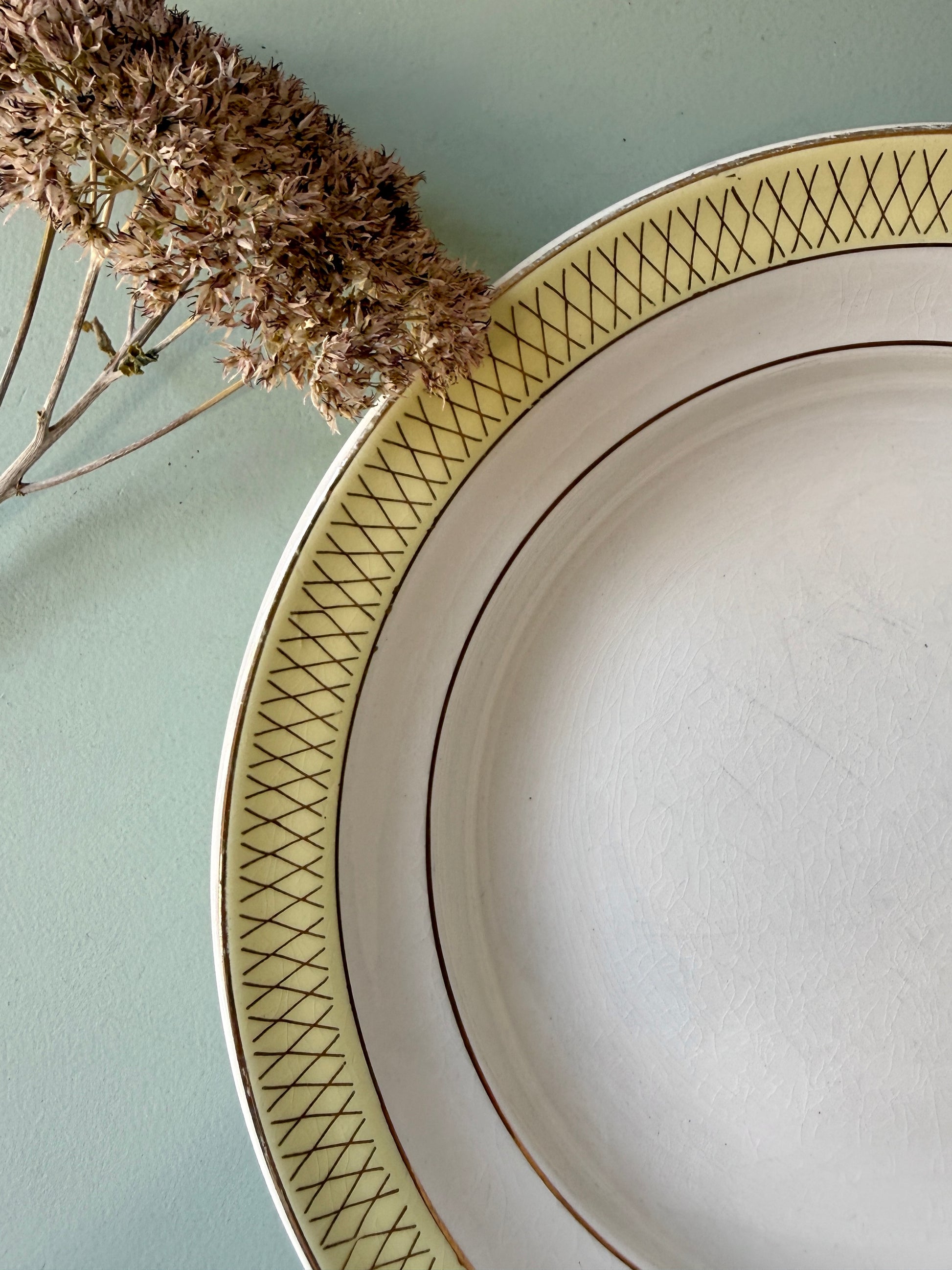 Décor graphique jaune avec croisillons bruns sur le marli, encadré d’un filet brun. Un motif simple et typique de la vaisselle des années 50-60, facile à associer avec d’autres assiettes anciennes.