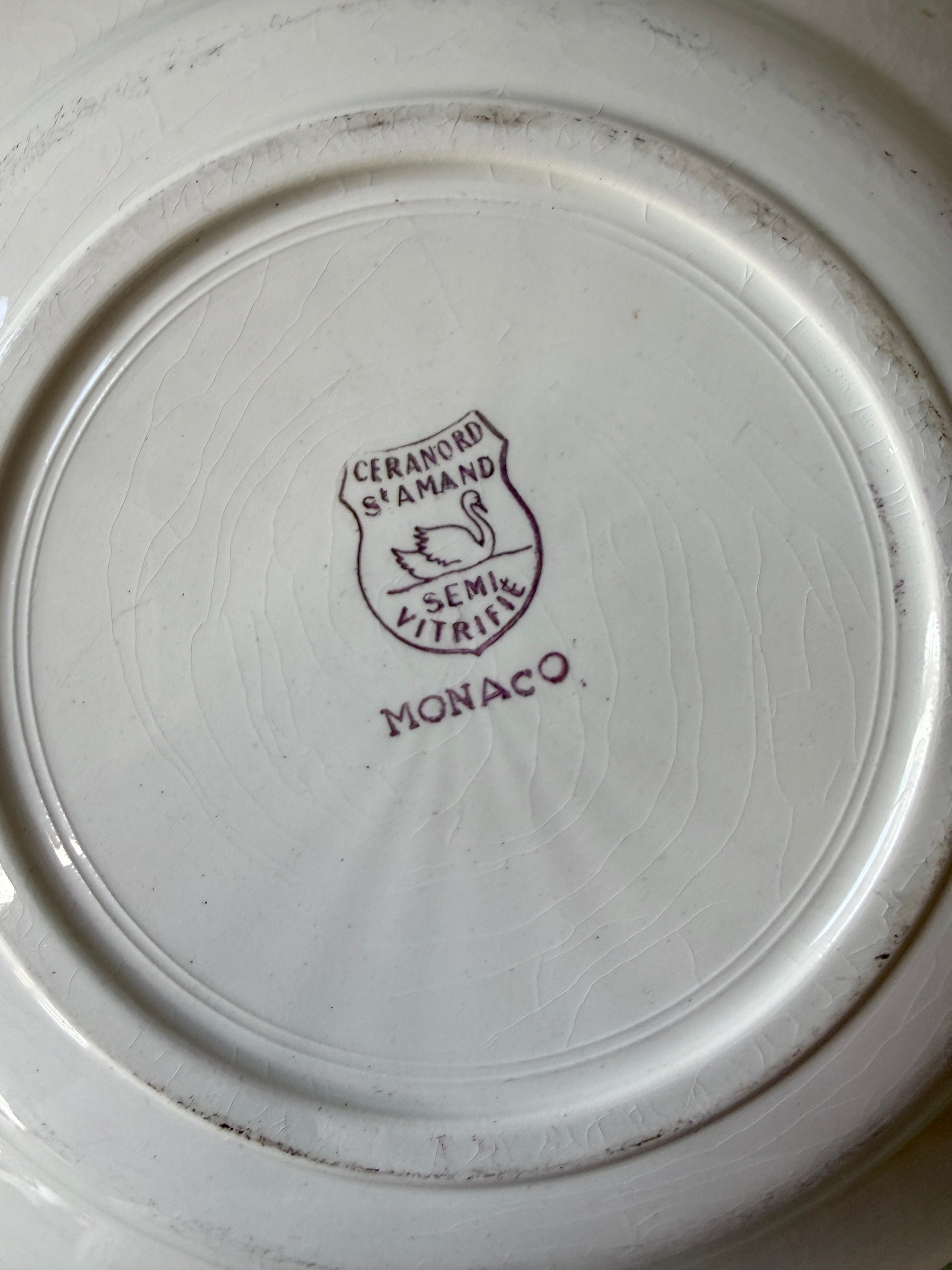 Assiette creuse ancienne de la manufacture Céranord Saint-Amand, modèle Monaco. La faïencerie de Saint-Amand, dans le Nord de la France, a produit au XXᵉ siècle de nombreux services de table robustes et décoratifs, très présents dans les cuisines et salles à manger françaises.