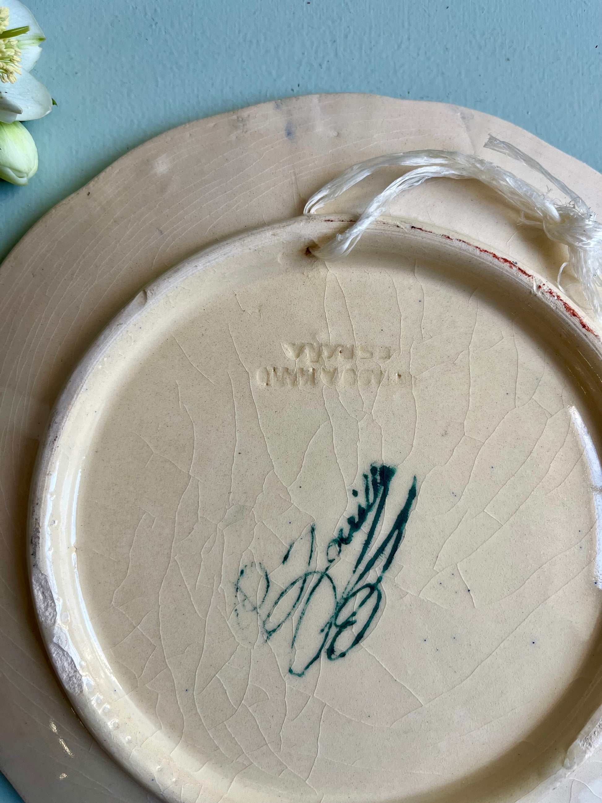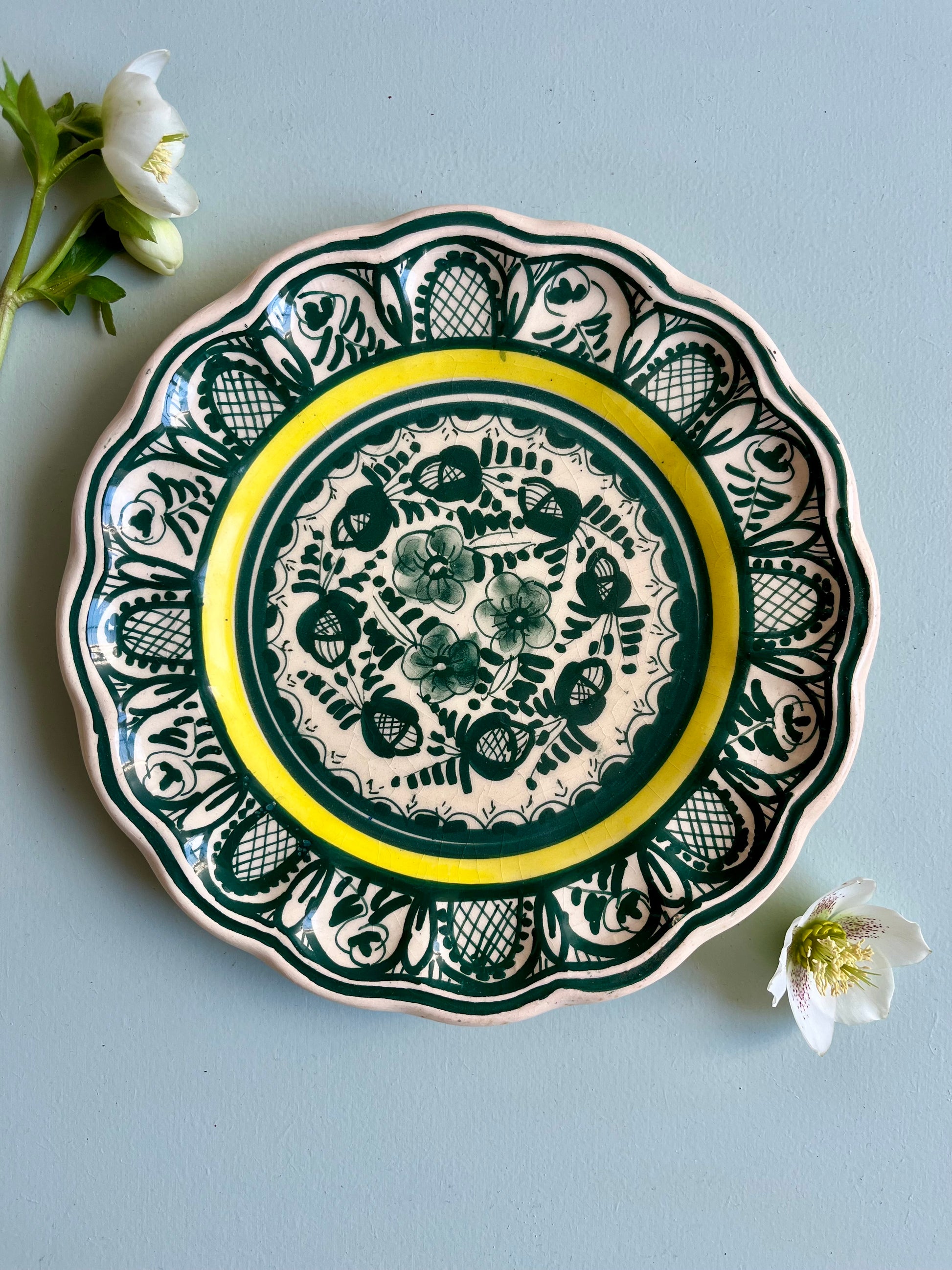Assiette ancienne en céramique avec décor peint vert au motif floral stylisé et large liseré jaune au centre. Bord festonné qui lui donne tout de suite un petit air méditerranéen, esprit Espagne ou Italie.