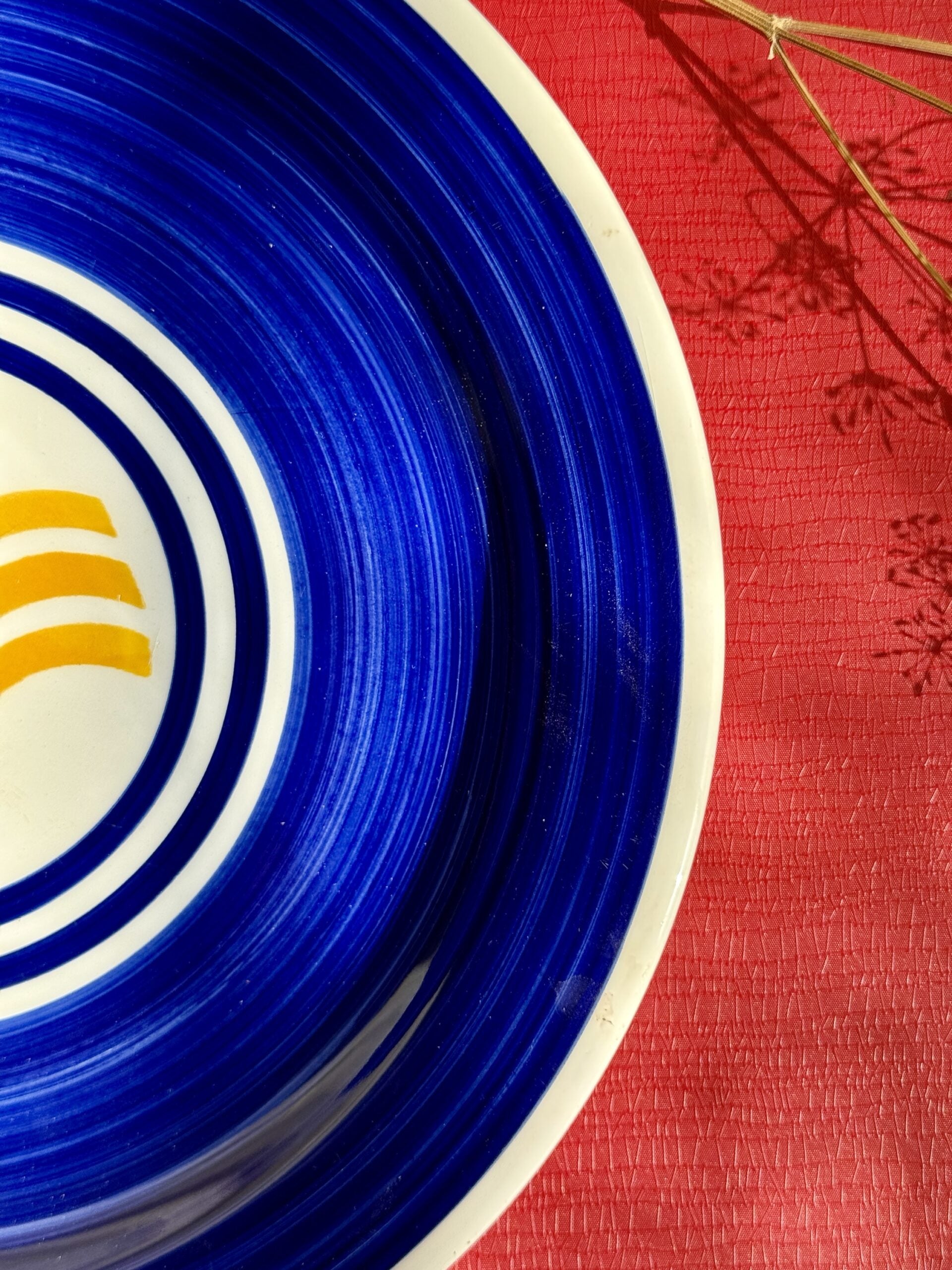 Plat rond Ind Ceram Italie en céramique artisanale, avec décor bleu profond et motif jaune central lumineux. Un contraste typique des productions italiennes faites main, où la couleur est franche et assumée.
