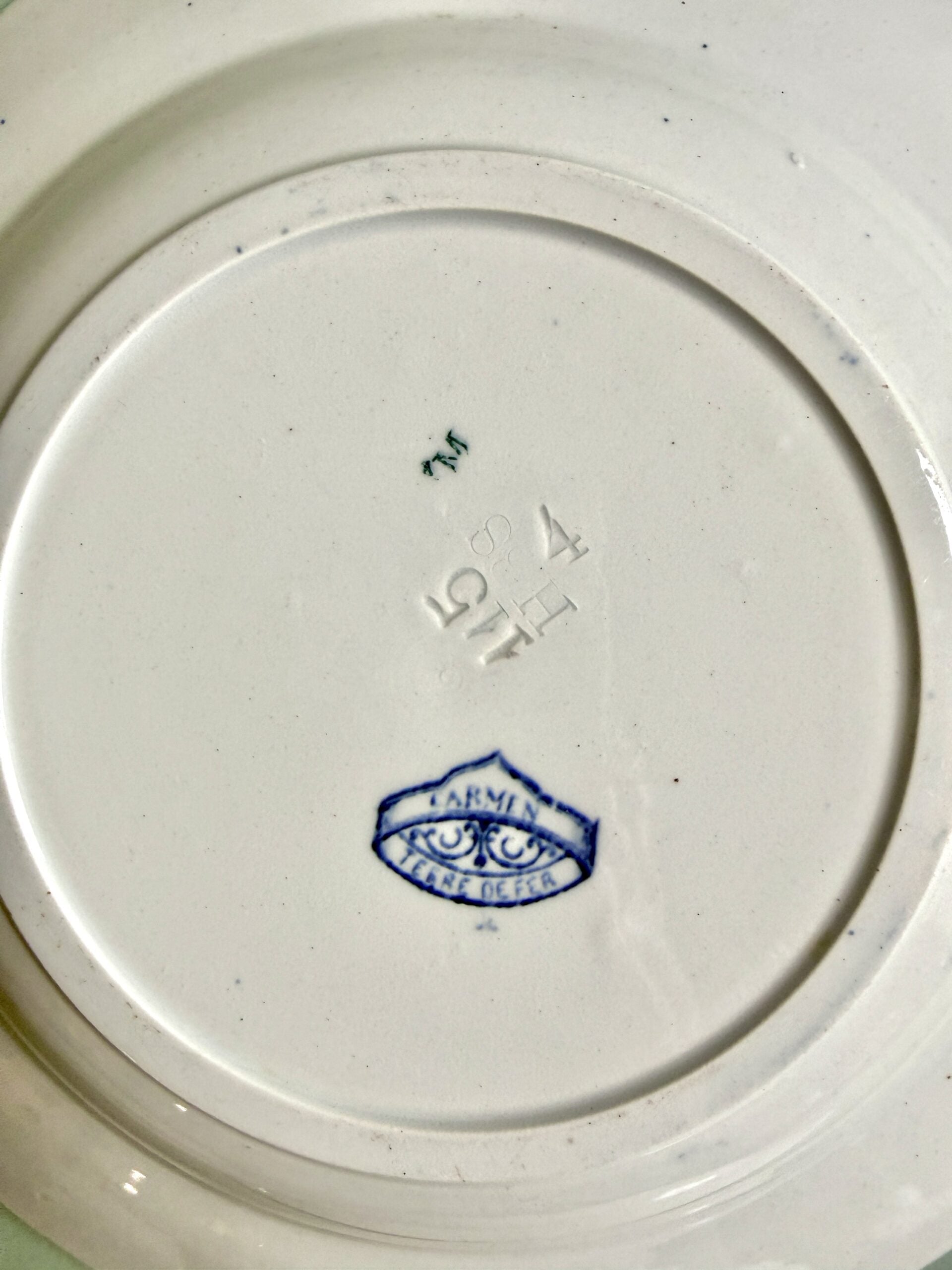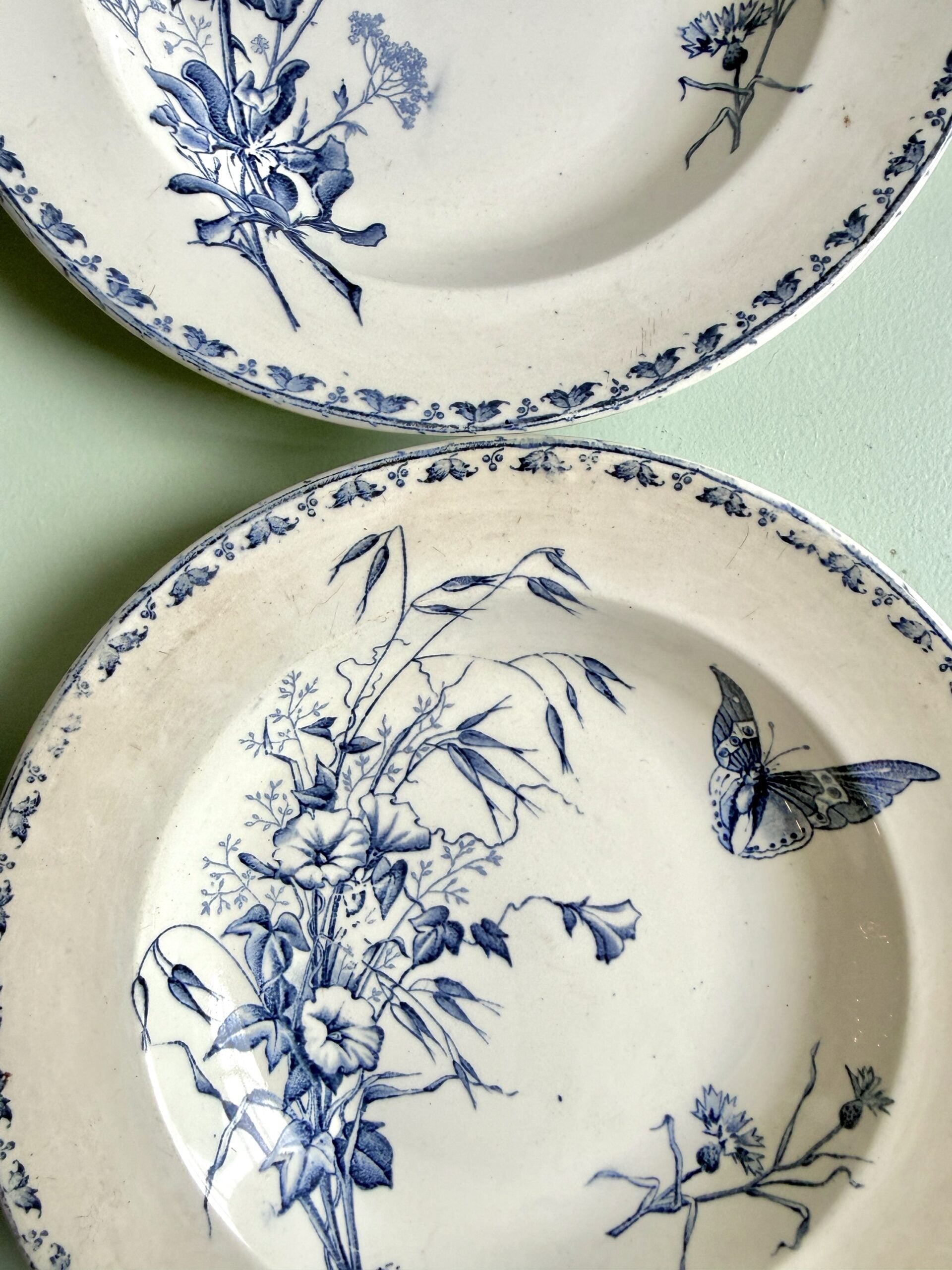 Assiettes creuses Sarreguemines modèle Carmen en terre de fer, décorées de motifs floraux bleus variés. Modèle emblématique de la vaisselle ancienne française, idéal pour composer une table vintage pleine de personnalité.