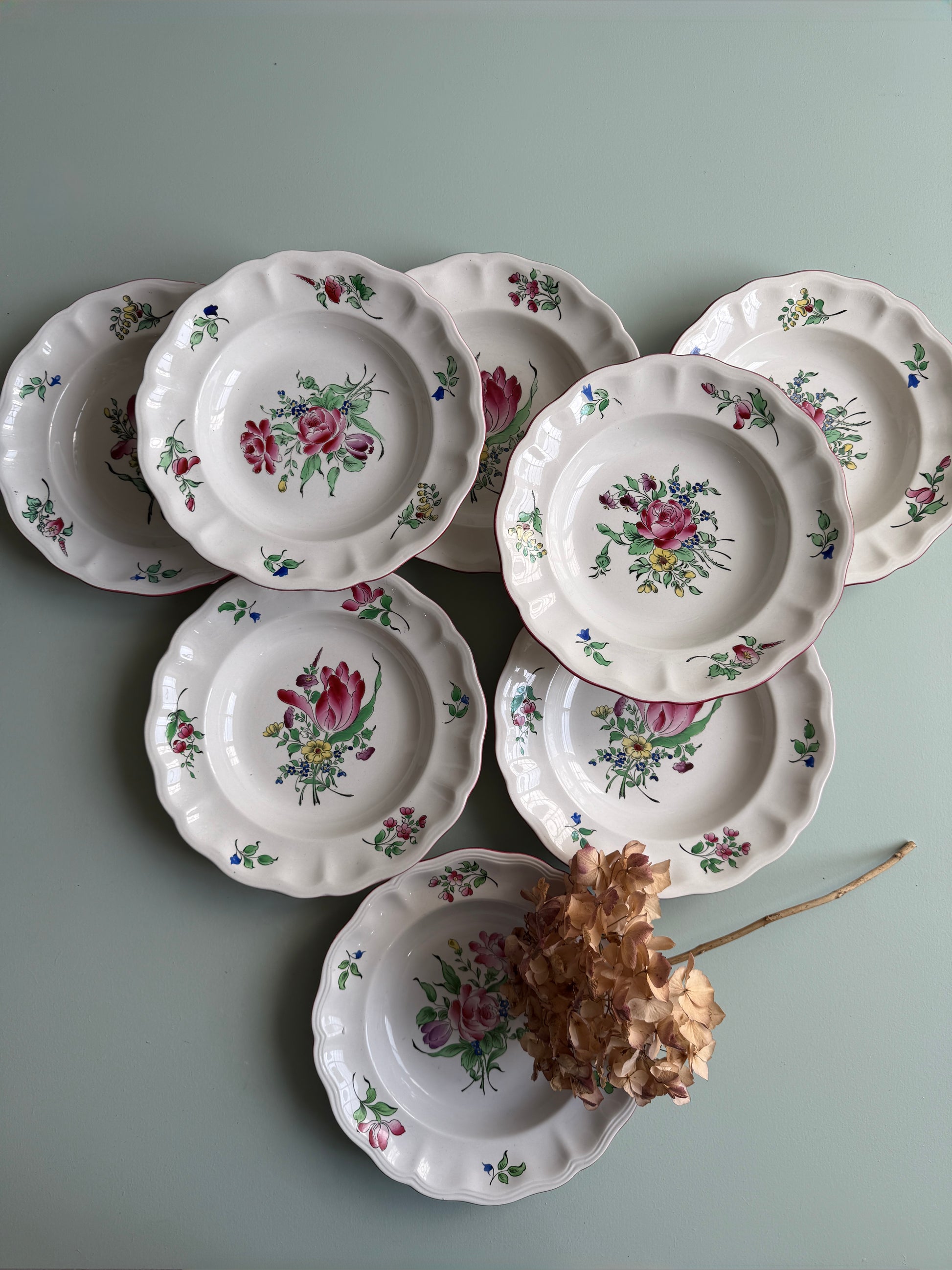 Le bouquet central et les petits motifs fleuris répartis sur l’aile apportent beaucoup de fraîcheur à la table. Ce type de vaisselle ancienne fonctionne aussi bien pour le quotidien que pour dresser une jolie table de famille.