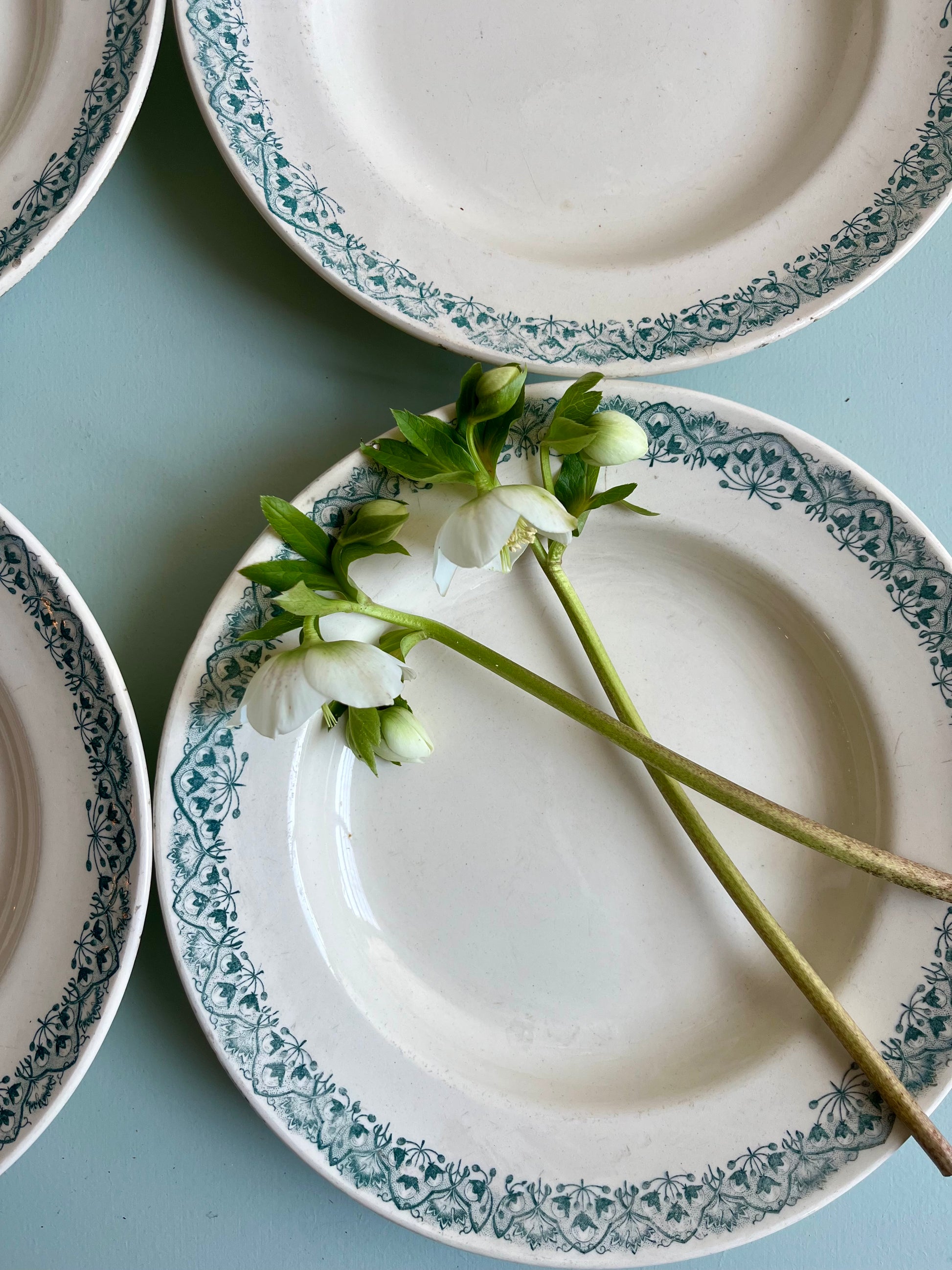 Diamètre 25 cm, parfaite en assiette pour les repas de tous les jours. Le blanc et vert se marient facilement avec d’autres assiettes anciennes, fleuries ou plus sobres, pour composer une table dépareillée pleine de vie.
