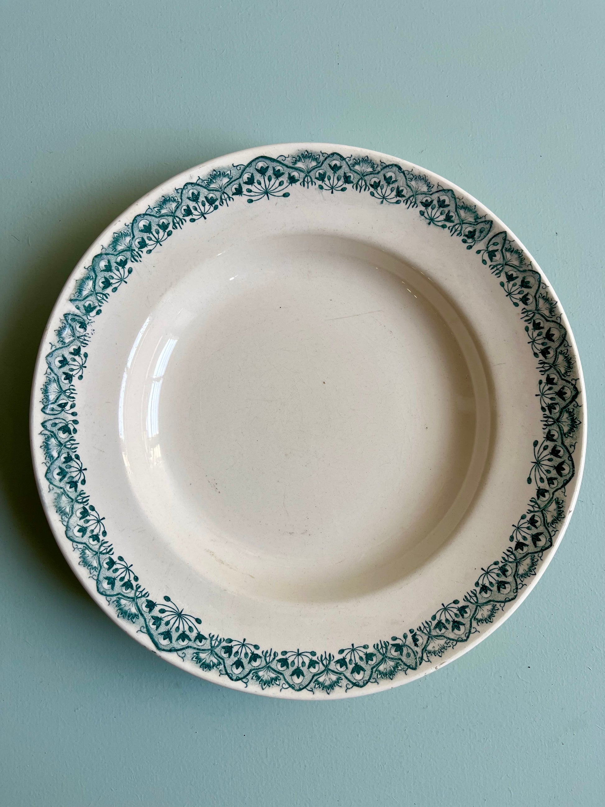 Assiette ancienne de la manufacture Longchamp, modèle André, reconnaissable à sa frise végétale vert qui encadre l’aile avec finesse. Un décor classique du XXe siècle, pensé pour accompagner les tables familiales au quotidien.