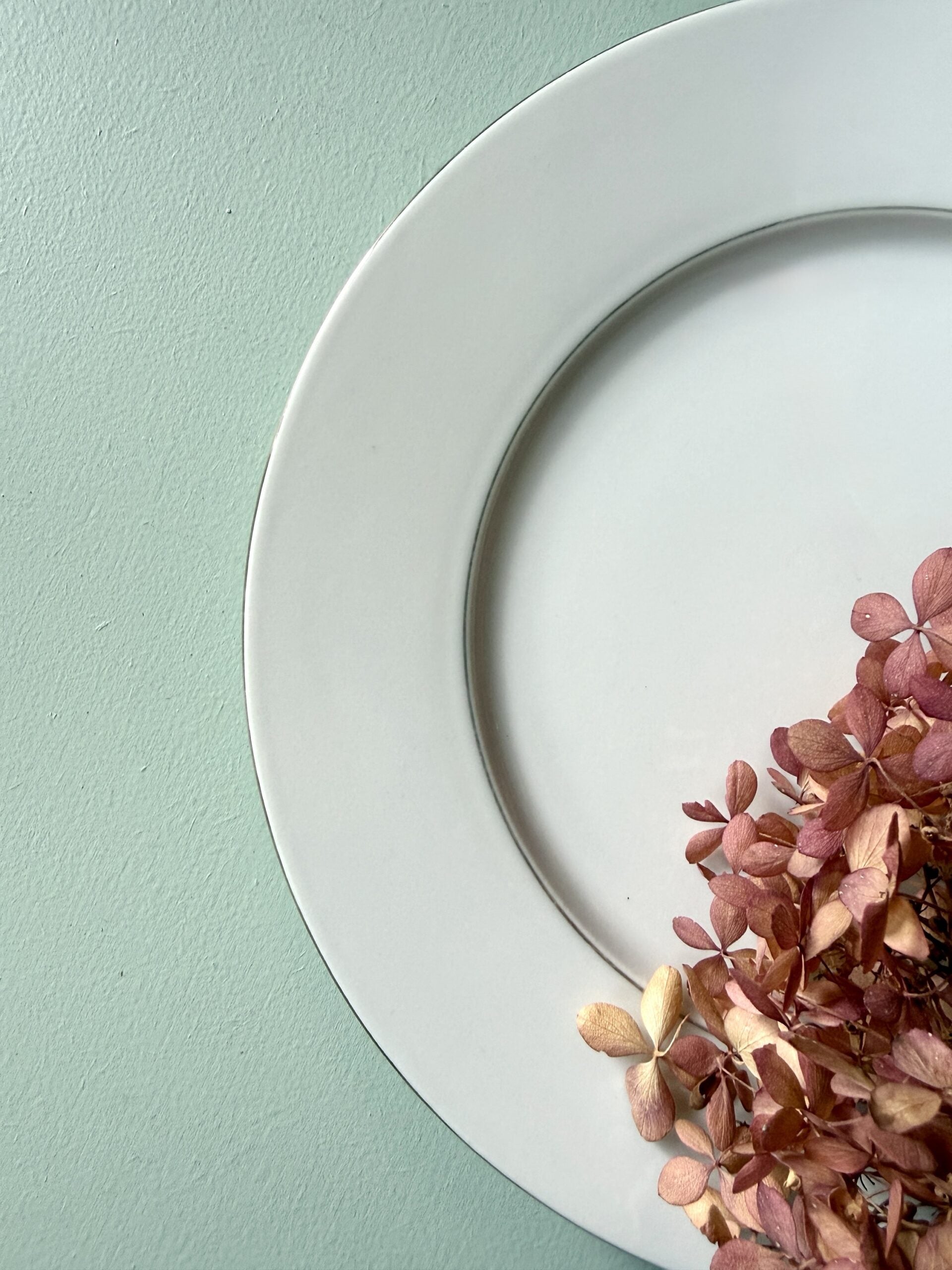 Assiettes plates en porcelaine blanche, avec un liseré doré fin sur le pourtour. Un classique qui fonctionne à tous les coups pour les tables de fête : sobre, lumineux, et juste ce qu’il faut de doré pour faire joli sans tomber dans le trop chargé. Elles peuvent aussi se mixer facilement avec d’autres assiettes anciennes pour une table plus décontractée et moins sage.Quelques traces du temps sont présentes, avec une légère usure du liseré doré par endroits, visibles sur les photos.