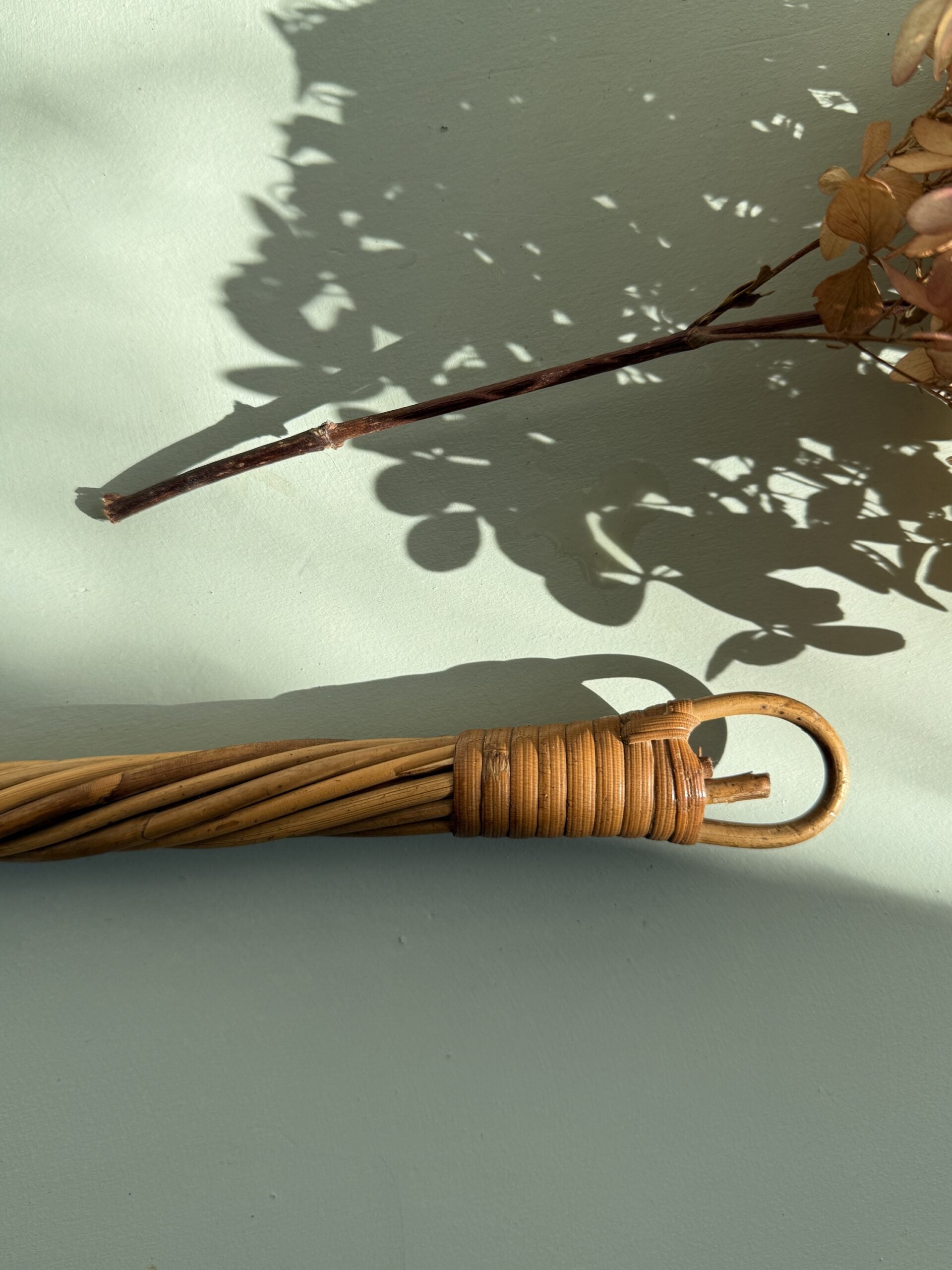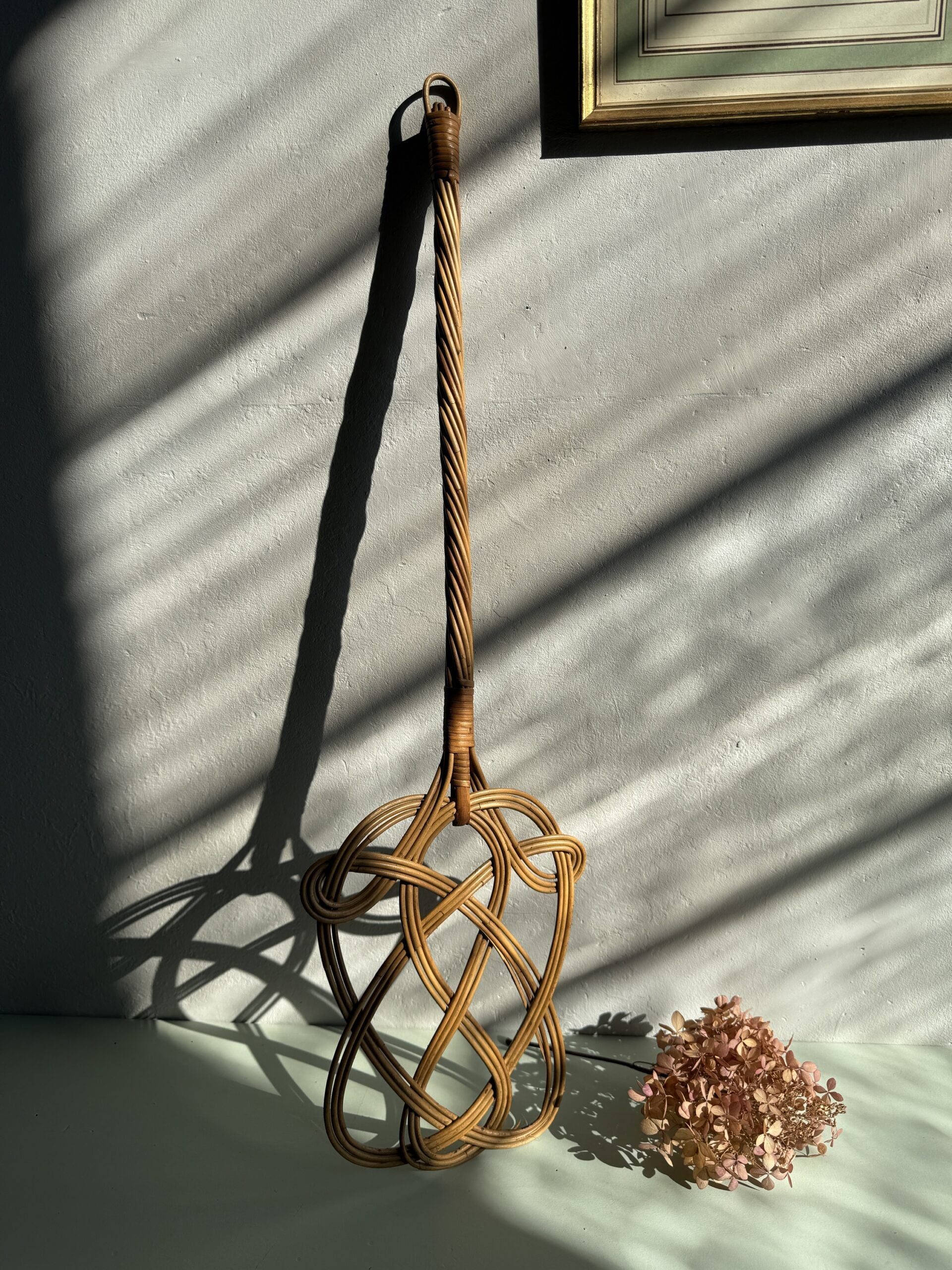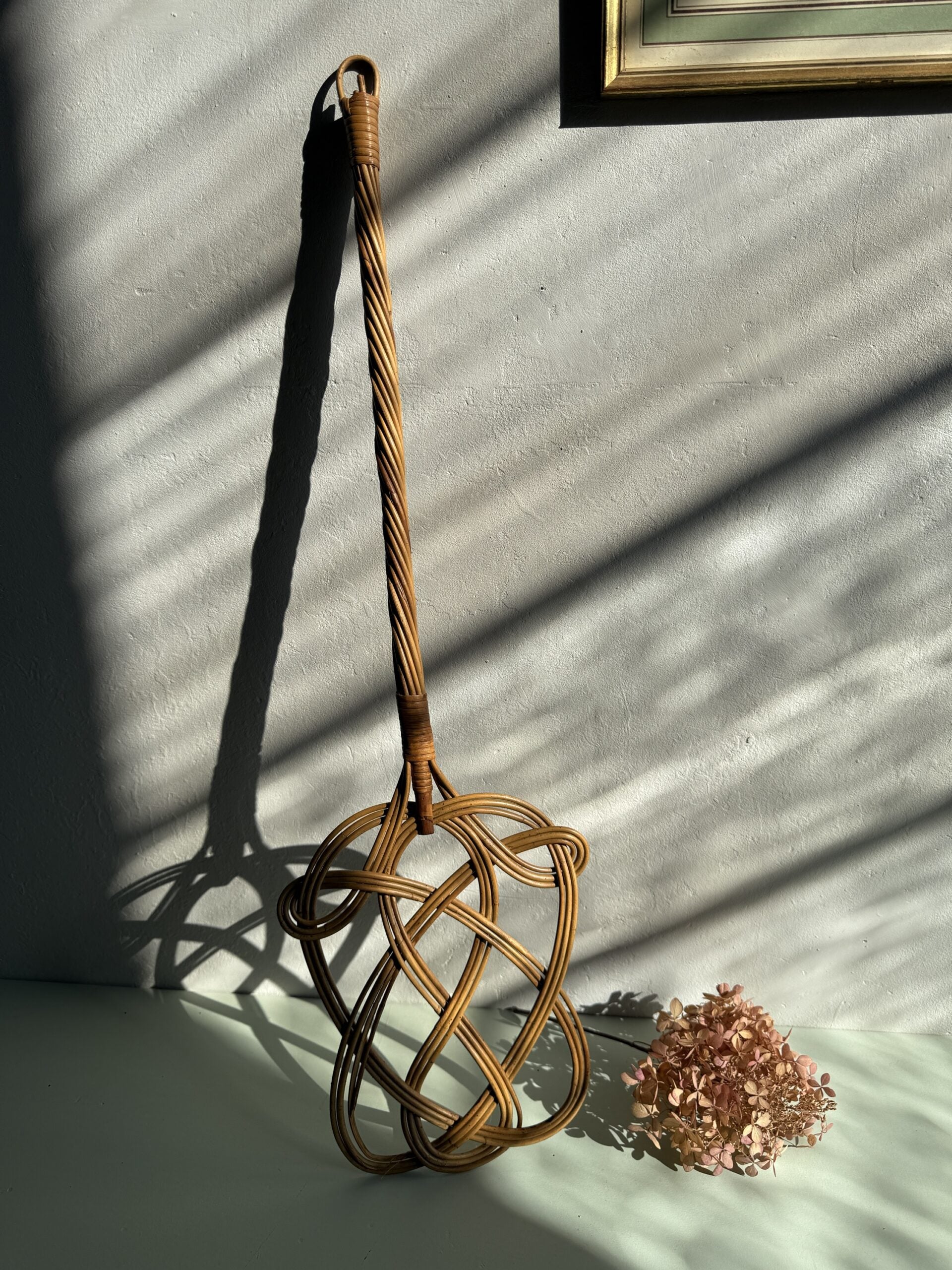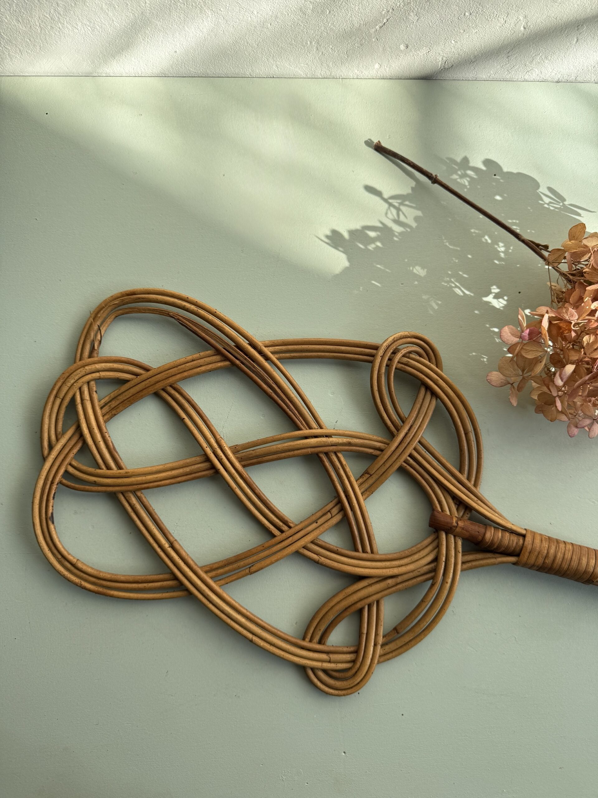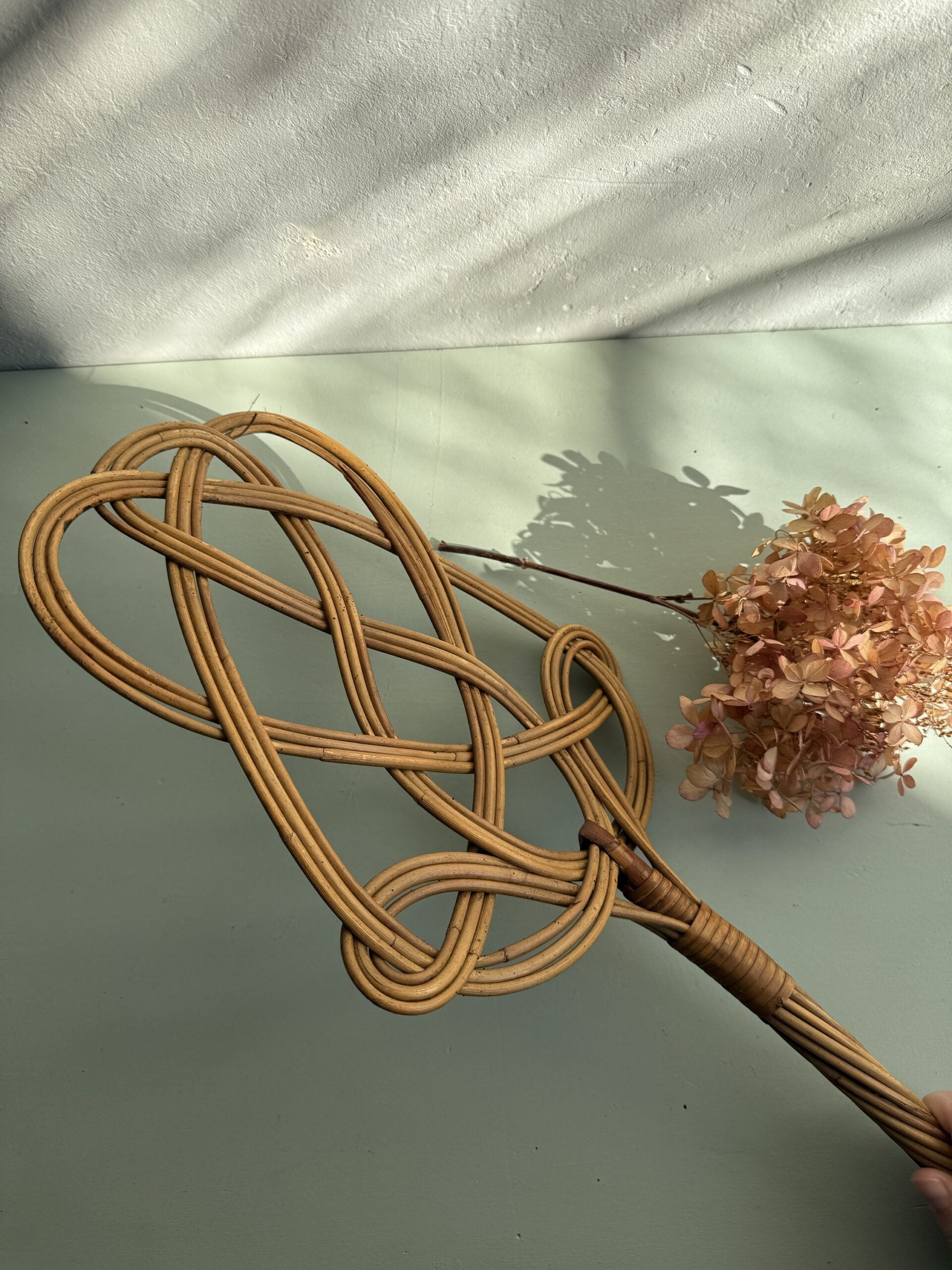 Battoir ancien en osier tressé, utilisé autrefois pour dépoussiérer les tapis. Sa forme et sa matière naturelle en font un objet pratique mais aussi décoratif.