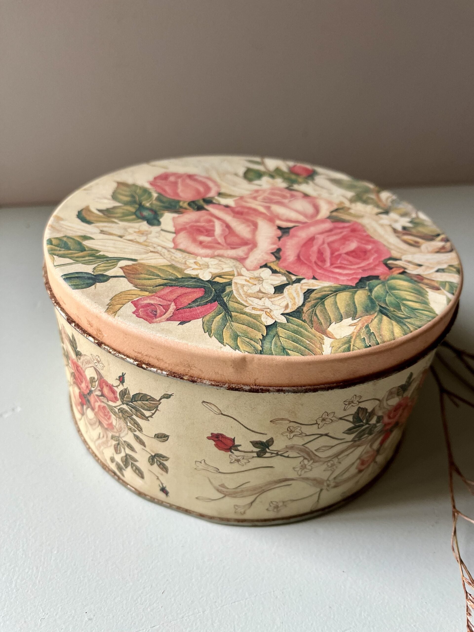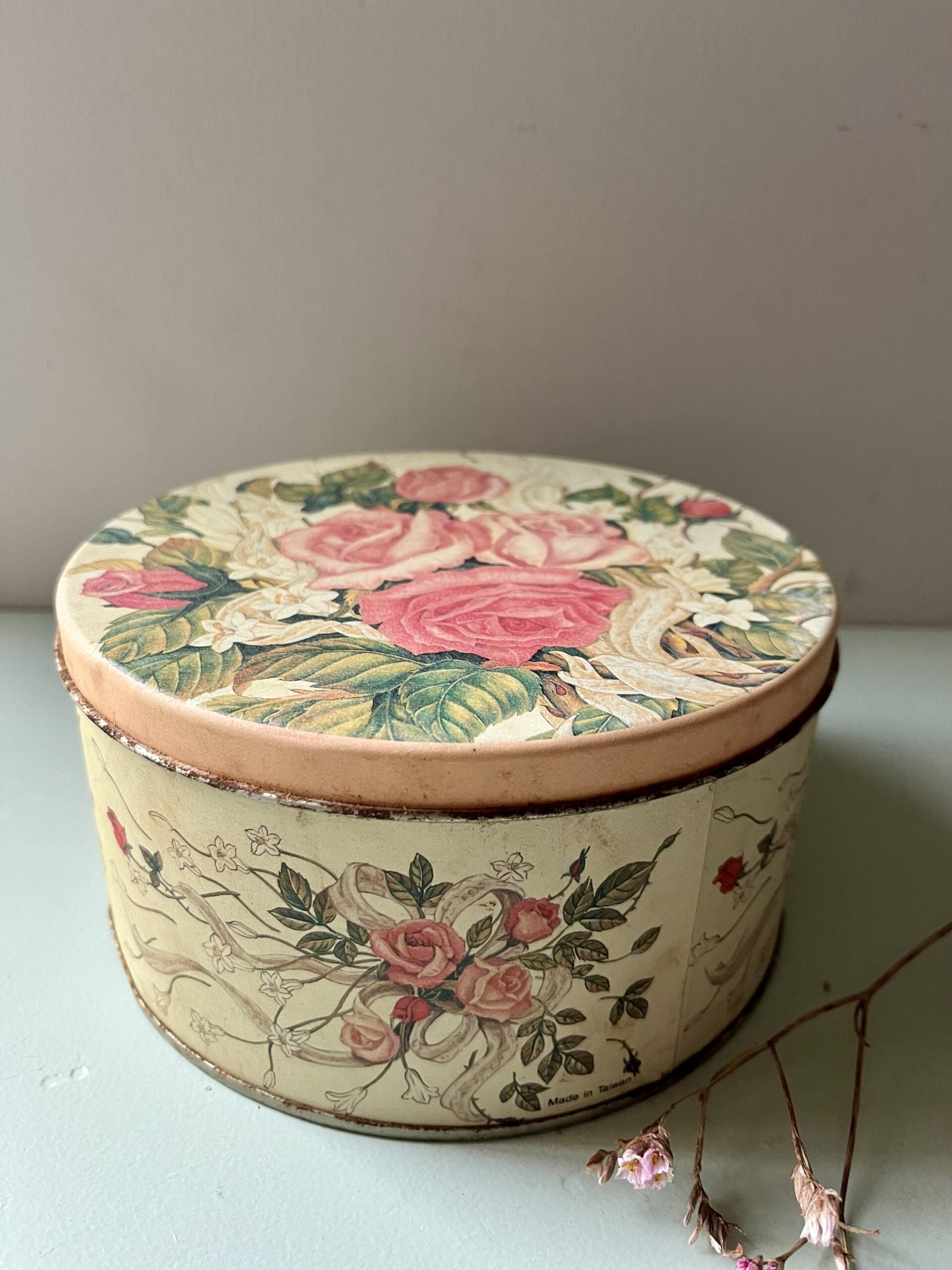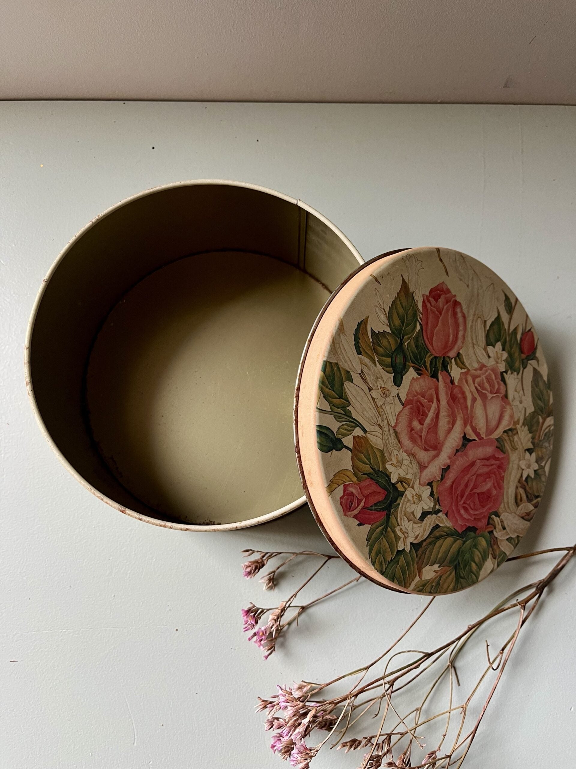 Boîte ancienne en métal avec joli décor floral, dans des tons doux et légèrement passés. Les fleurs roses et le fond crème lui donnent une vraie présence déco, parfaite sur une étagère, une coiffeuse ou dans une cuisine pour ranger petits trésors, papiers ou accessoires.Le métal présente quelques traces du temps, visibles sur les photos, qui participent à son charme. Le couvercle s’ajuste correctement. Une pièce simple, décorative et pleine de personnalité, facile à intégrer dans un intérieur actuel comme dans une ambiance plus ancienne.