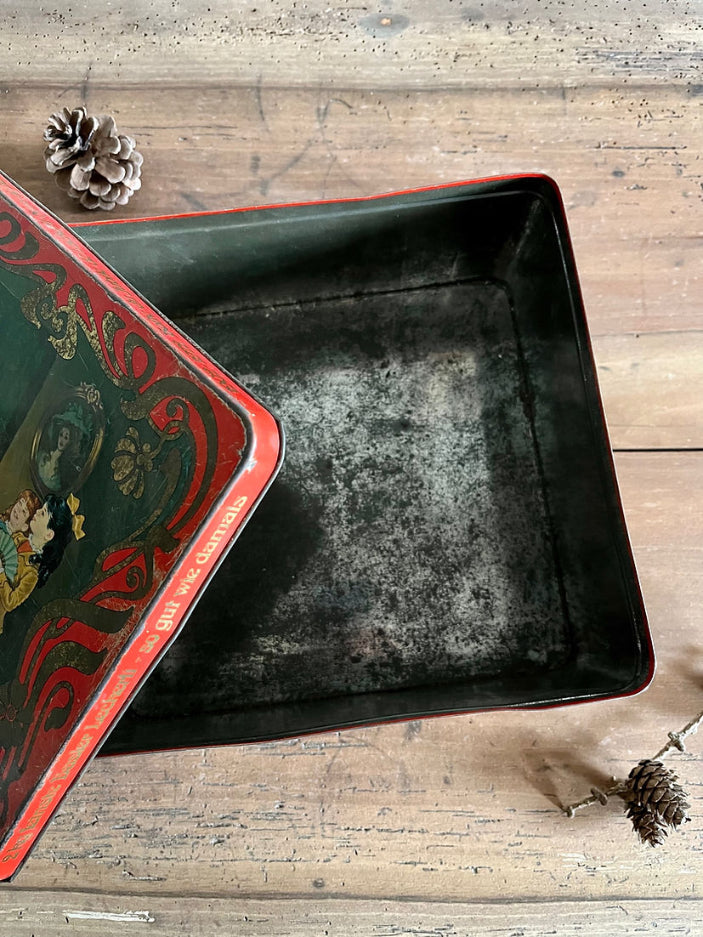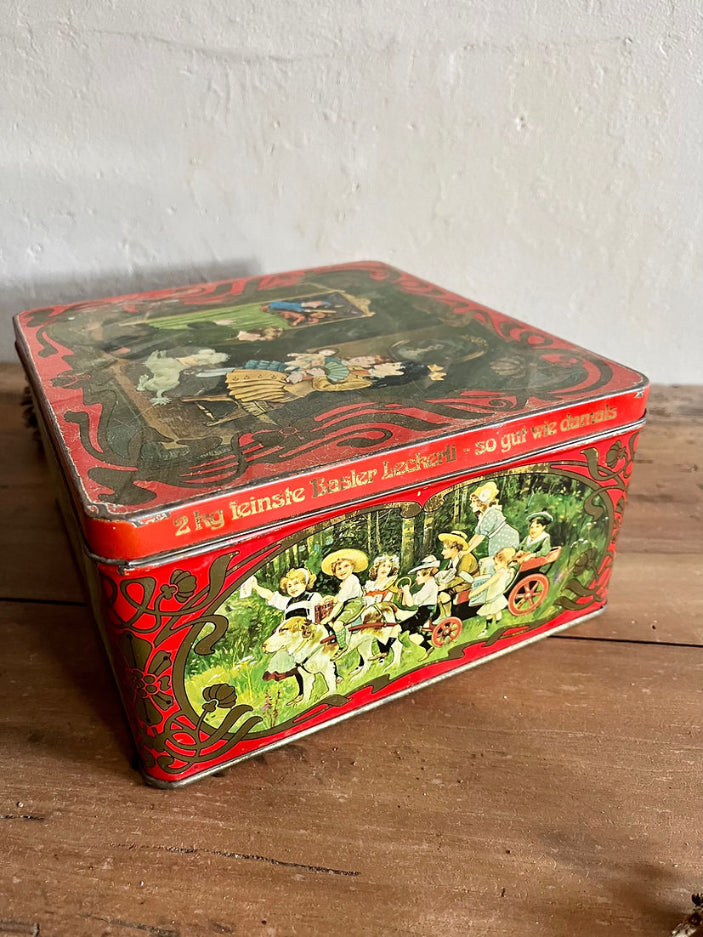 Boîte en métal vintage des années 50. Un objet déco ancien qui accueillera cartes postales, petits gâteaux, jouets ou tout simplement à exposer. Joli motif représentant un spectacle de Guignol. La boîte est joliement patiné par le temps ce qui lui confère tout son charme. Dimensions 22x23xH11,5cm