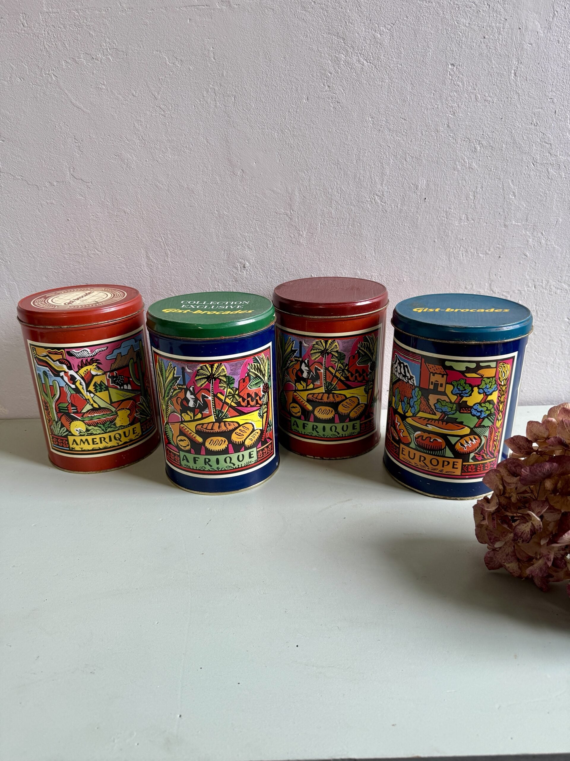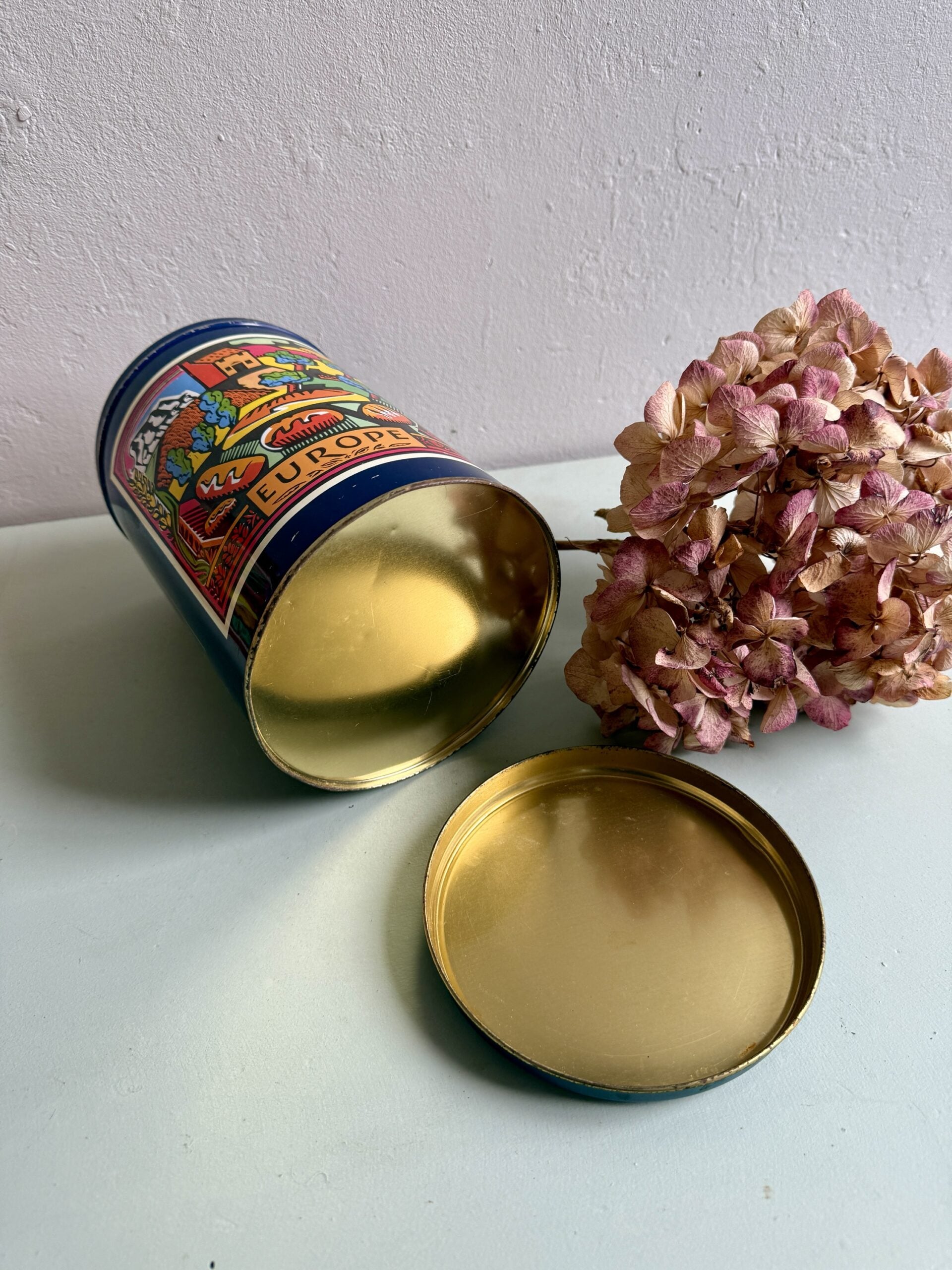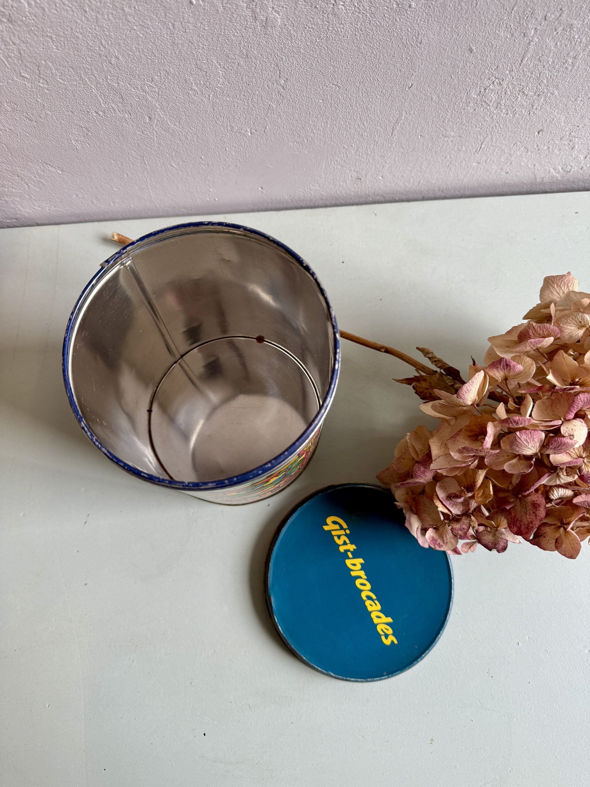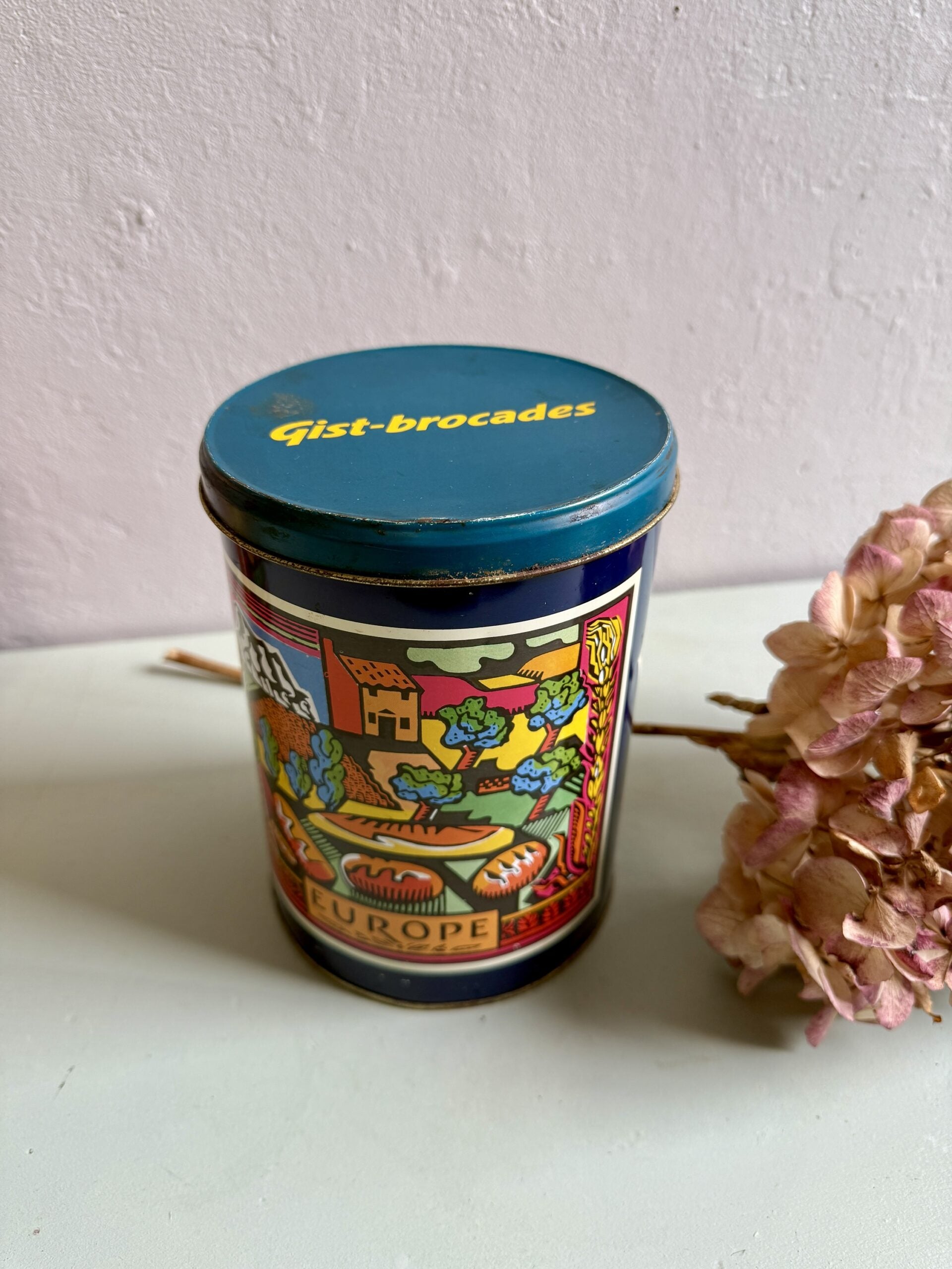 Boîte cylindrique en métal en bleu, illustrée de motifs colorés représentant deux continents ainsi que des scènes de paysages et de produits alimentaires. Éditée par Gist Brocades, cette boîte publicitaire témoigne de l’univers graphique vintage et constitue un bel objet de collection.