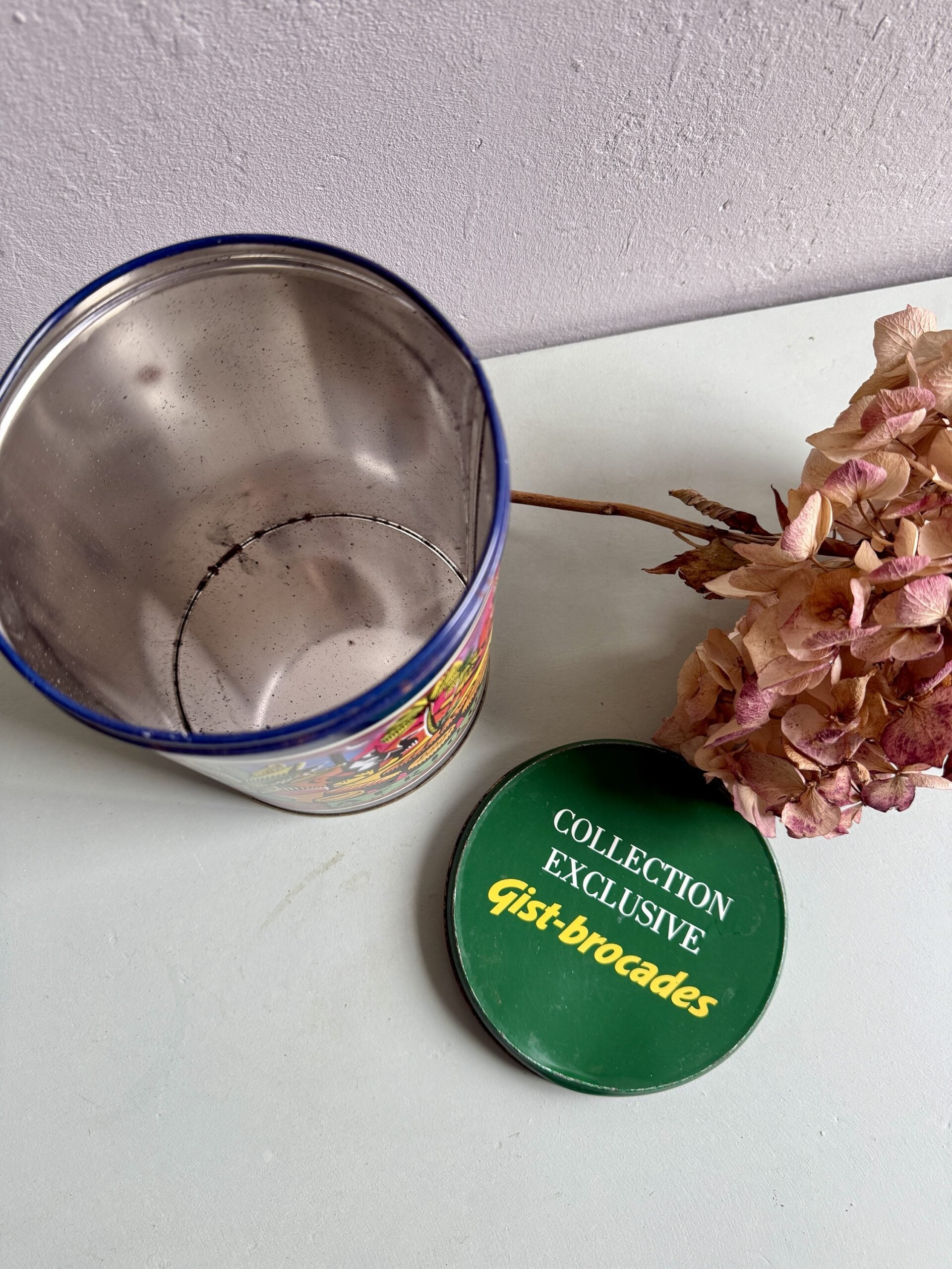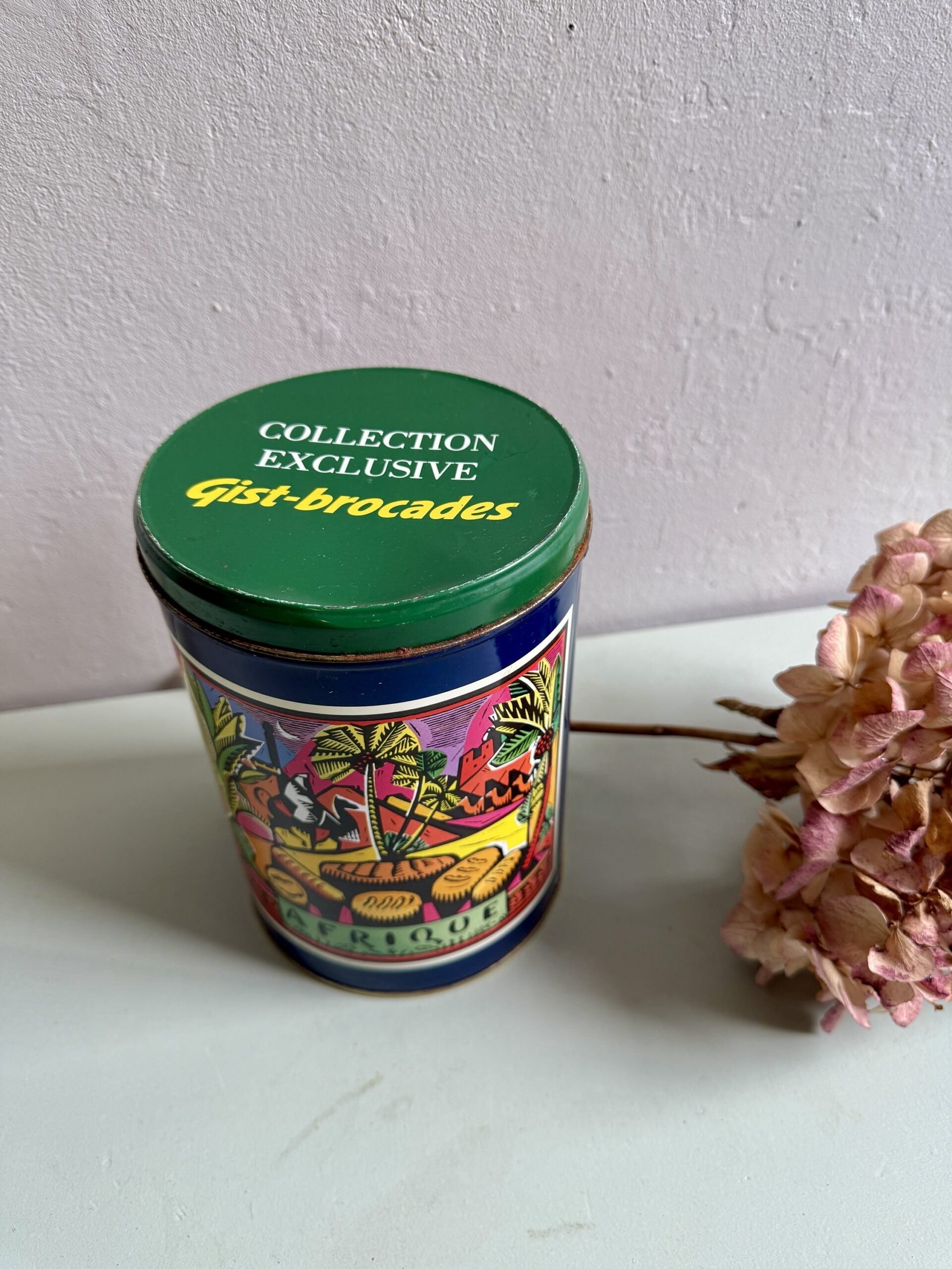 Boîte cylindrique en métal en vert et bleu, illustrée de motifs colorés représentant deux continents ainsi que des scènes de paysages et de produits alimentaires. Éditée par Gist Brocades, cette boîte publicitaire témoigne de l’univers graphique vintage et constitue un bel objet de collection.