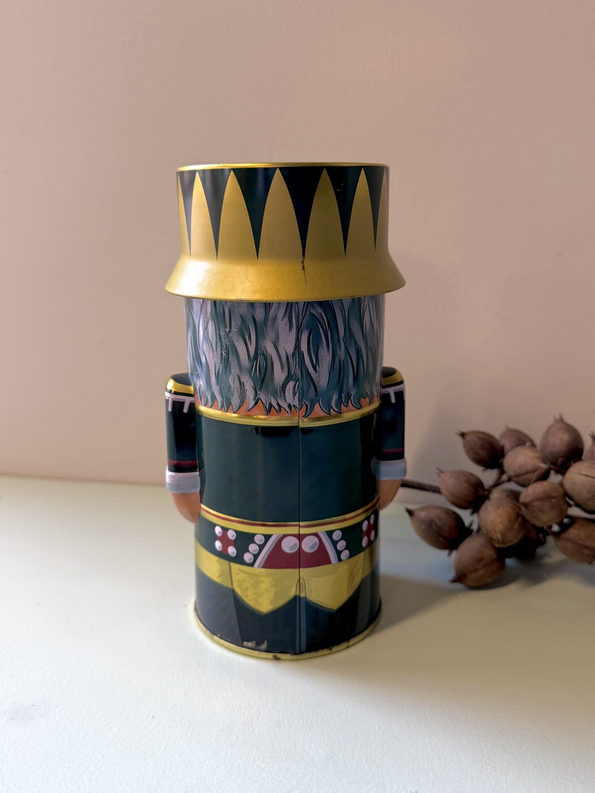 Boîte métallique ancienne en forme de casse-noisette, peinte avec un décor coloré typique des objets de Noël traditionnels. Silhouette cylindrique, visage marqué, uniforme graphique : une pièce qui évoque immédiatement l’univers des Noëls d’antan, entre décoration populaire et esprit festif.Cette boîte décorative peut être utilisée pour ranger quelques friandises, des petits objets ou simplement être exposée telle quelle sur une étagère, une console ou au pied du sapin. Plus qu’un simple contenant.