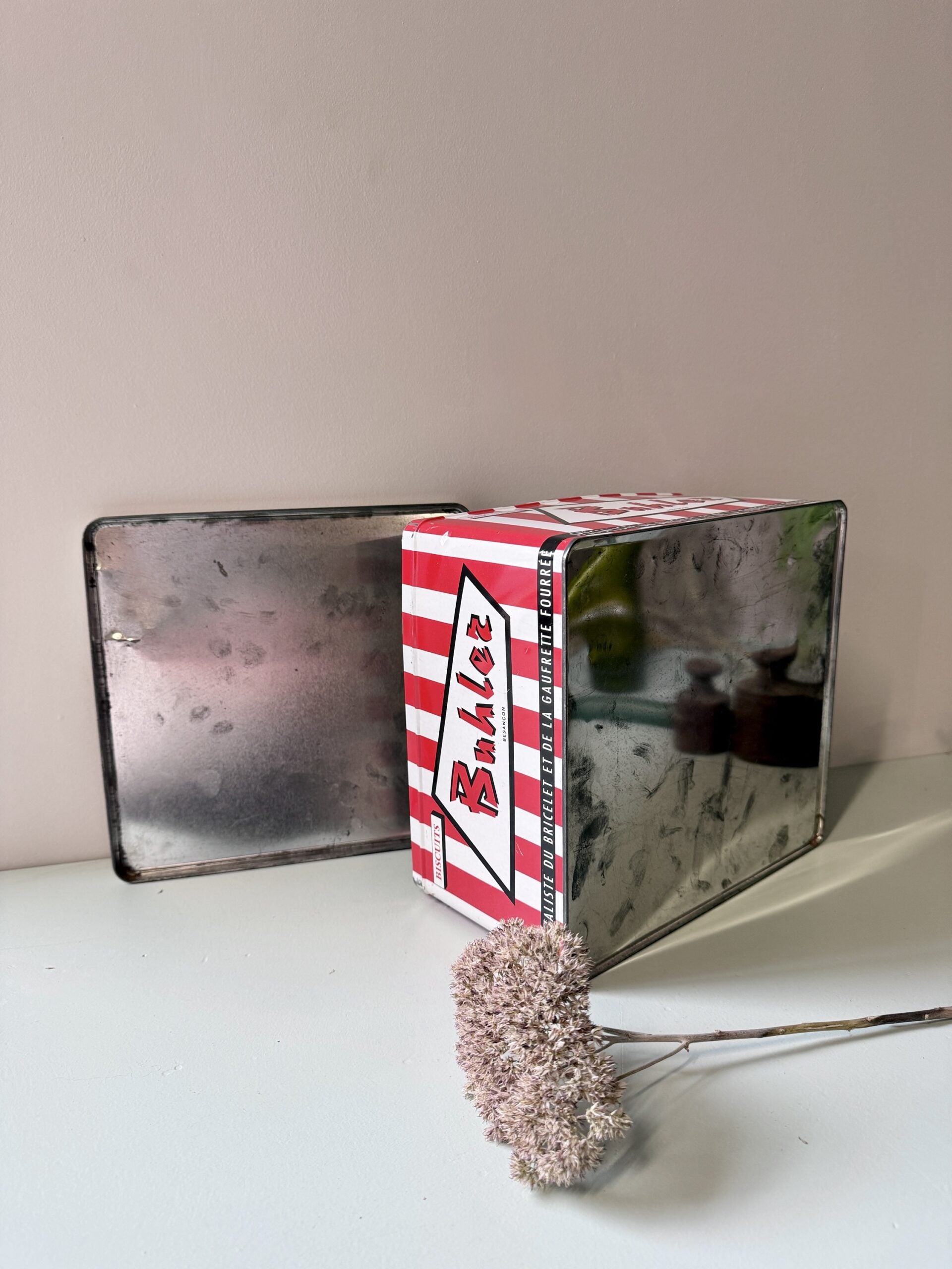 Boîte vintage en métal de la biscuiterie Buhler, maison bisontine spécialisée dans le bricelet et la gaufrette fourrée. Le graphisme rayé rouge et blanc est typique des emballages alimentaires du milieu du XXe siècle et fonctionne très bien en déco.À utiliser en boîte de rangement dans une cuisine, pour des torchons, du vrac sec ou des ustensiles, mais aussi détournée dans une entrée ou un bureau pour y glisser papiers, photos ou petits objets. Elle peut aussi se poser sur une étagère, seule ou intégrée dans une accumulation de boîtes anciennes.