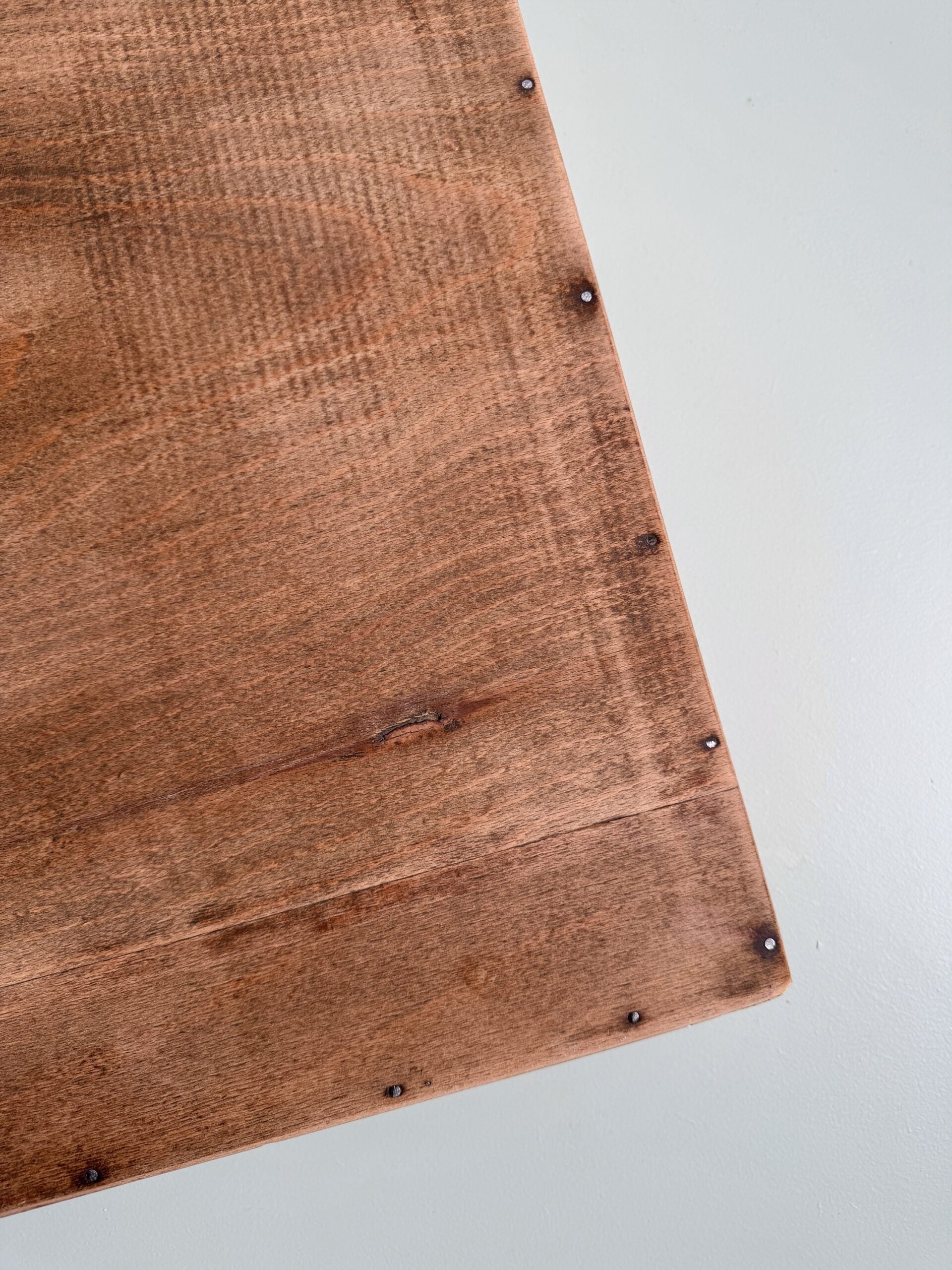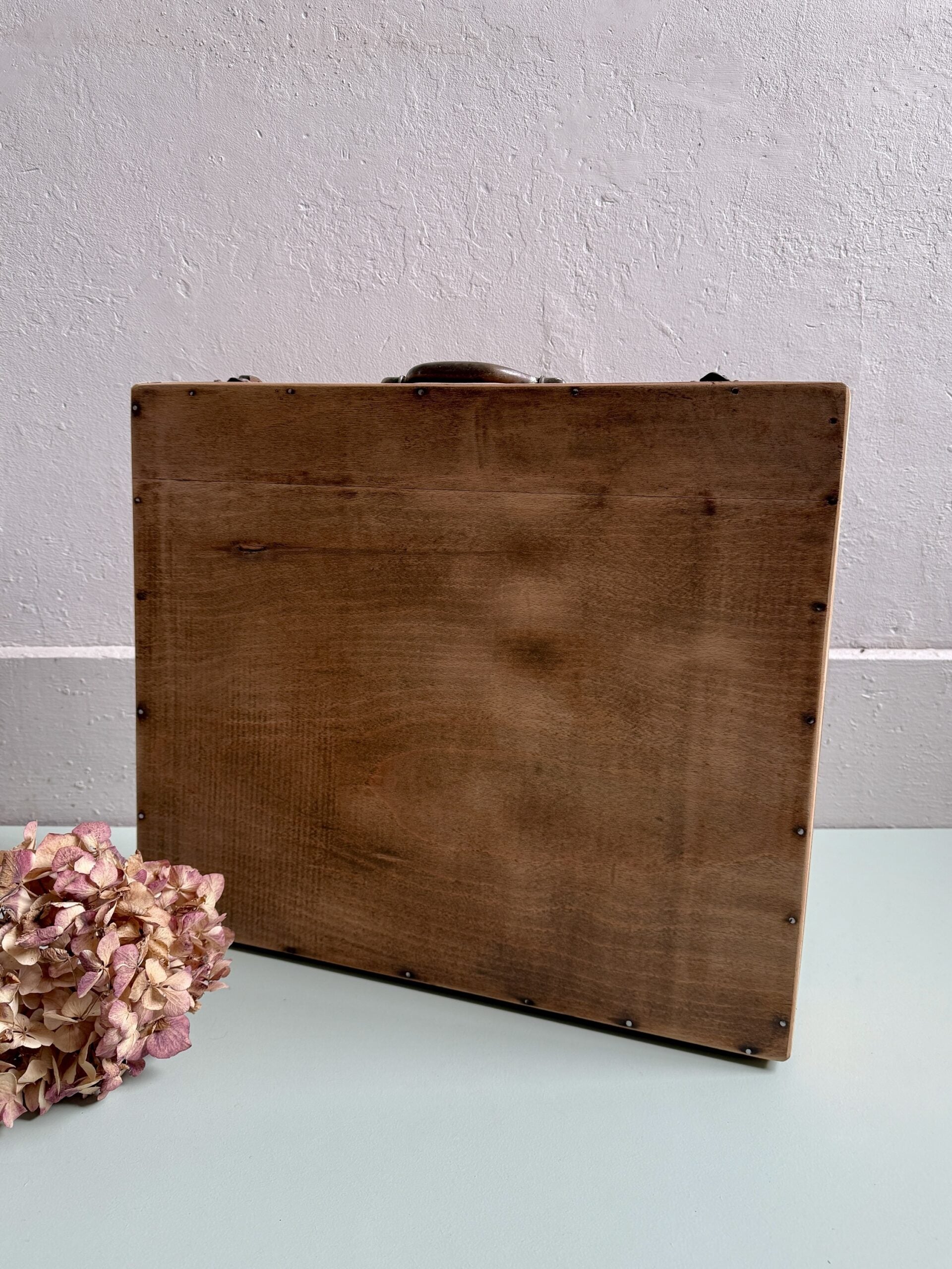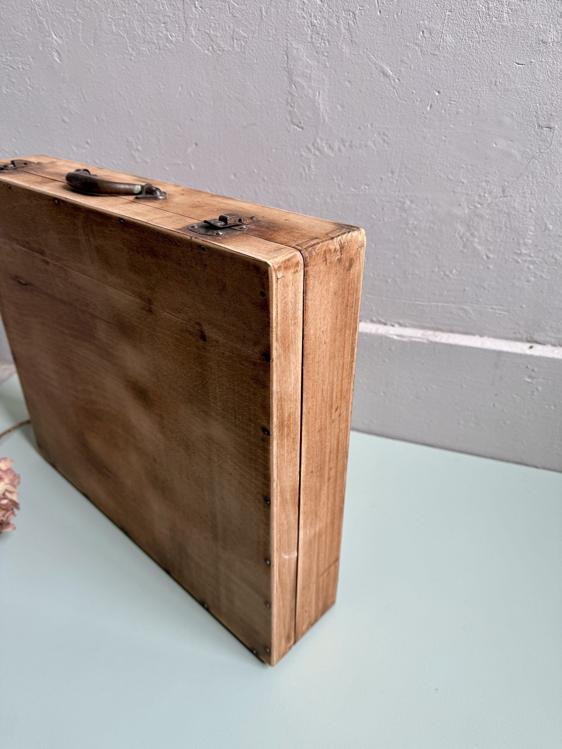 Valise ancienne en bois, avec intérieur peint en beige. Elle peut être utilisée ouverte ou fermée, selon l’usage. On l'imagine bien détournée en boîte à pain ou pour ranger vos petits trésors, des papiers, des photos ou des petits objets. Peut aussi être posée sur une étagère, un meuble ou détournée en rangement décoratif. Une pièce simple, facile à intégrer dans un intérieur.