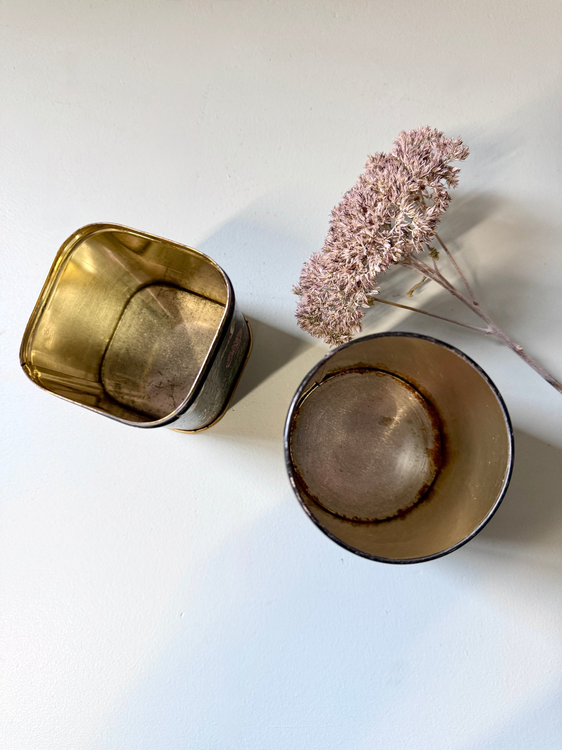 Lot de deux boîtes anciennes en métal au décor d’inspiration asiatique, mêlant oiseaux, fleurs et frises graphiques sur fond sombre. Leur patine marquée, avec usure et traces d’oxydation, raconte leur histoire et leur donne beaucoup de caractère. À utiliser pour ranger bijoux, petits trésors ou accessoires du quotidien, ou simplement à poser sur une étagère pour apporter une touche décorative pleine de personnalité. Deux formats complémentaires qui fonctionnent très bien ensemble.