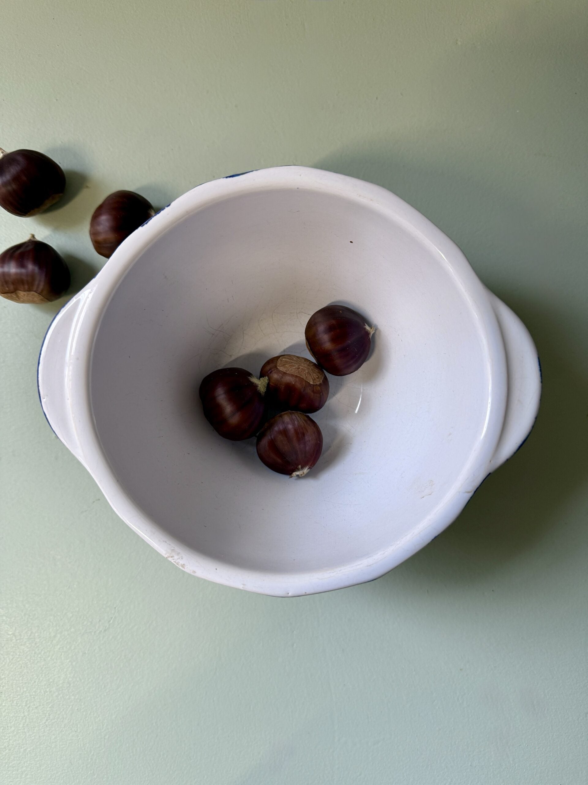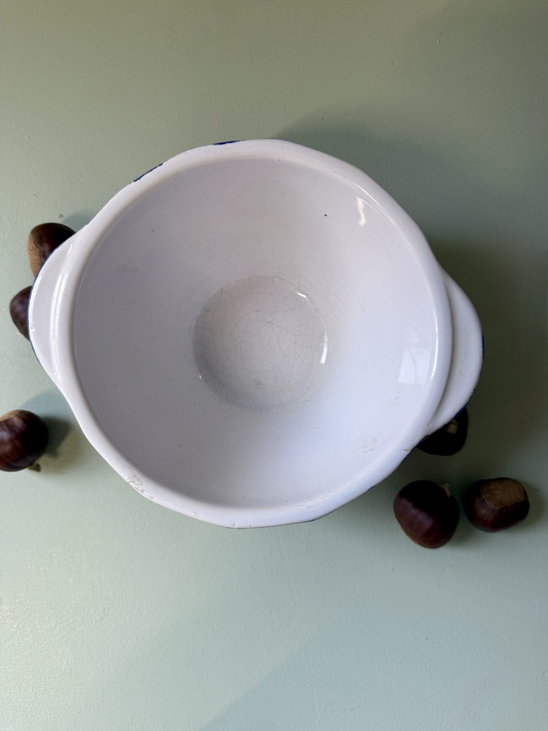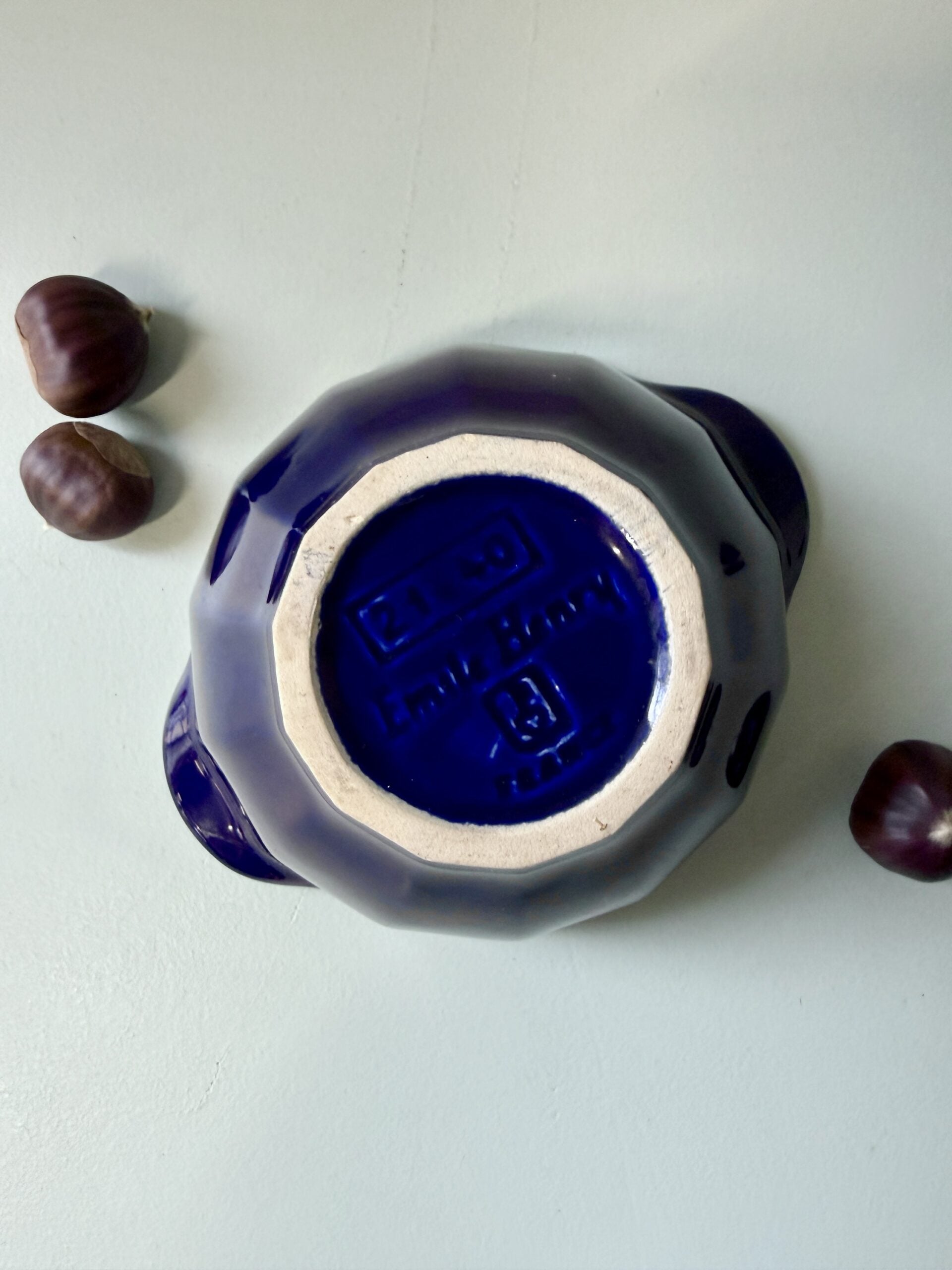 Bol émaillé blanc et bleu signé Emile Henry France