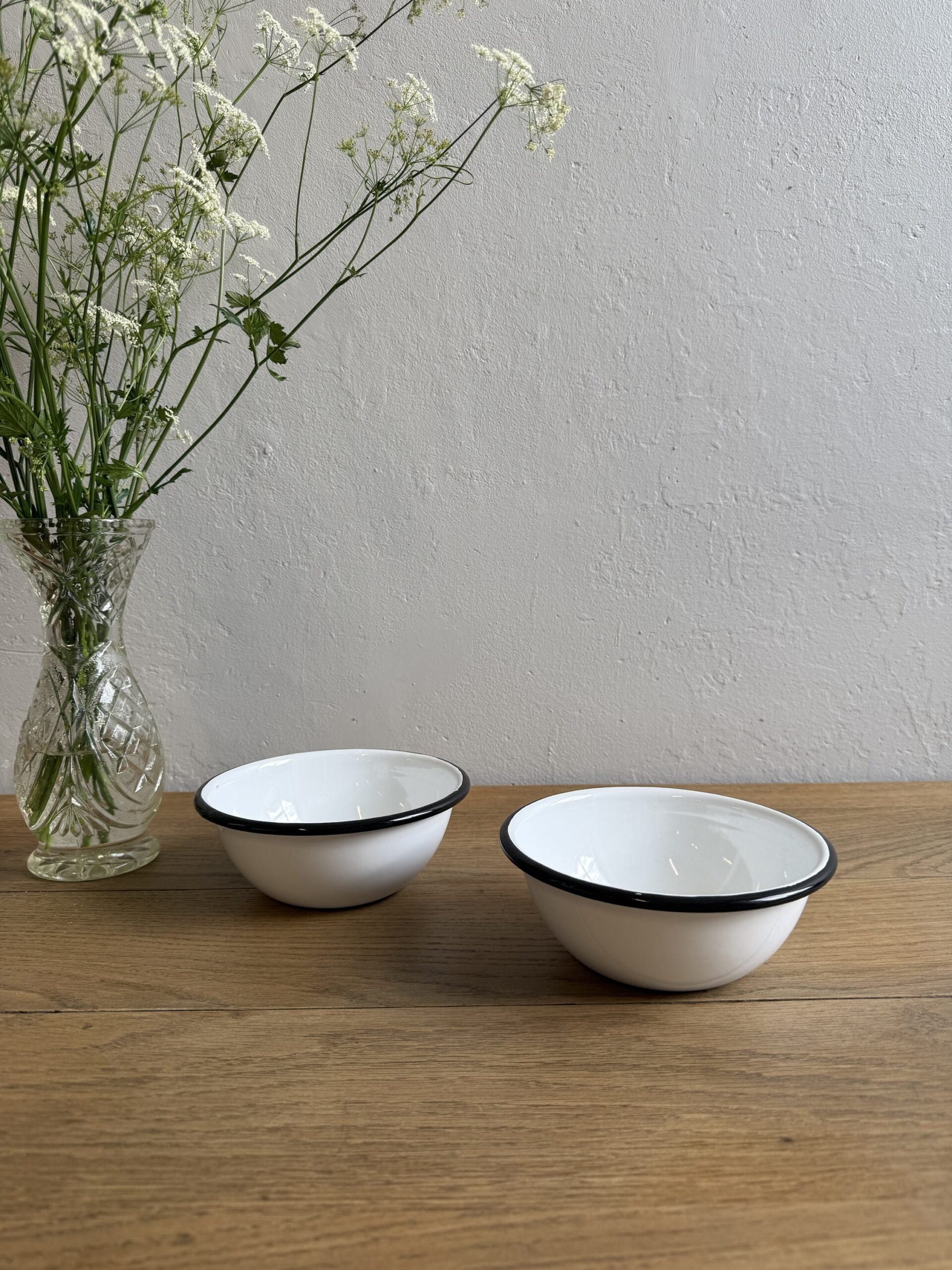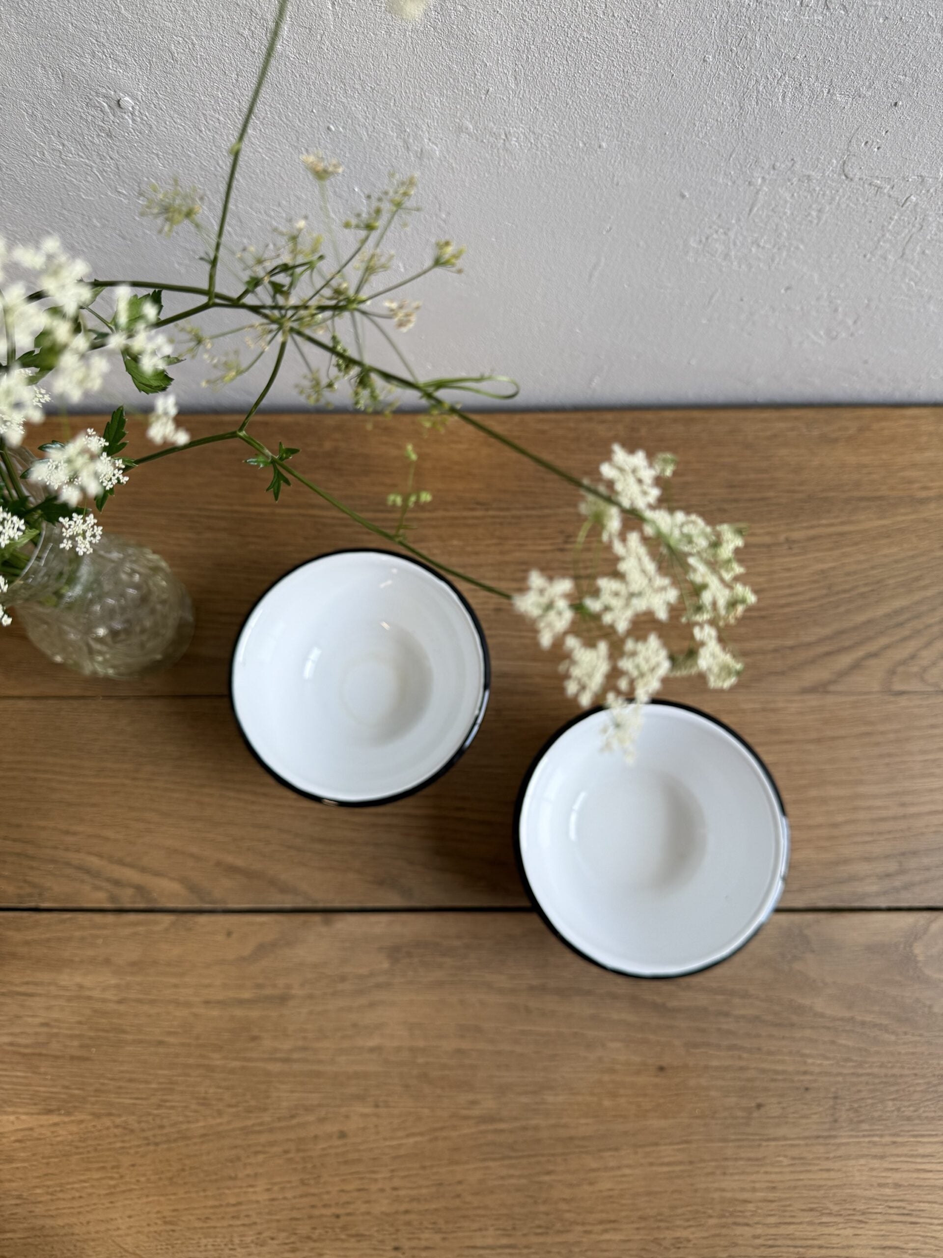 Ensemble de 2 bols en métal blanc avec une élégante bordure noire, signés Argon Tableware.