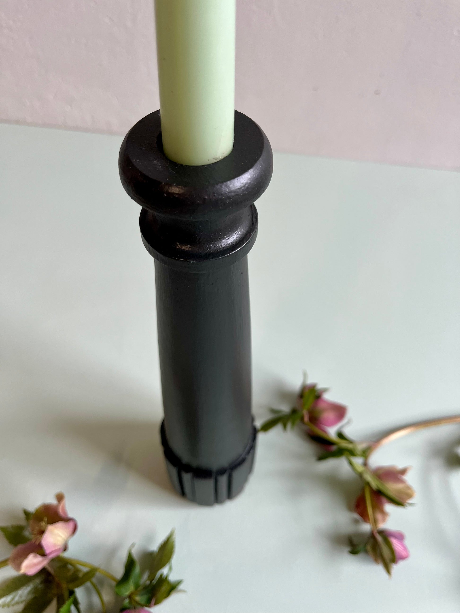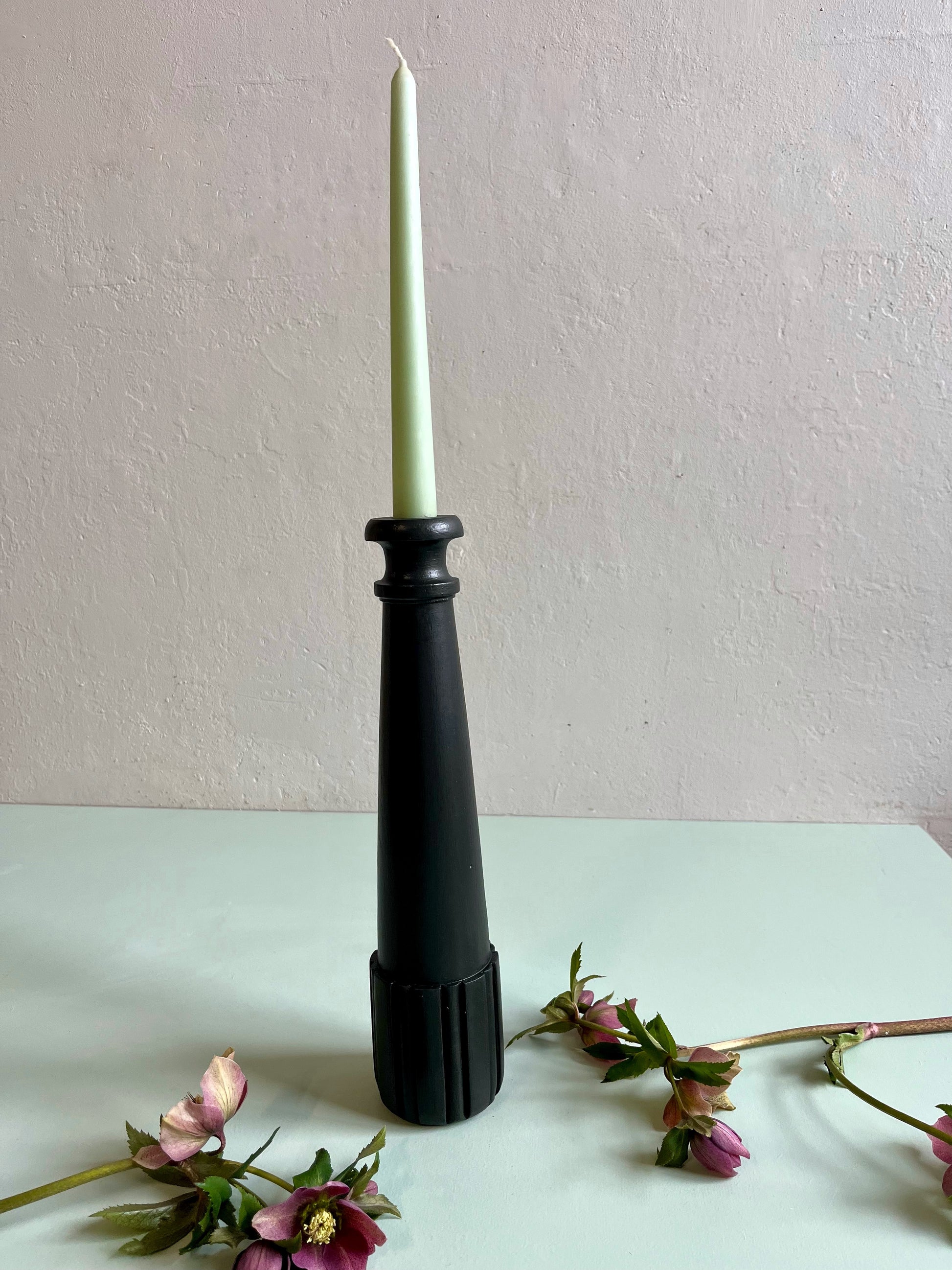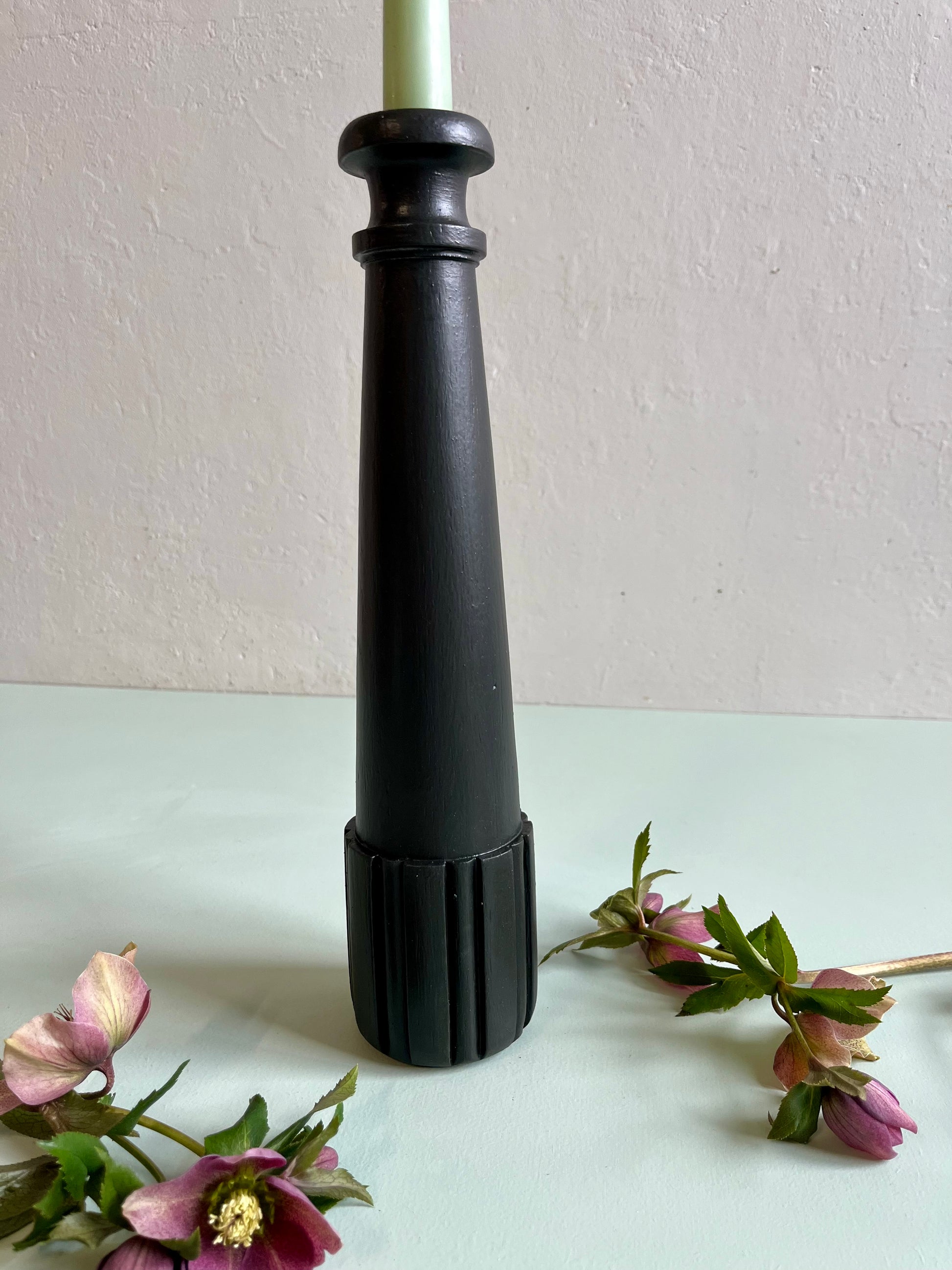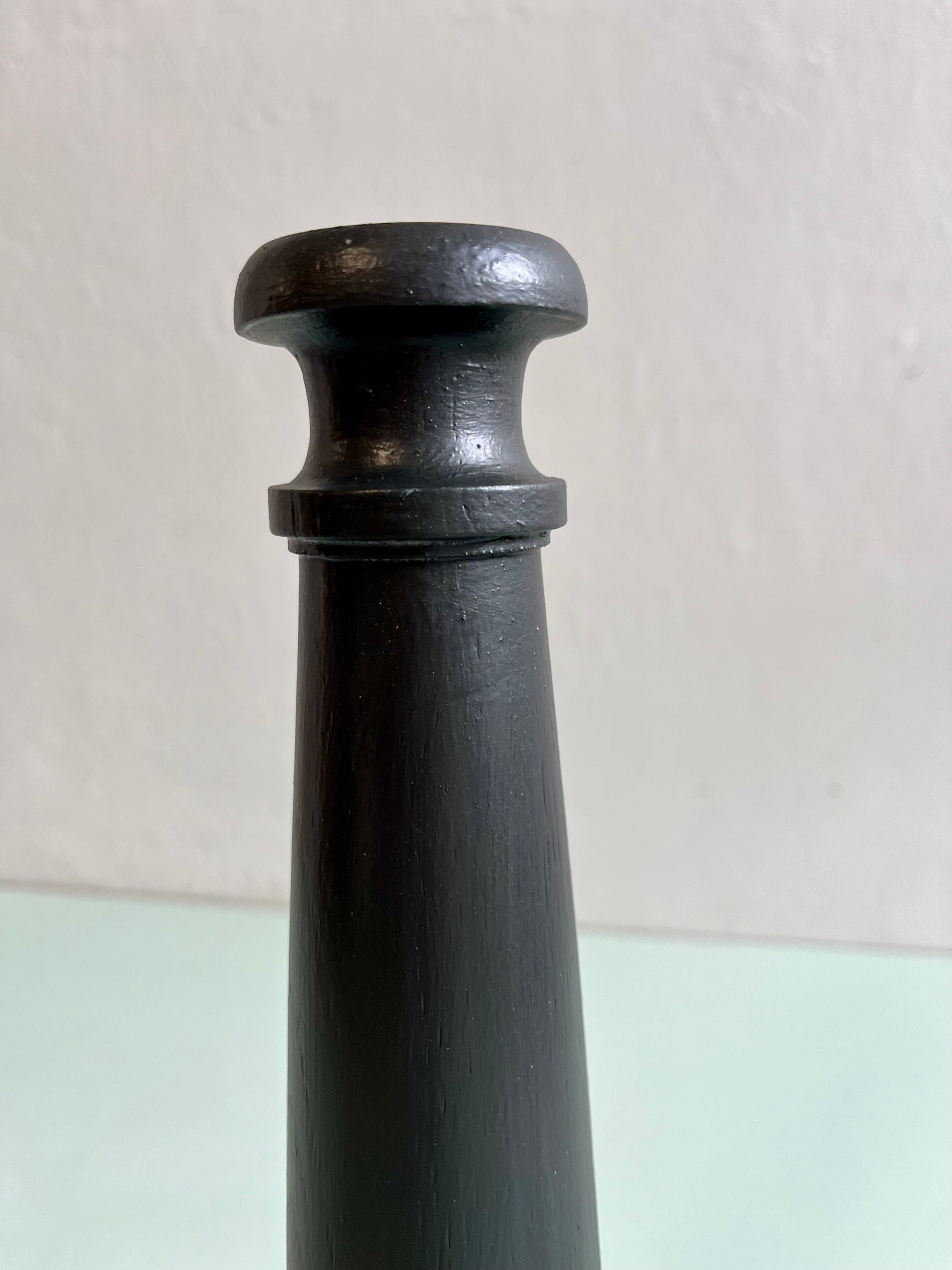 Ponçage complet puis peinture noire appliquée pour lui donner une nouvelle vie tout en gardant la belle silhouette du bois tourné. La base cannelée apporte un joli relief et un style graphique qui ressort particulièrement avec cette teinte sombre.