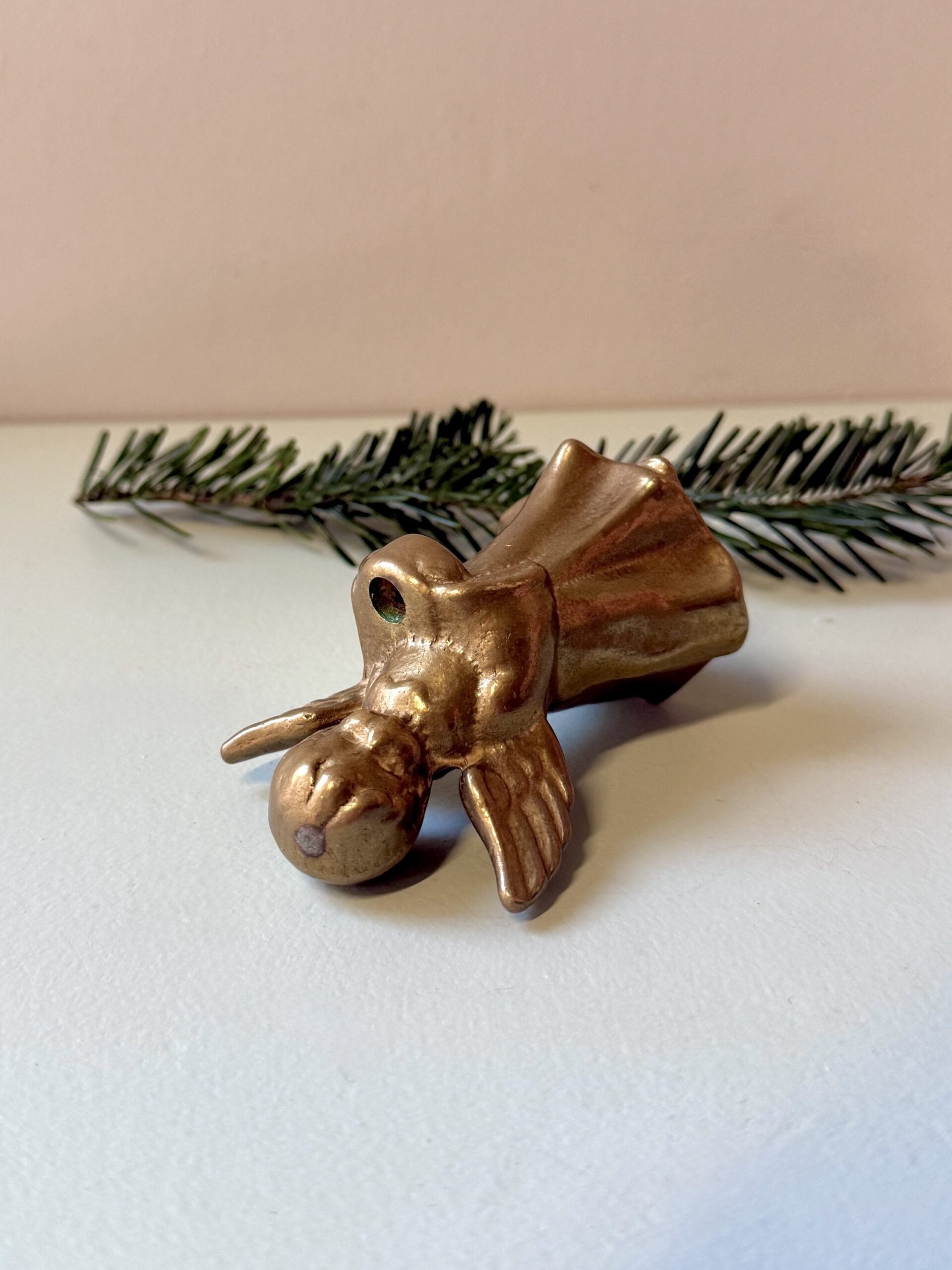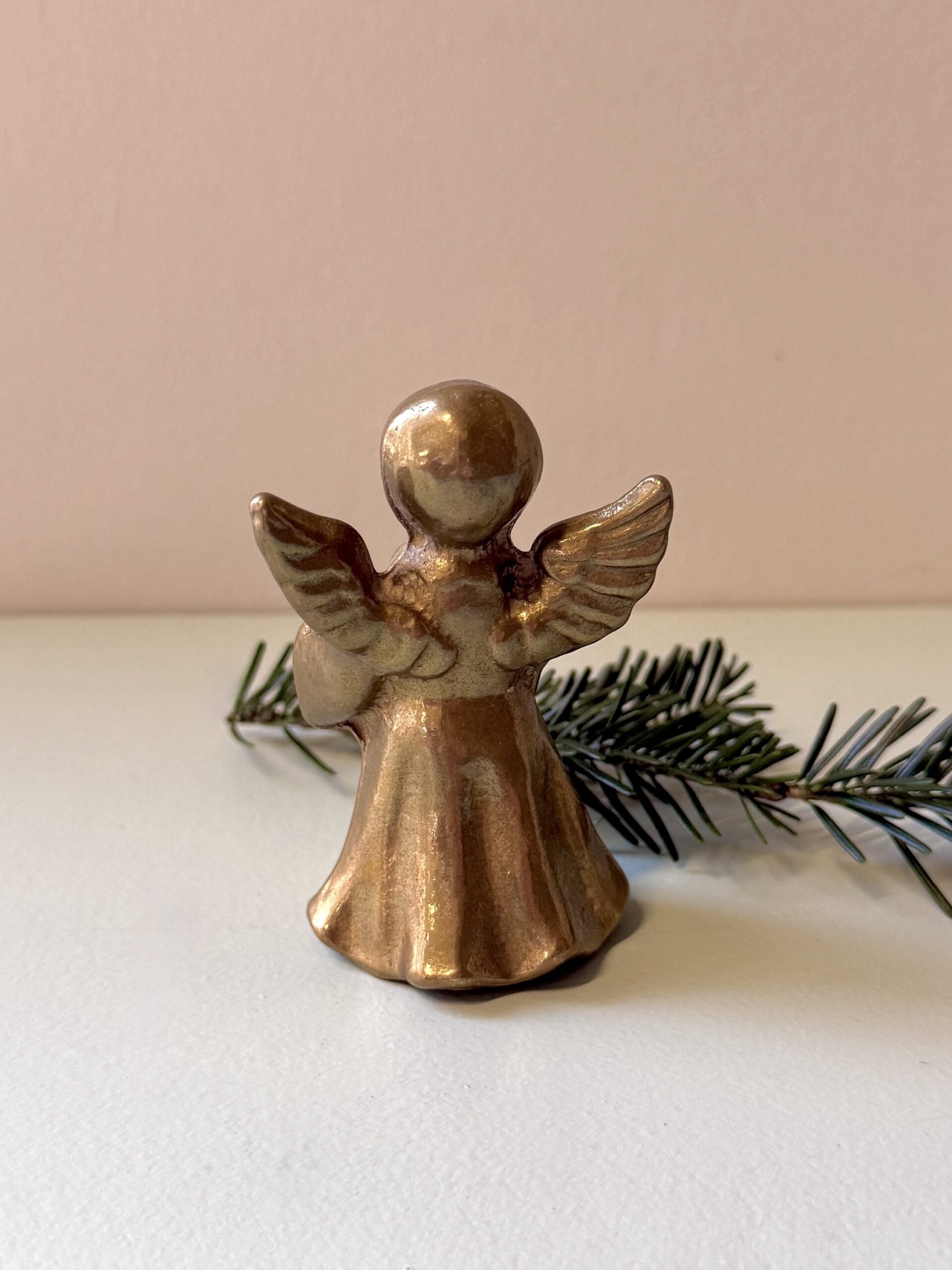 La finition dorée, légèrement patinée par le temps, capte joliment la lumière et donne à cet ange une présence discrète mais expressive. À utiliser avec une bougie chauffe-plat ou simplement comme petit objet décoratif.