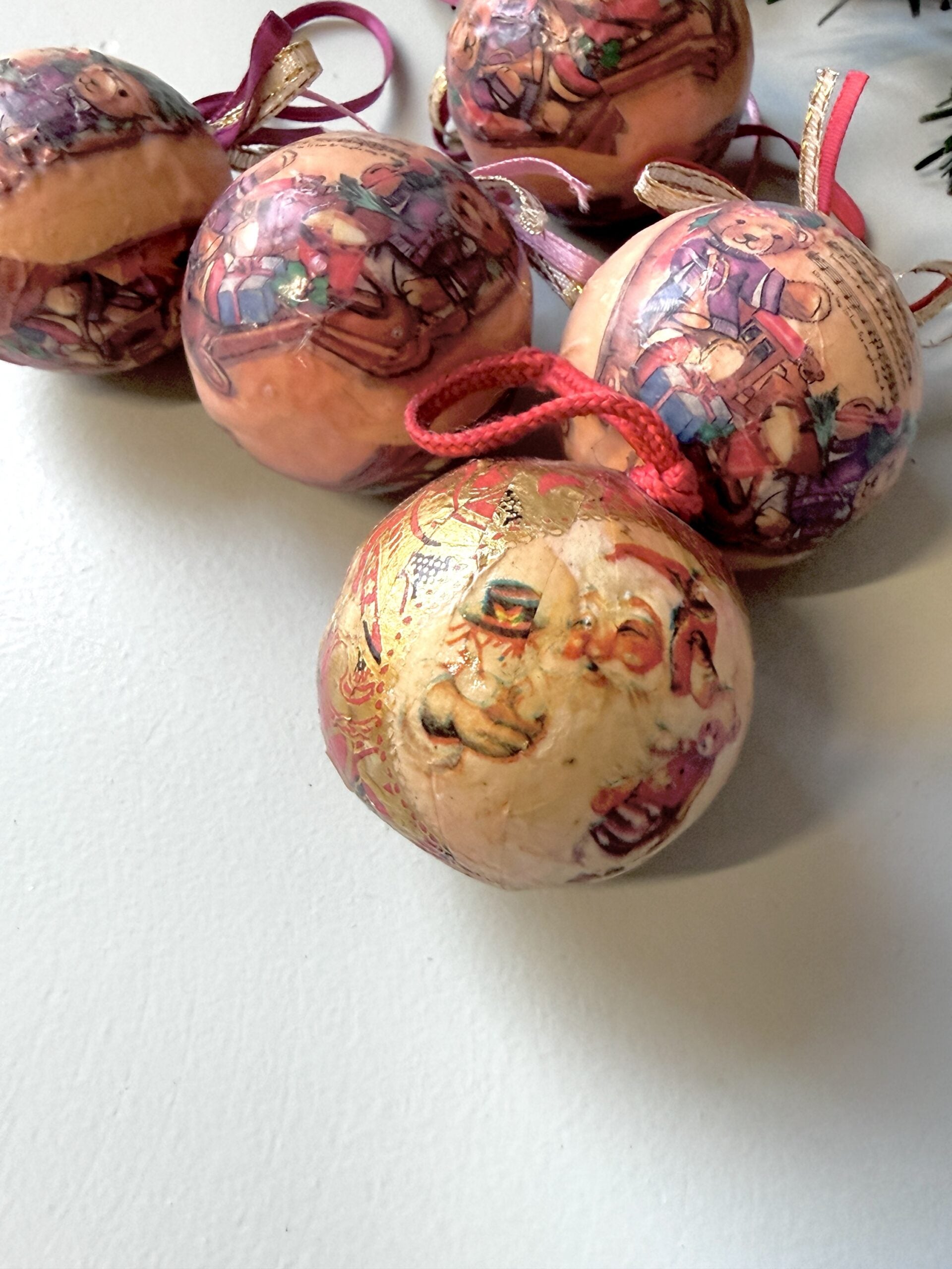 Lot de 5 boules de Noël anciennes en carton – décor Pères Noël