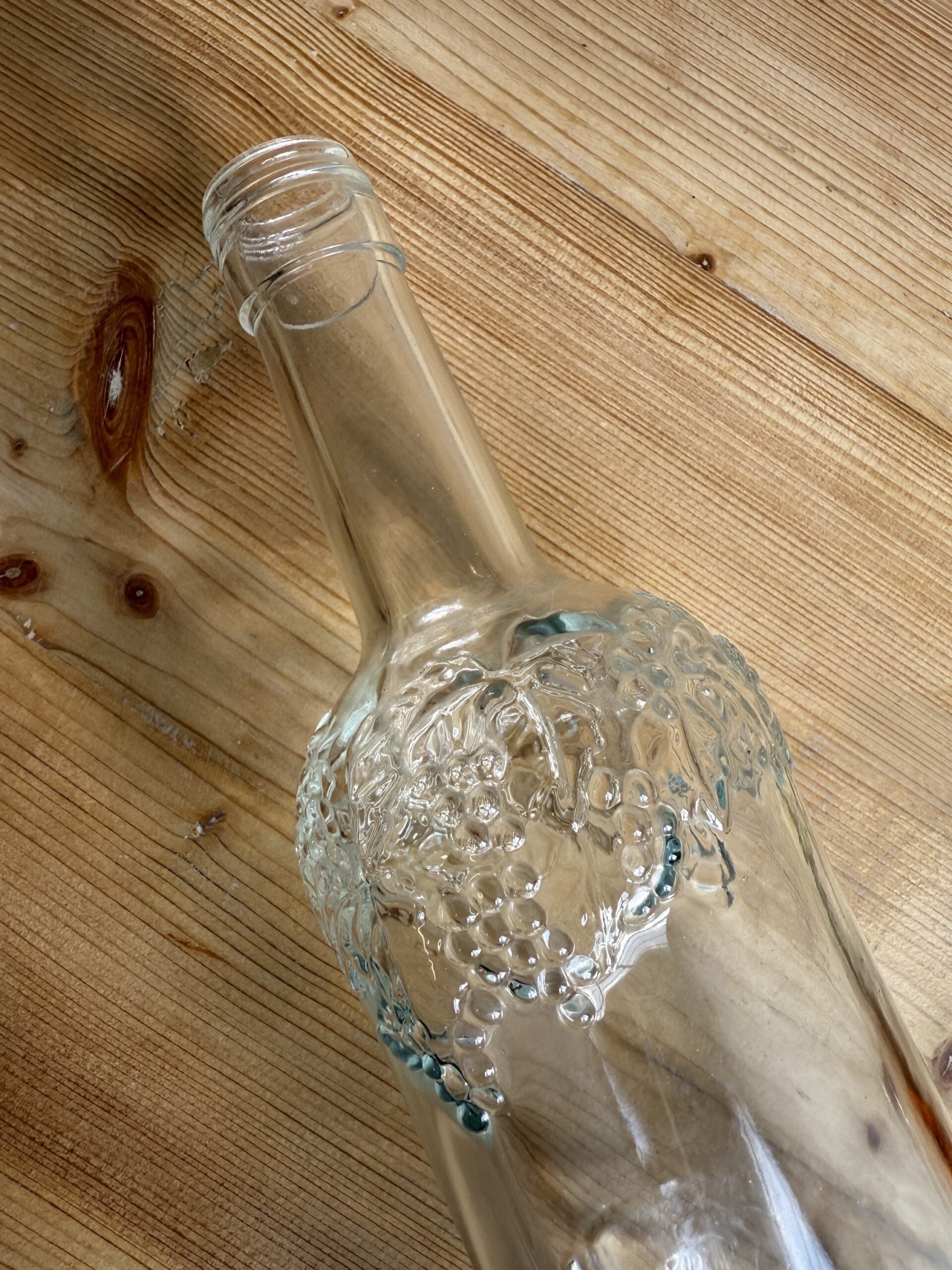 Bouteille en verre transparent décorée d’un motif taillé représentant des grappes de raisin. Elle est accompagnée de son bouchon en métal ancien, marqué par le temps, qui permet de l’utiliser comme vinaigrier.