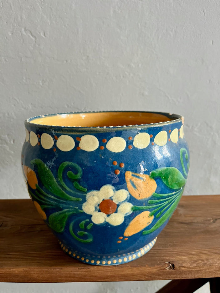 Ce superbe cache pot en terre cuite émaillée est typique des poteries alsaciennes de Soufflenheim. Ses couleurs et motifs sont intacts mais vous constatez sur les photos qu’il présente plusieurs fêlures. Ce pot ancien n’en reste pas moins superbe. Dimensions Diamètre 20 x hauteur 18cm