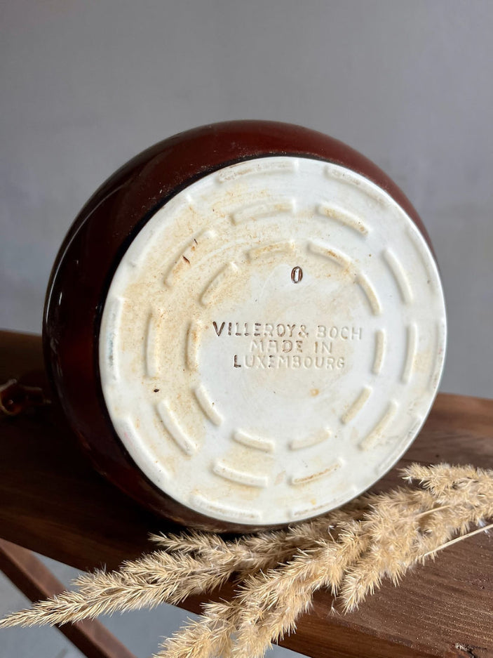 Grande cafetière ou théière en céramique Villeroy et Boch des années 60. Fabriquée au Luxembourg Coloris marron glacé. Un éclat au niveau du bec. Dimensions Diamètre 16cm x hauteur 20cm