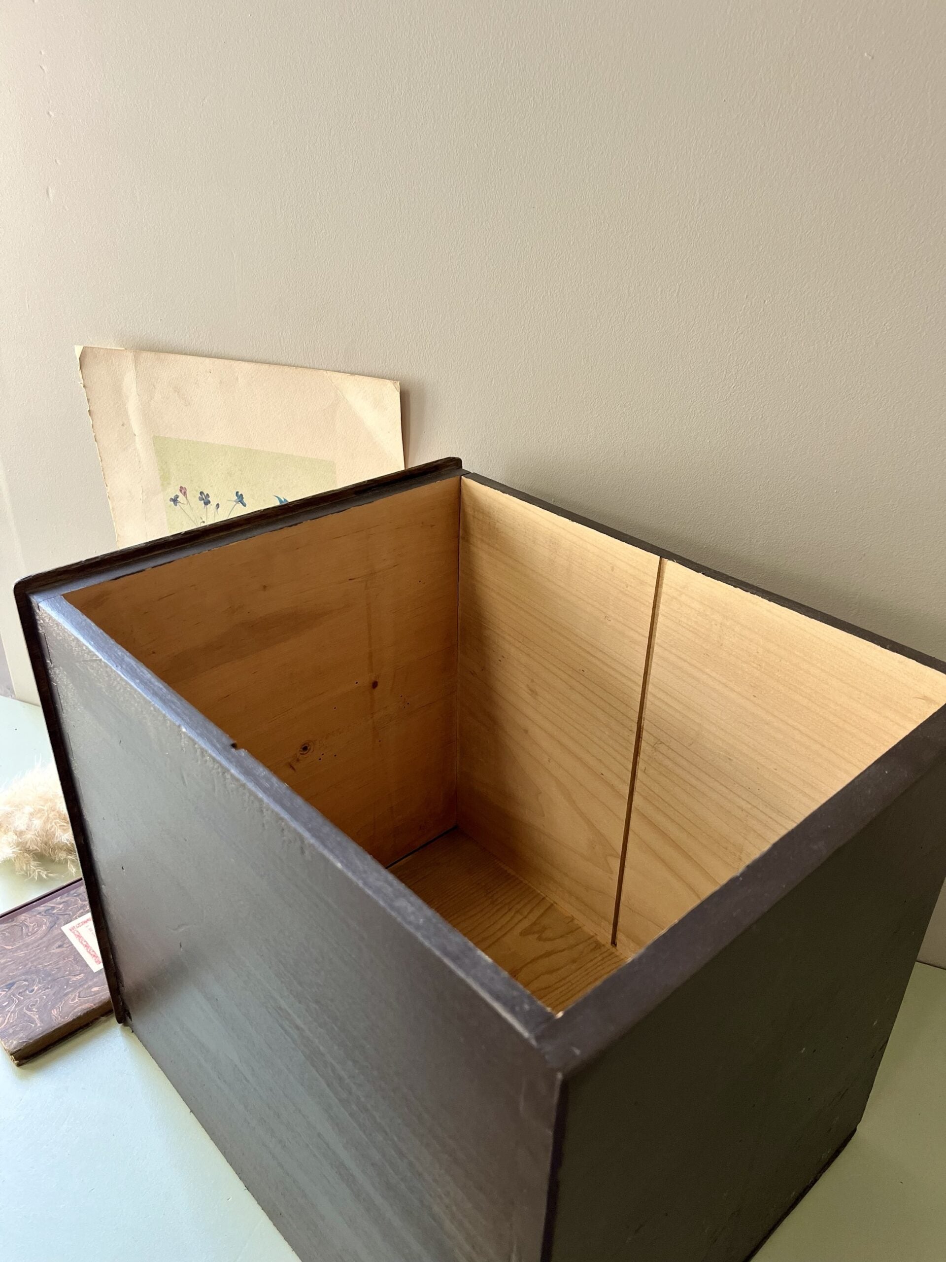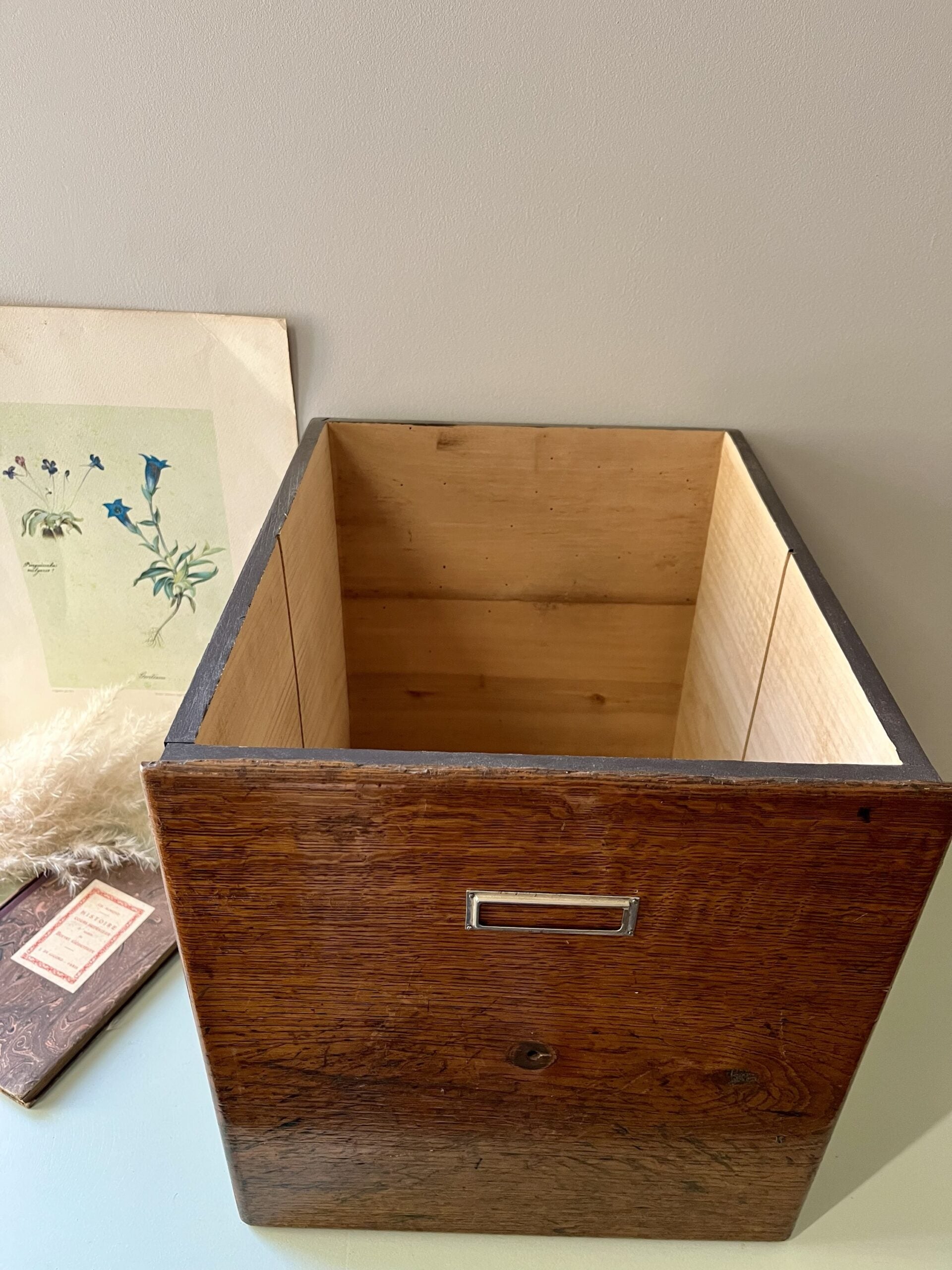 Cette caisse vintage est en réalité un ancien tiroir que nous avons soigneusement rénové et repeint en noir profond. Son look simple mais plein de caractère en fait un objet polyvalent, à la fois pratique et décoratif. Elle s’intègre facilement dans un intérieur contemporain ou un salon à l’esprit vintage.Une caisse pratique et modulable