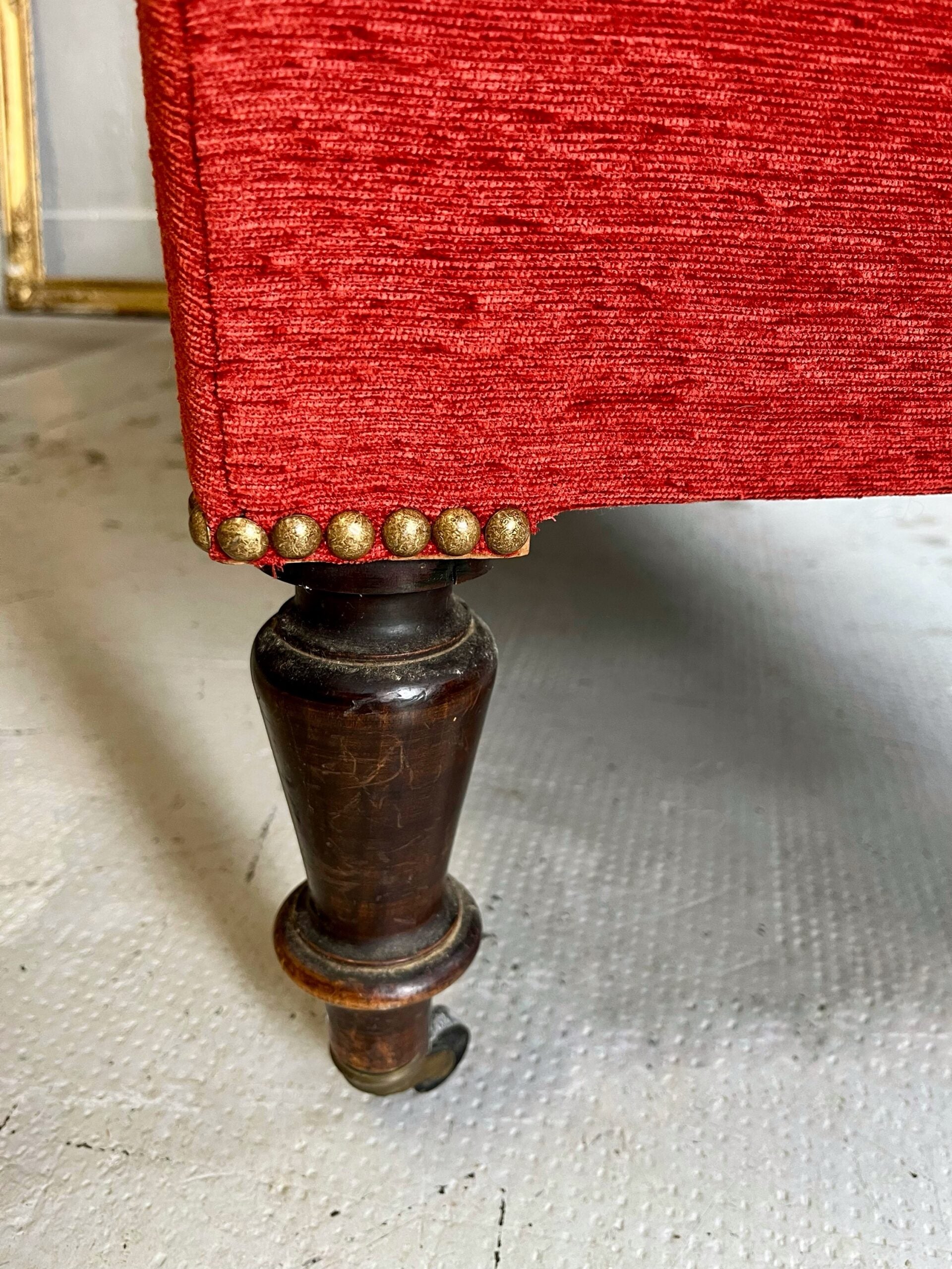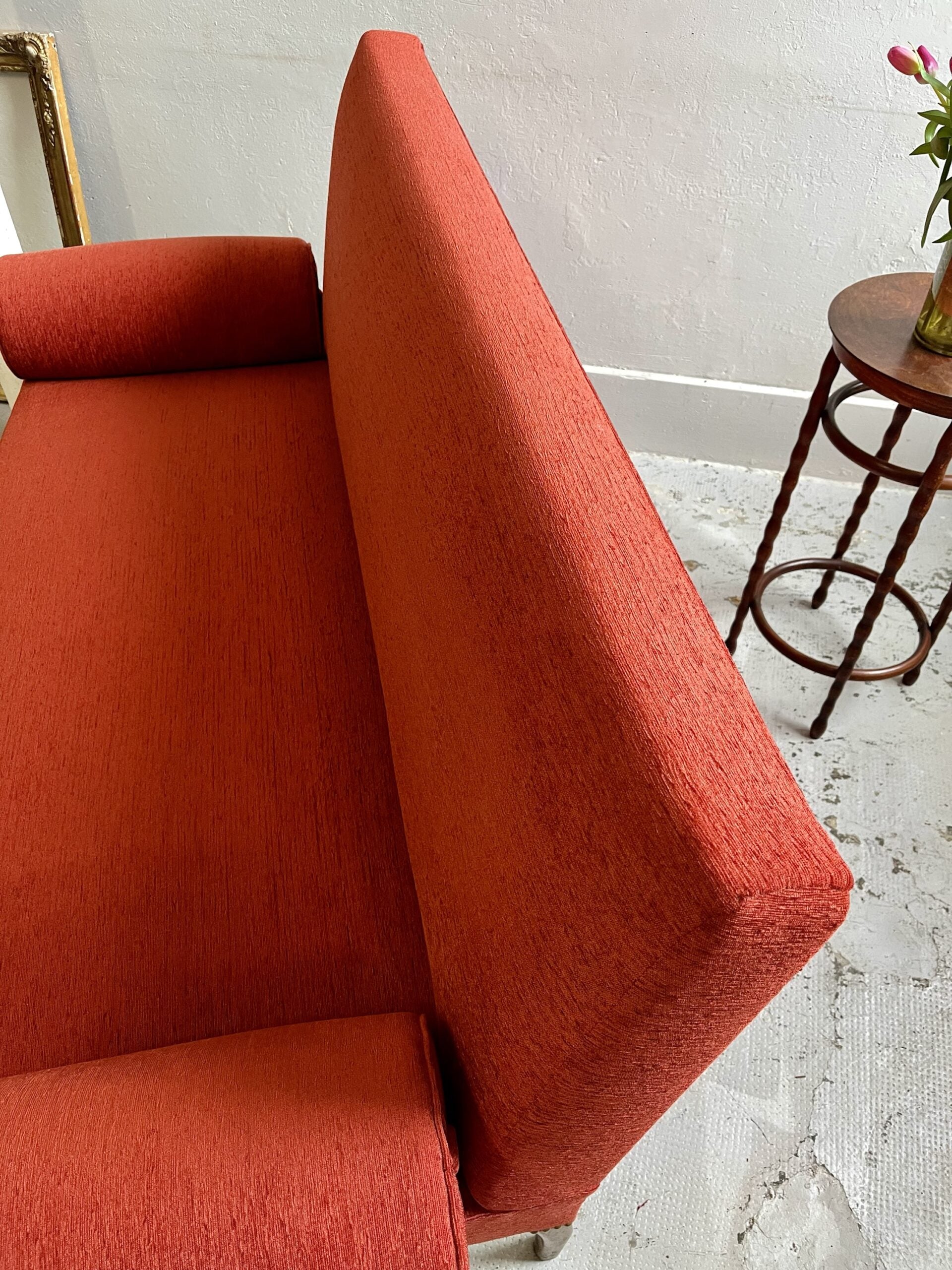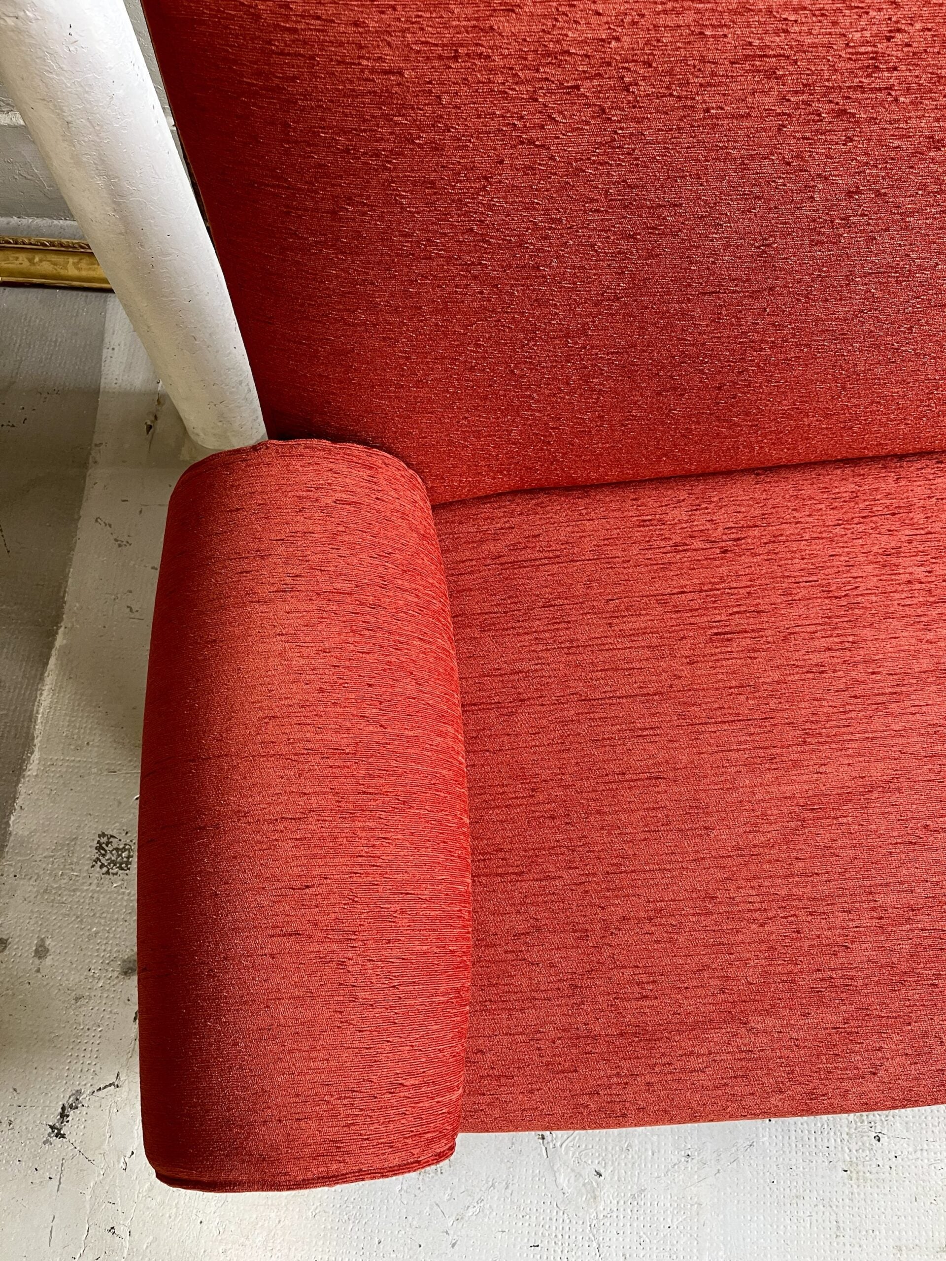 Canapé ancien de style tapissier, recouvert d’un tissu rouge orangé lumineux qui apporte tout de suite du caractère à la pièce. Les clous tapissier soulignent les lignes et rappellent les assises anciennes de salon ou de maison de famille, avec une allure assumée et chaleureuse.