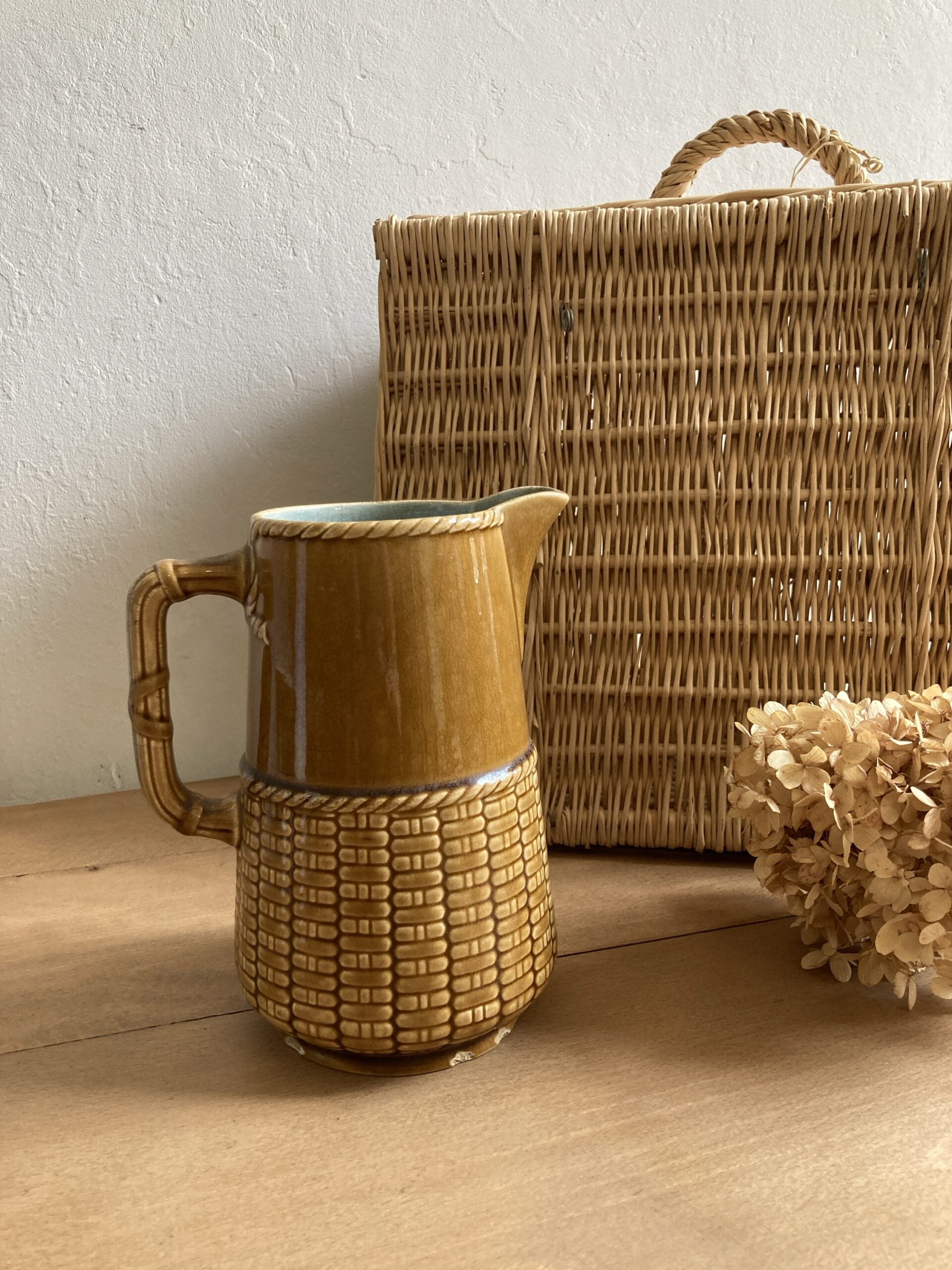 Une pièce de caractère ! Cette grande carafe en céramique émaillée allie chaleur et originalité avec son extérieur couleur miel, son relief tressé façon panier, et son intérieur bleu turquoise craquelé plein de charme. Signée Sarreguemines, elle incarne le savoir-faire français des années 60-70.