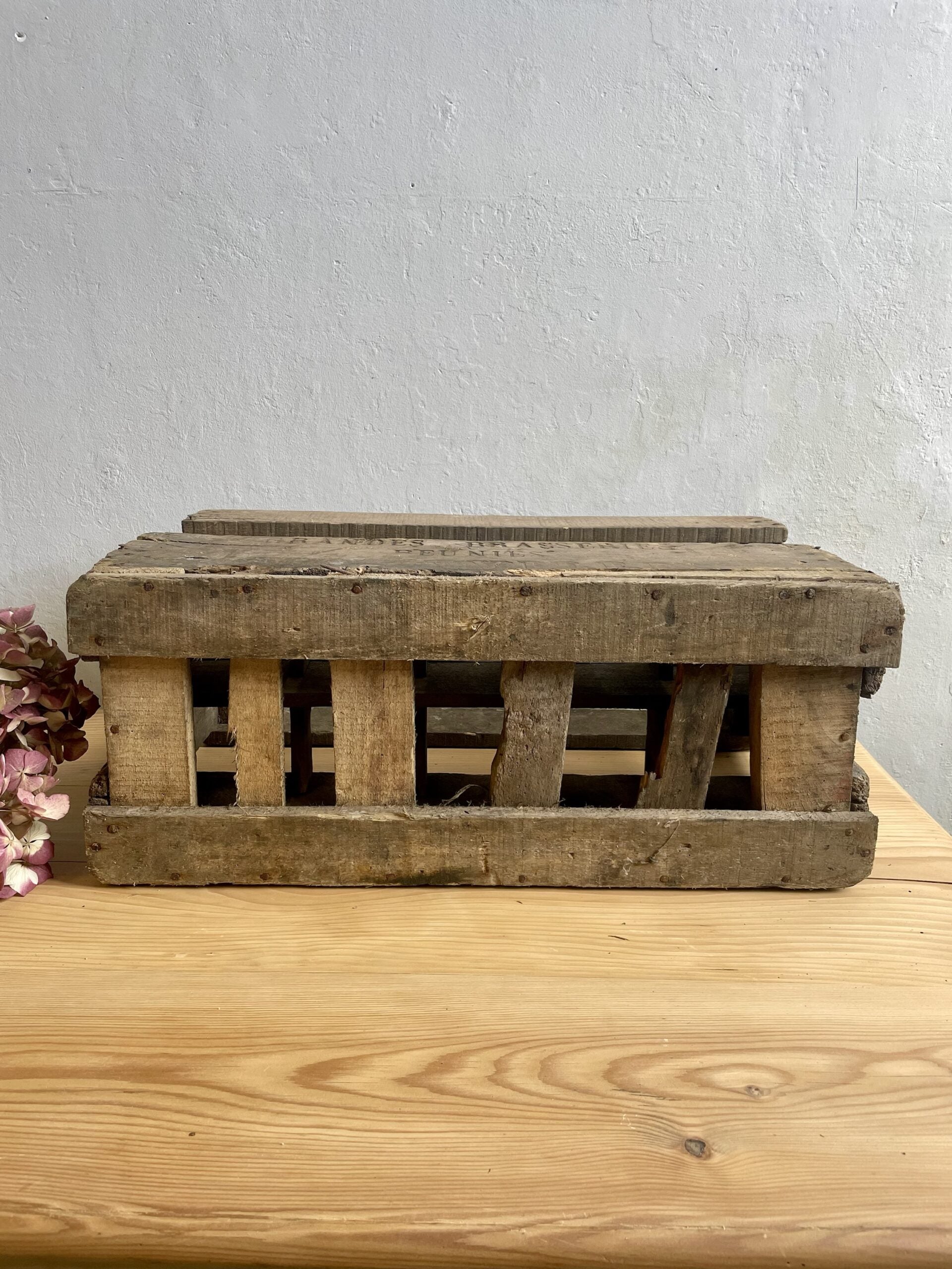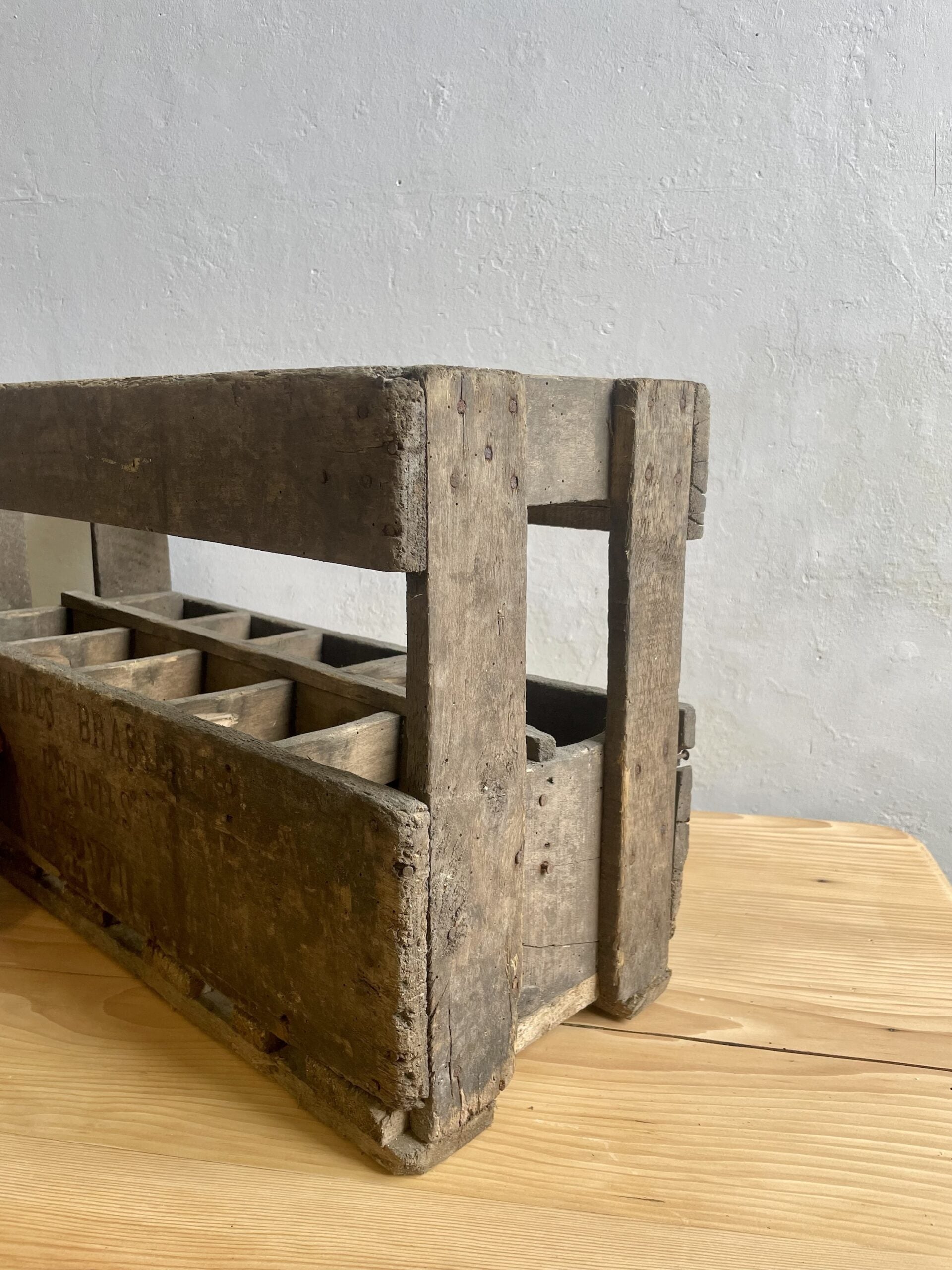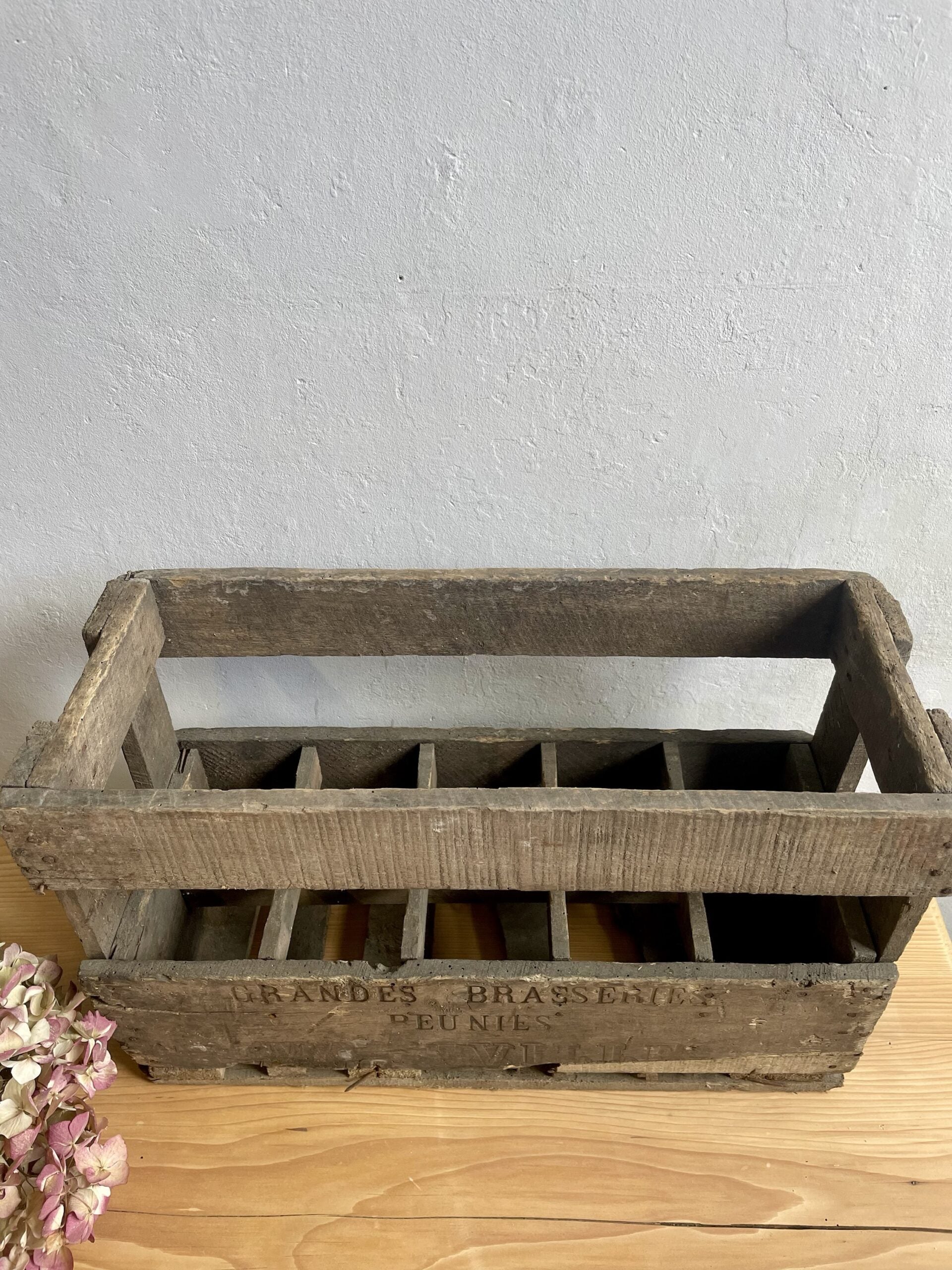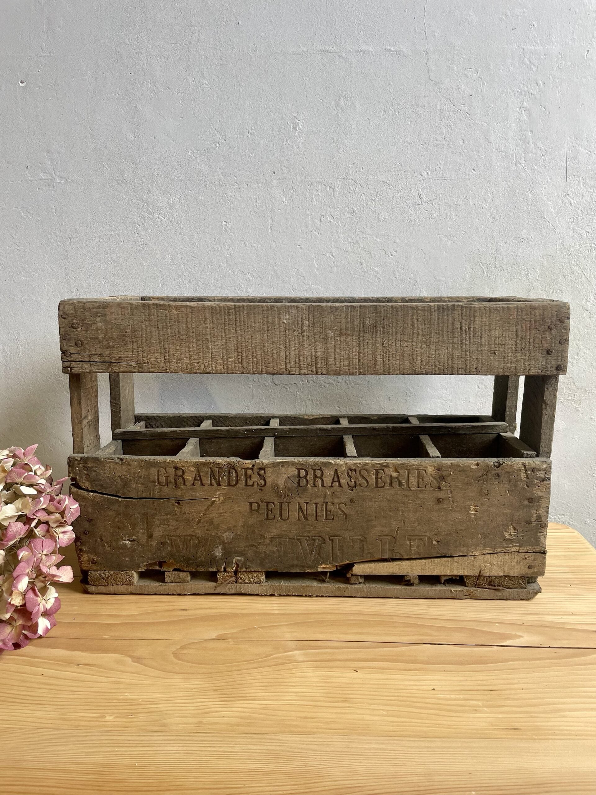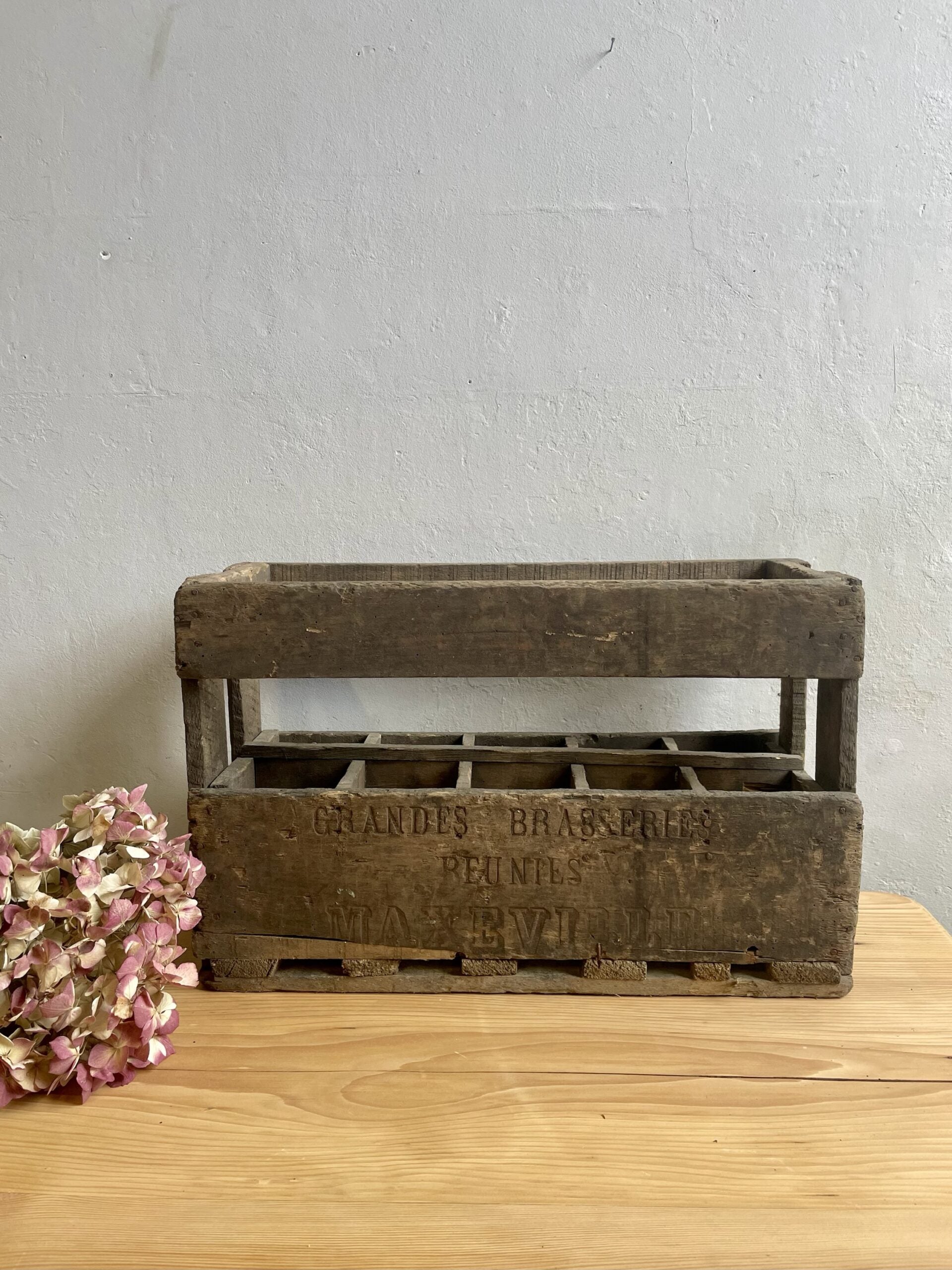 Authentique casier à bouteilles en bois marqué « Grandes Brasseries Réunies Maxeville ».