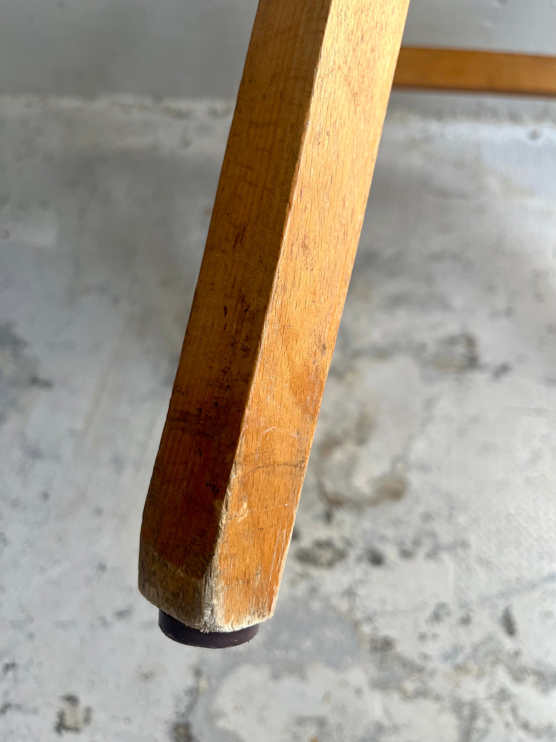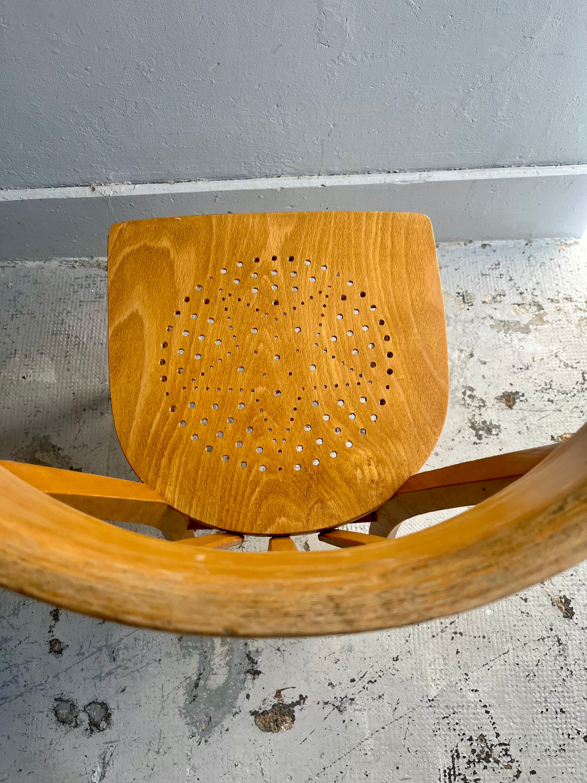 Chaise ancienne en bois avec assise perforée, typique des modèles inspirés des chaises de bistrot revisitées au XXe siècle.