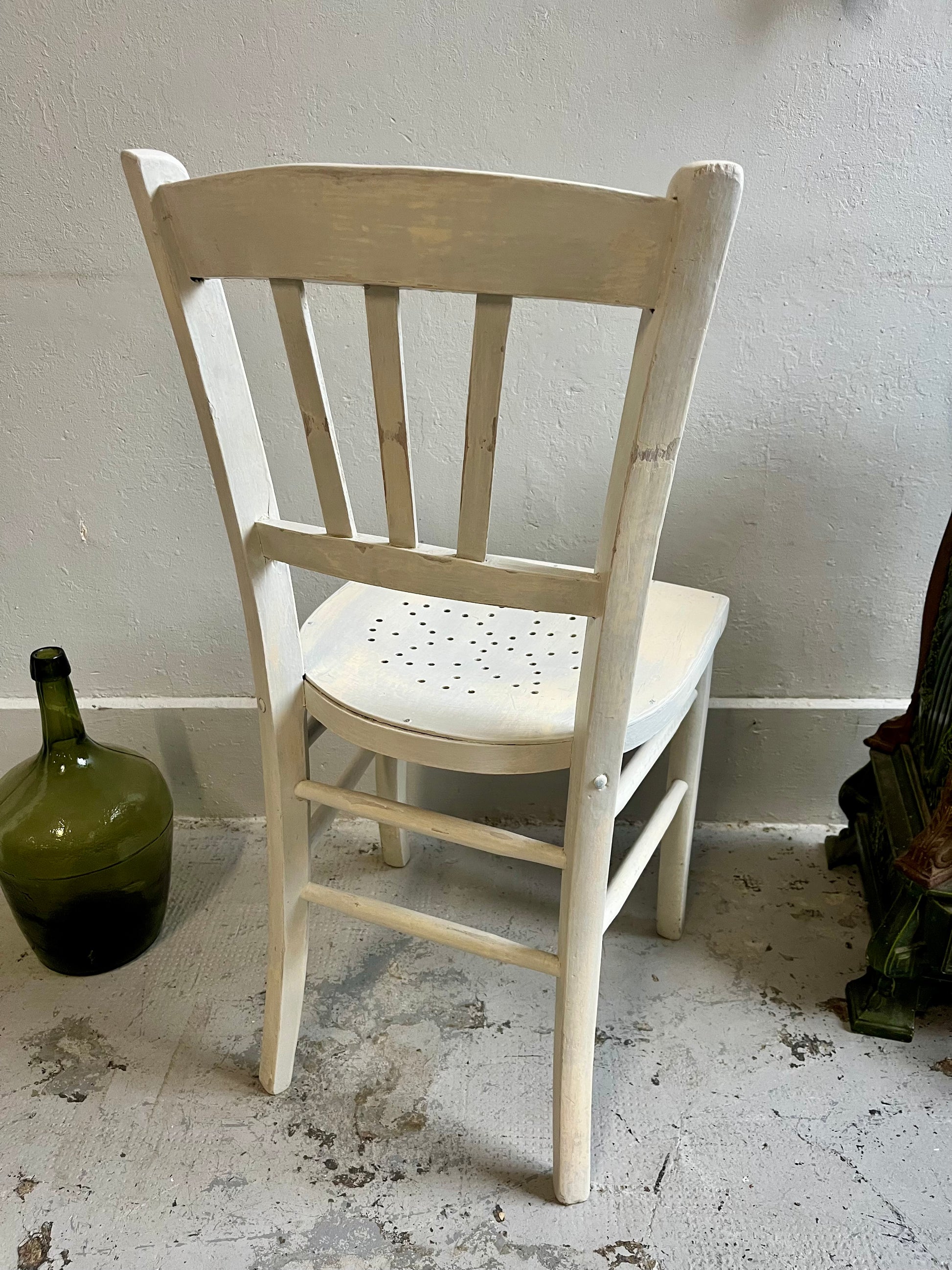 Chaise ancienne en bois patinée blanche, au dossier légèrement galbé et aux lignes simples. Son assise perforée apporte une touche singulière. La patine laisse apparaître par endroits le bois et les anciennes couches, ce qui lui donne du relief et un vrai charme de seconde main.