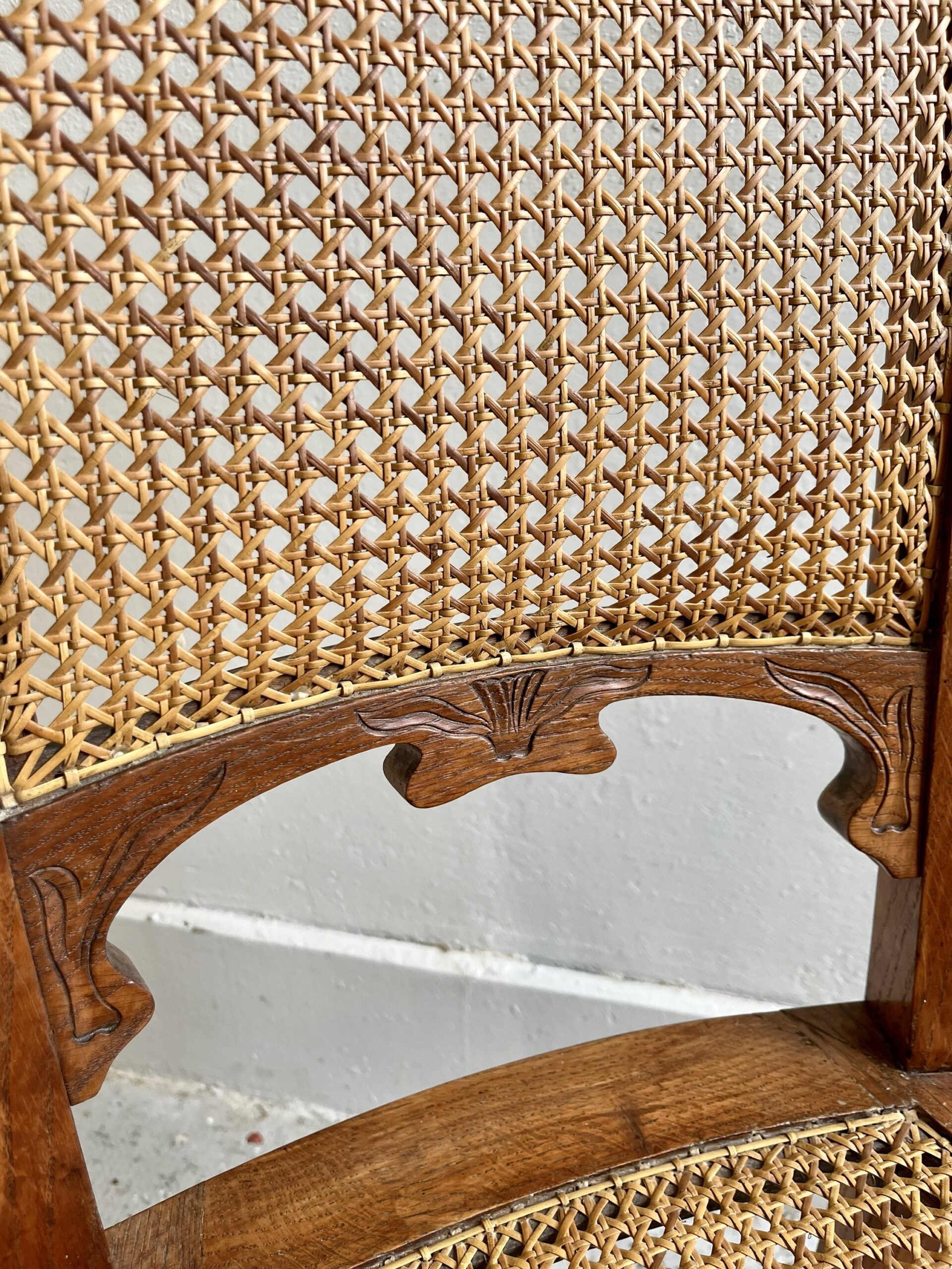 Lot de deux chaises anciennes en bois avec dossier et assise en cannage, nettoyées et laissées dans leur état d’origine. Le bois présente une patine ancienne, avec des traces du temps visibles, cohérentes avec l’âge de ces chaises. Les dossiers sculptés et les pieds tournés donnent à l’ensemble une silhouette typique du mobilier ancien. Un duo de chaises de brocante qui fonctionne aussi bien autour d’une table de salle à manger que dans une chambre ou un bureau, en chaises d’appoint pleines de personnalité.