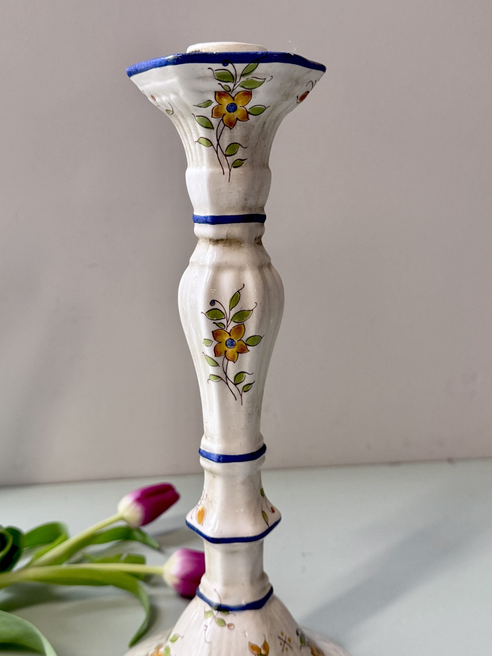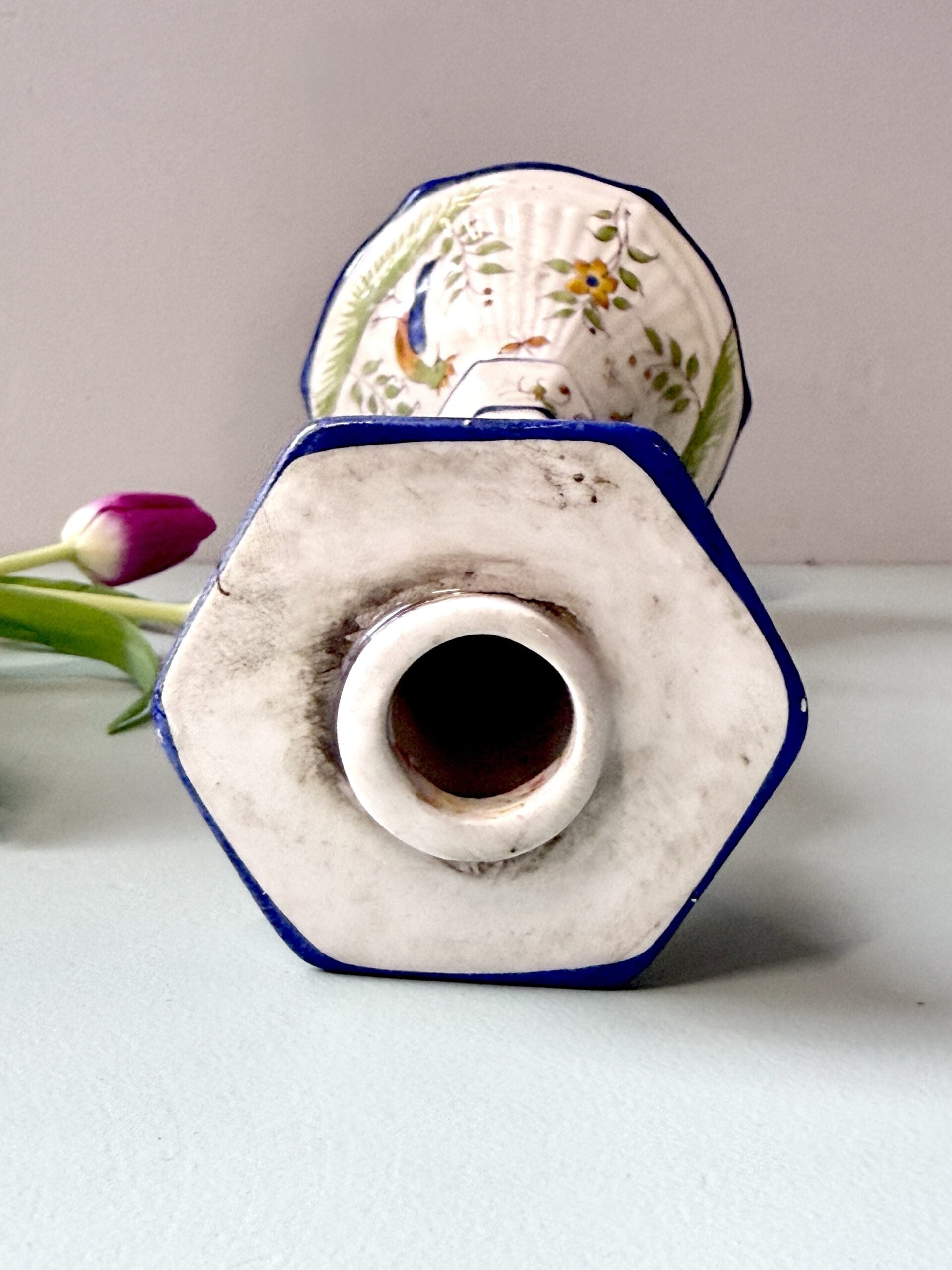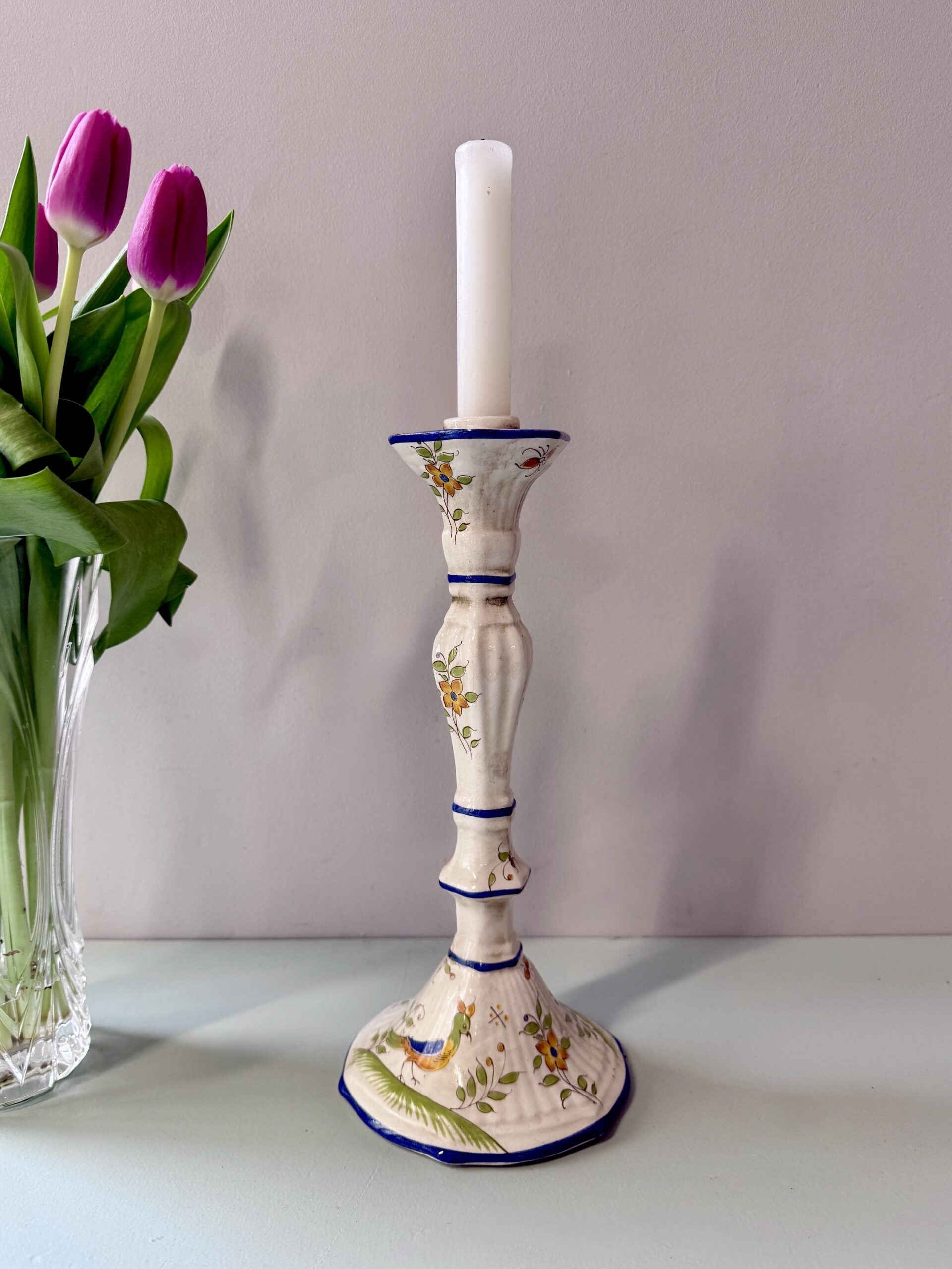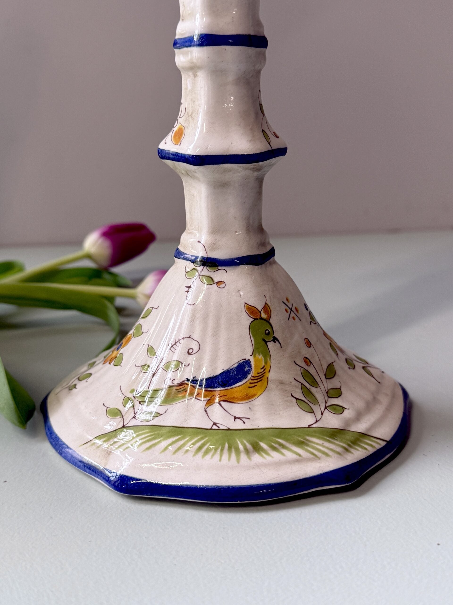 Chandelier ancien en faïence, décoré d’un oiseau stylisé entouré de motifs végétaux. Ce type de décor peint à la main est caractéristique des productions anciennes de vaisselle et d’objets décoratifs populaires, souvent réalisées dans l’Est de la France ou dans des ateliers régionaux.La faïence présente une patine ancienne bien marquée, avec des noircissements liés à l’usage des bougies et des traces du temps visibles. Le décor montre de légères irrégularités, normales pour une pièce ancienne, qui racontent son histoire et son vécu. Un bel objet de décoration ancienne, à poser seul ou à intégrer dans une mise en scène plus large sur une table, une étagère ou une cheminée.