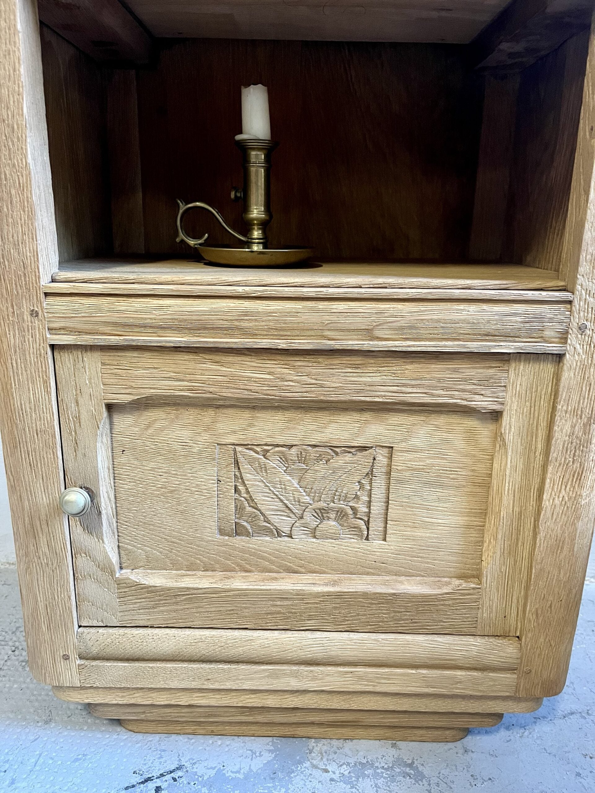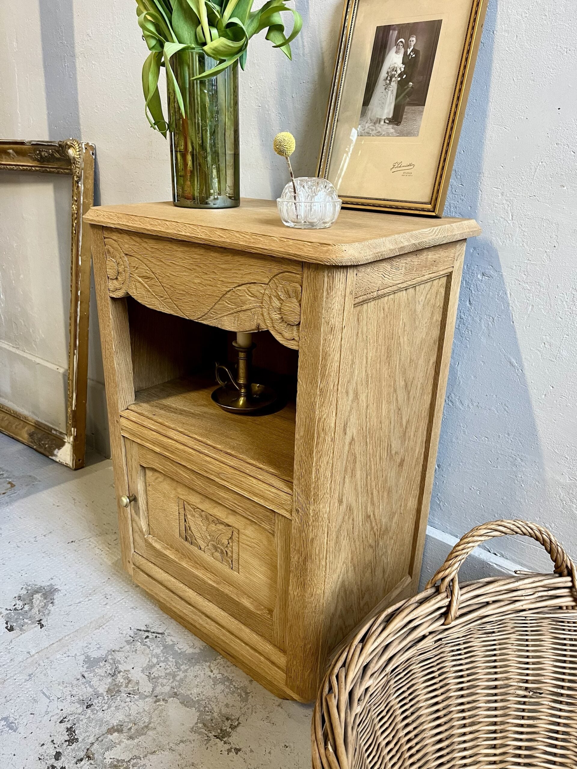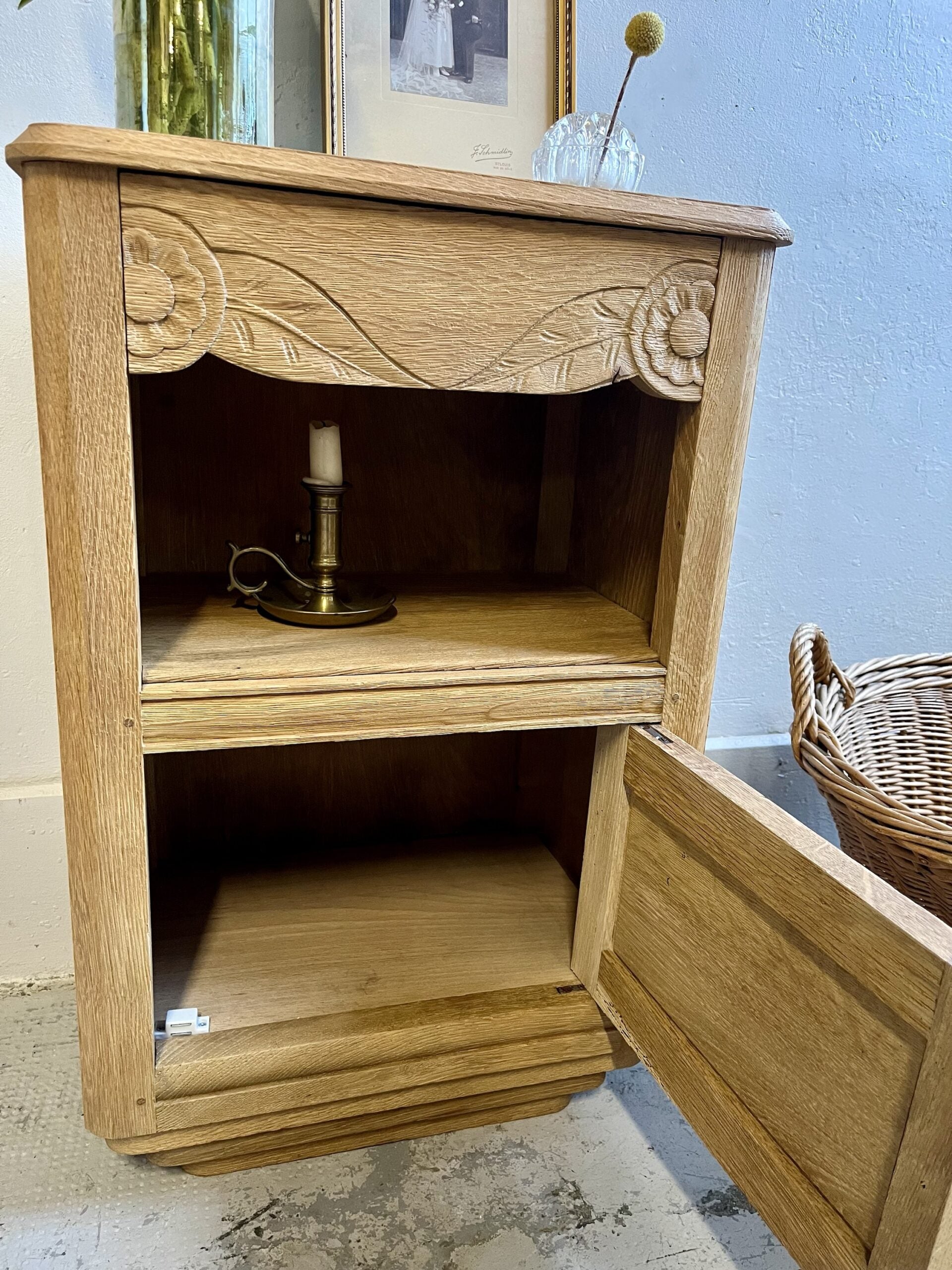 Chevet art déco ancien au dessin bien marqué, avec ses motifs sculptés typiques de l’époque et ses lignes franches. Le meuble a été entièrement aérogommé afin de retirer les anciennes finitions et laisser apparaître le bois dans une teinte naturelle et chaleureuse, puis protégé par un vernis mat incolore.Son format pratique combine un tiroir, une niche ouverte et un espace fermé, idéal en table de nuit, petit meuble d’appoint ou bout de canapé. Une pièce ancienne pleine de personnalité, facile à intégrer dans une décoration actuelle, mixée avec des objets chinés ou plus contemporains.