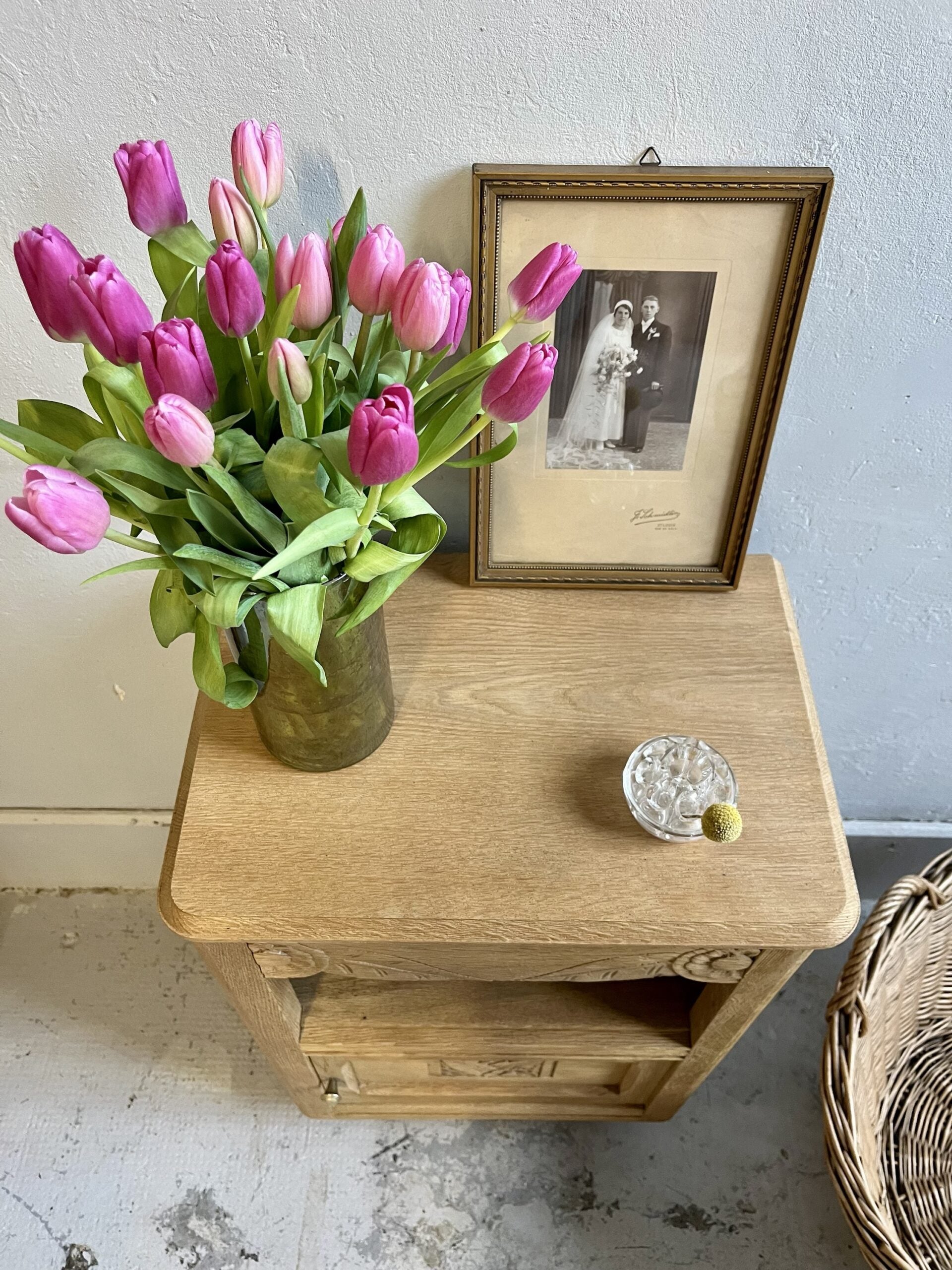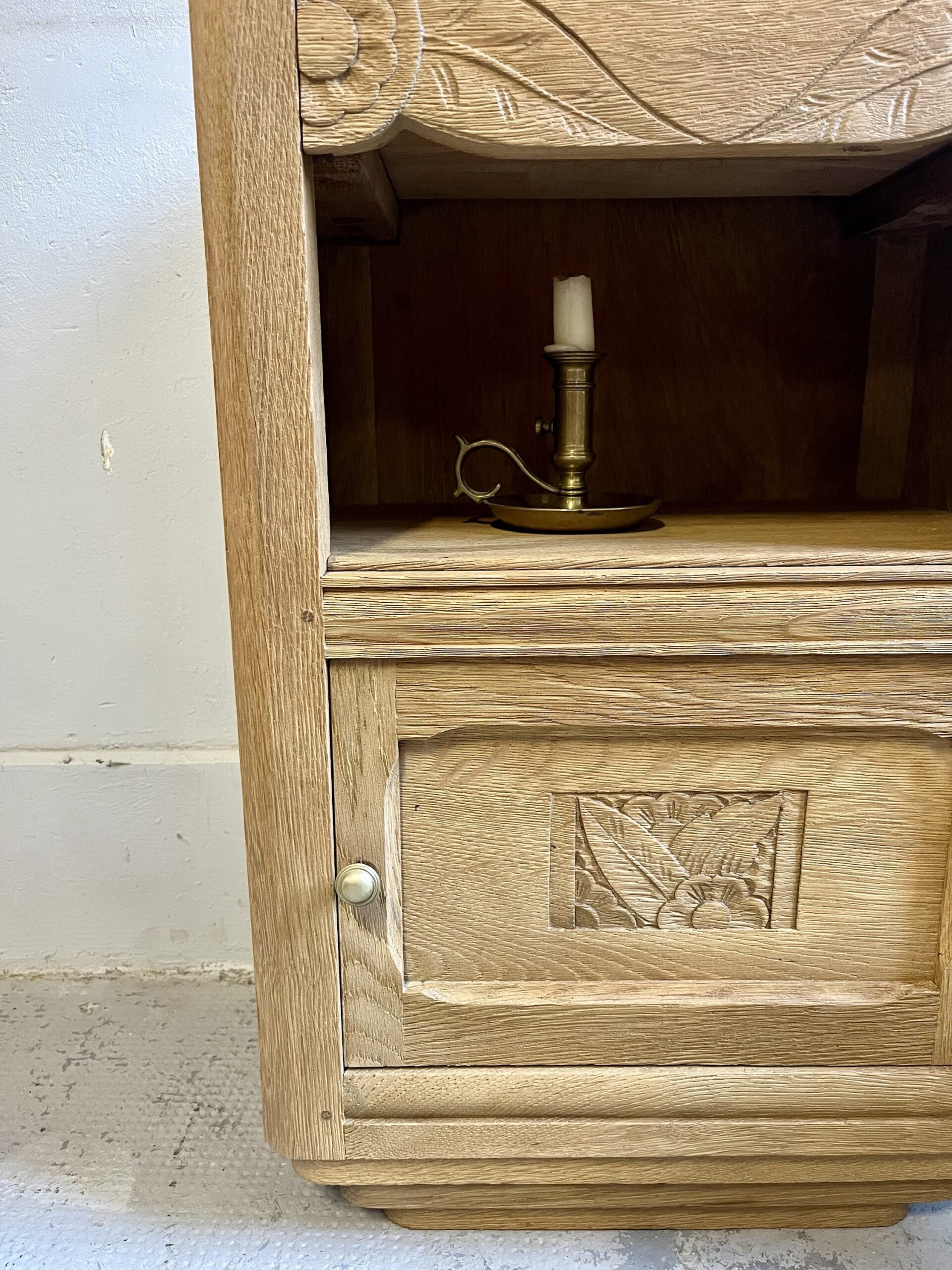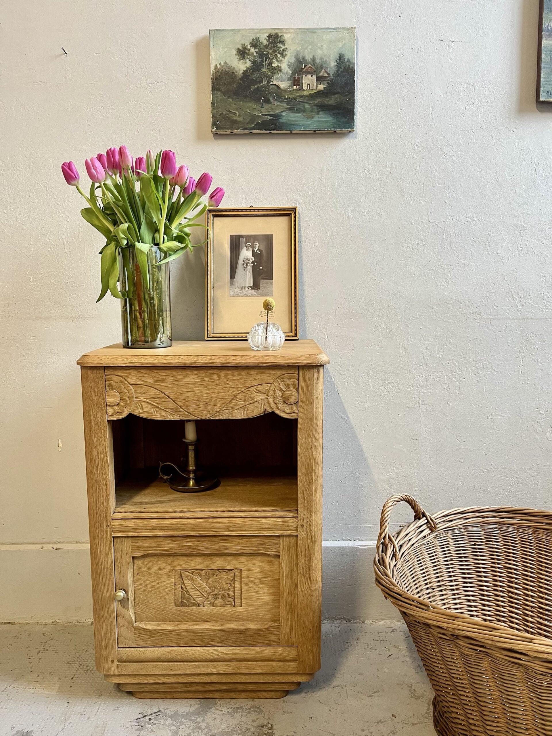 Chevet art déco ancien au dessin bien marqué, avec ses motifs sculptés typiques de l’époque et ses lignes franches. Le meuble a été entièrement aérogommé afin de retirer les anciennes finitions et laisser apparaître le bois dans une teinte naturelle et chaleureuse, puis protégé par un vernis mat incolore.Son format pratique combine un tiroir, une niche ouverte et un espace fermé, idéal en table de nuit, petit meuble d’appoint ou bout de canapé. Une pièce ancienne pleine de personnalité, facile à intégrer dans une décoration actuelle, mixée avec des objets chinés ou plus contemporains.