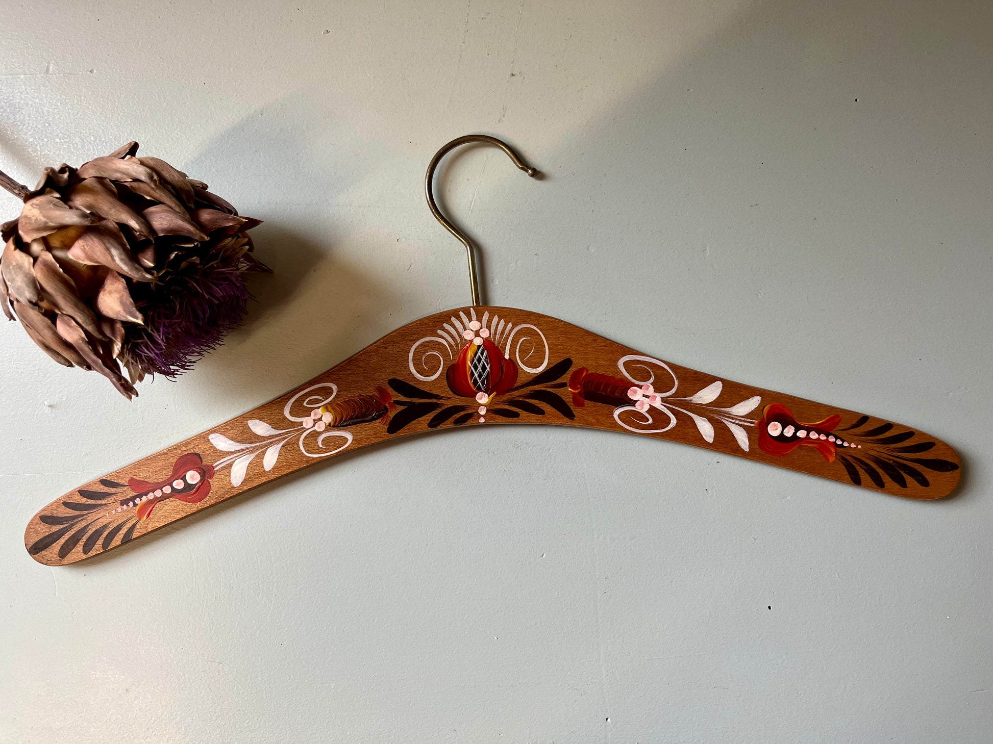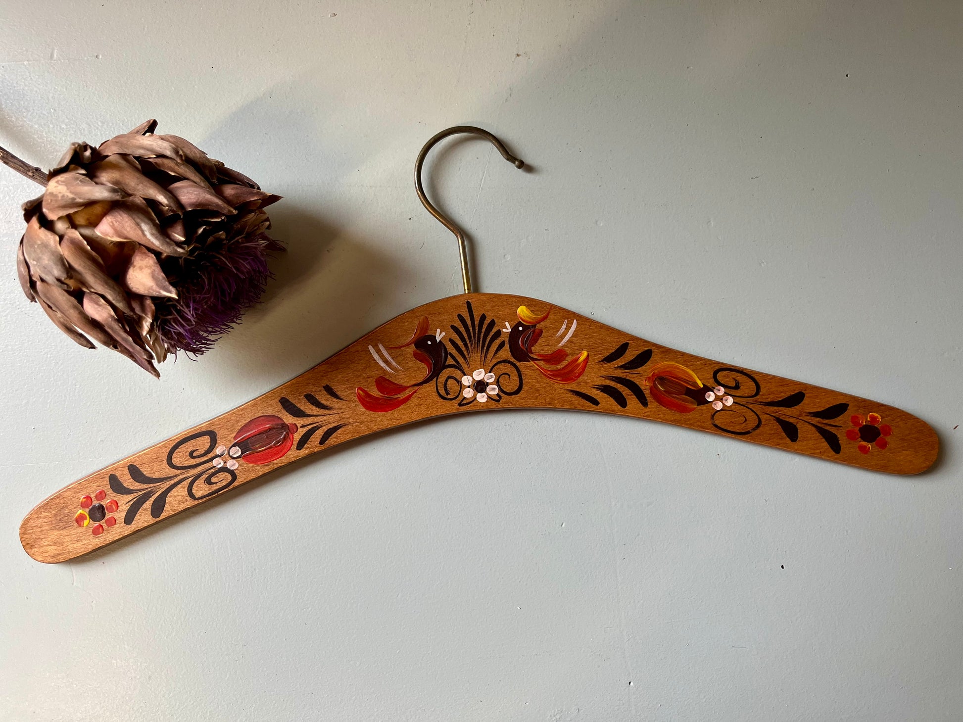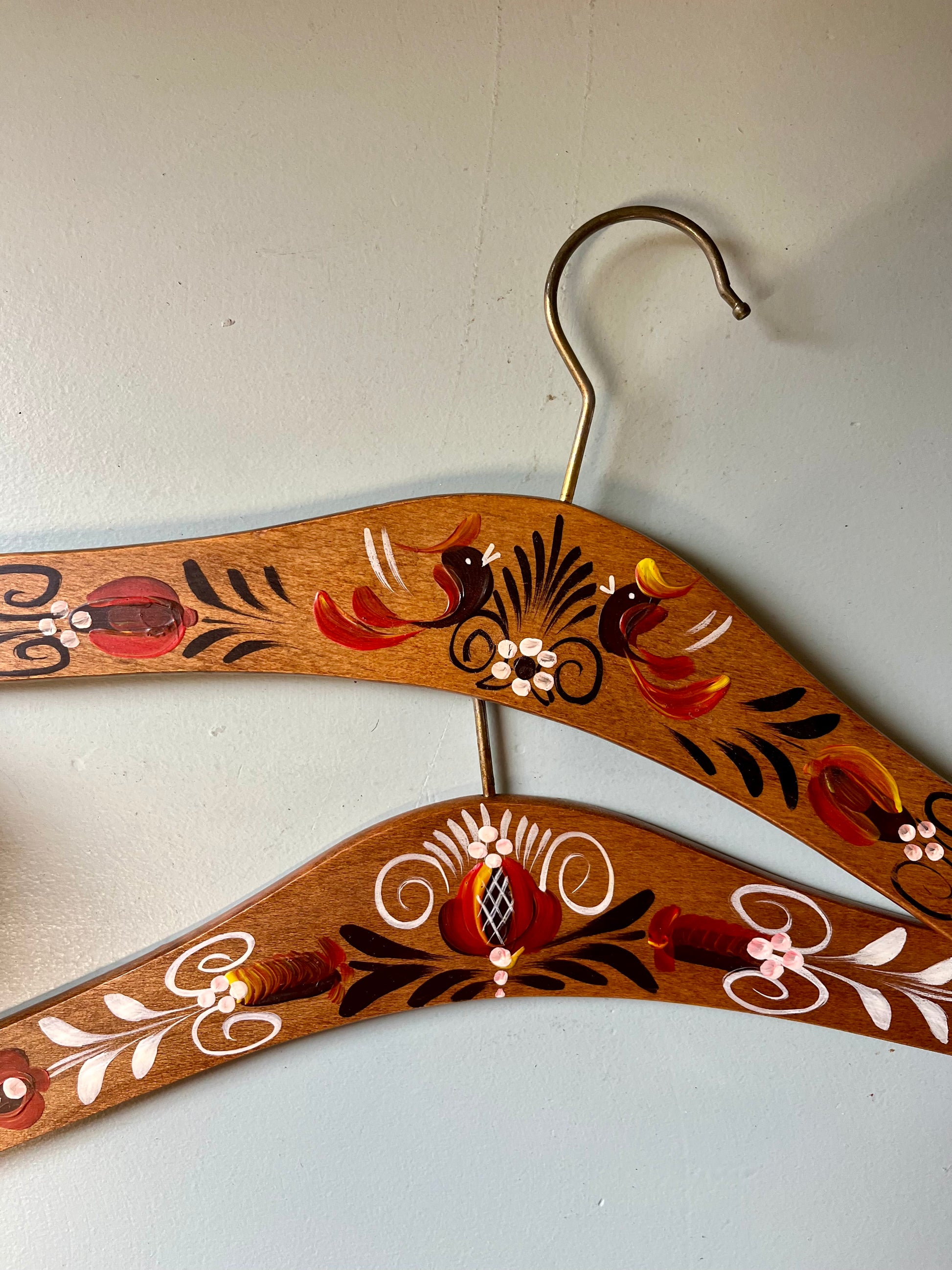 Lot de 2 cintres anciens en bois avec décor peint à la main, aux motifs floraux et oiseaux dans des tons rouge, blanc, noir et jaune. Chaque pièce est légèrement différente, ce qui renforce leur charme et leur authenticité.