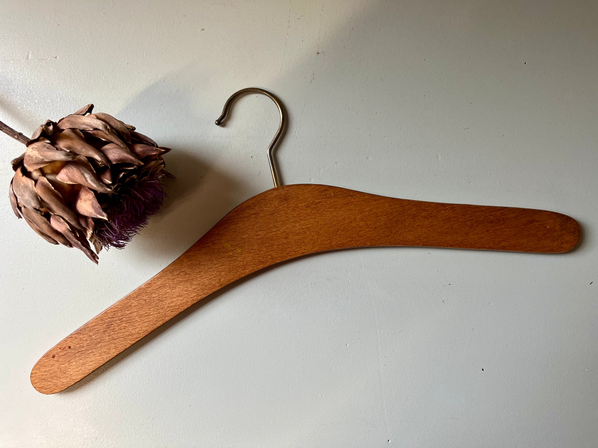 Le bois présente une belle teinte chaude et naturelle, et les crochets en métal ont une patine discrète liée au temps. Quelques traces d’usage légères, cohérentes avec leur âge.